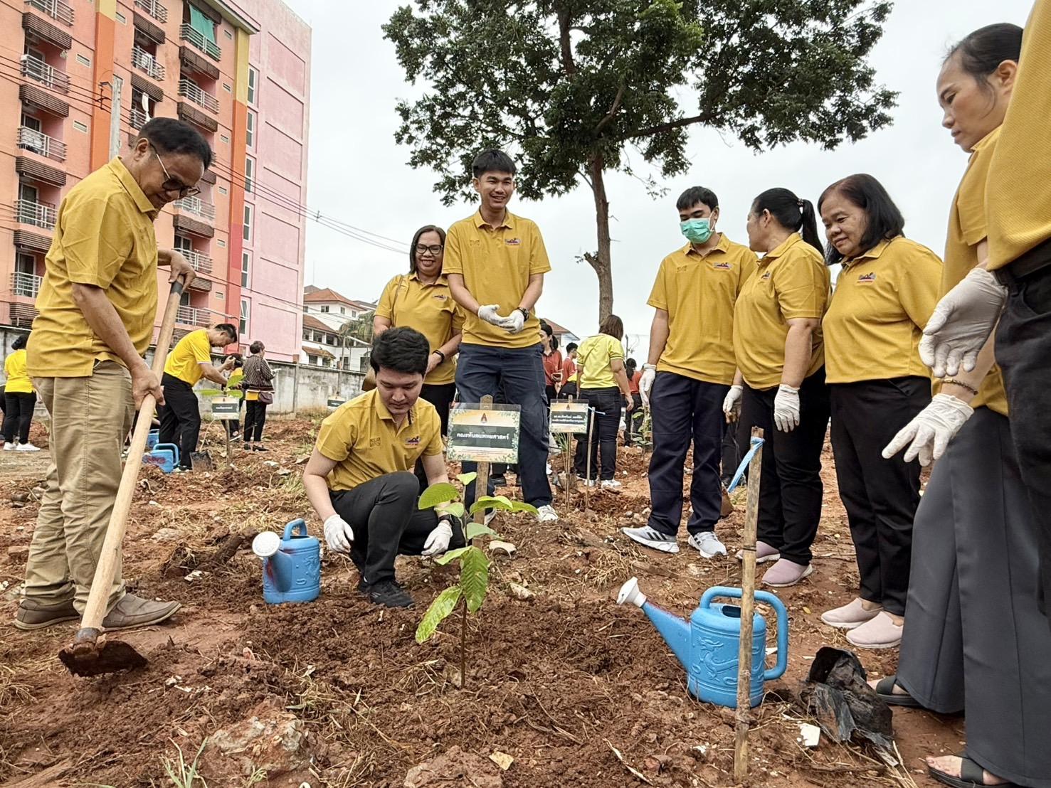 On 14 August 2025 at 9:00 a.m., the Division of Physical and Environmental Management, in collaboration with the Division of Utilities and Environment, organized a tree planting activity in celebration of the 73rd birthday anniversary of His Majesty King Maha Vajiralongkorn Phra Vajiraklaochaoyuhua (King Rama X), on 28 July 2025. The event took place on the grounds opposite the Khon Kaen University Cooperative, next to the Wor Inter Dormitory.