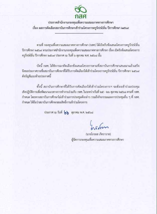 The “Kru Rak Thin” Program aims to identify and support students from underprivileged backgrounds to pursue teacher education at leading teacher-training institutions. The program is designed to cultivate professional competence, ethics, and a strong teaching ideology among student teachers — empowering them to return to their hometowns and contribute to improving local education. This initiative plays a crucial role in reducing educational inequality and creating a new generation of teachers who serve as driving forces in enhancing quality of life and sustainable community development.