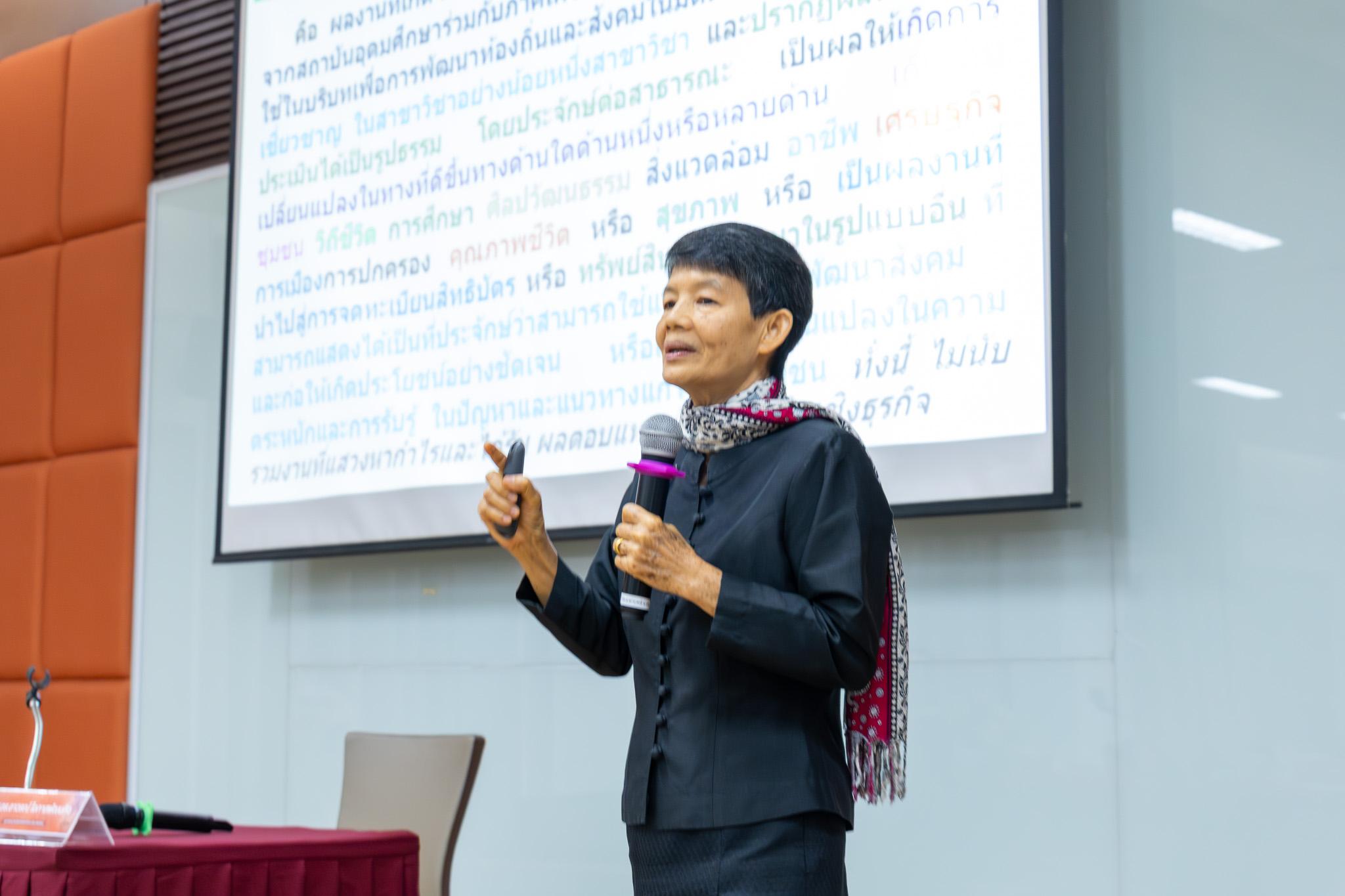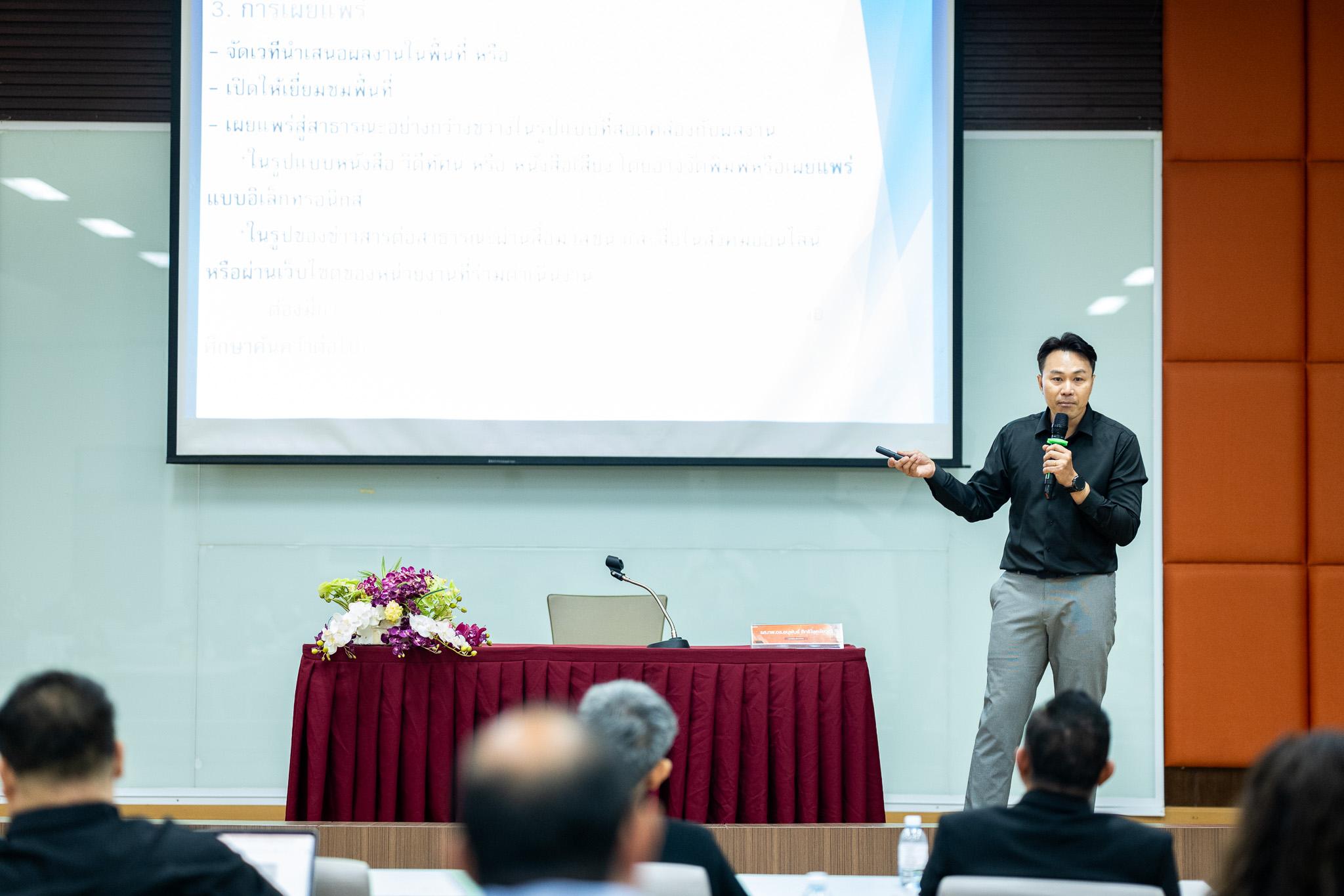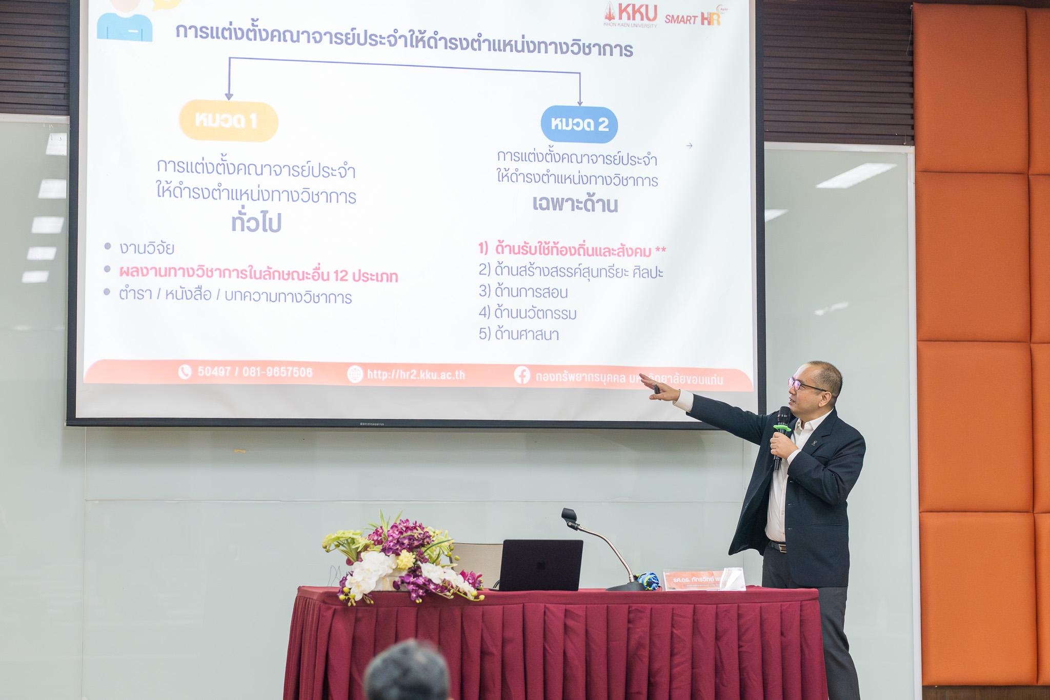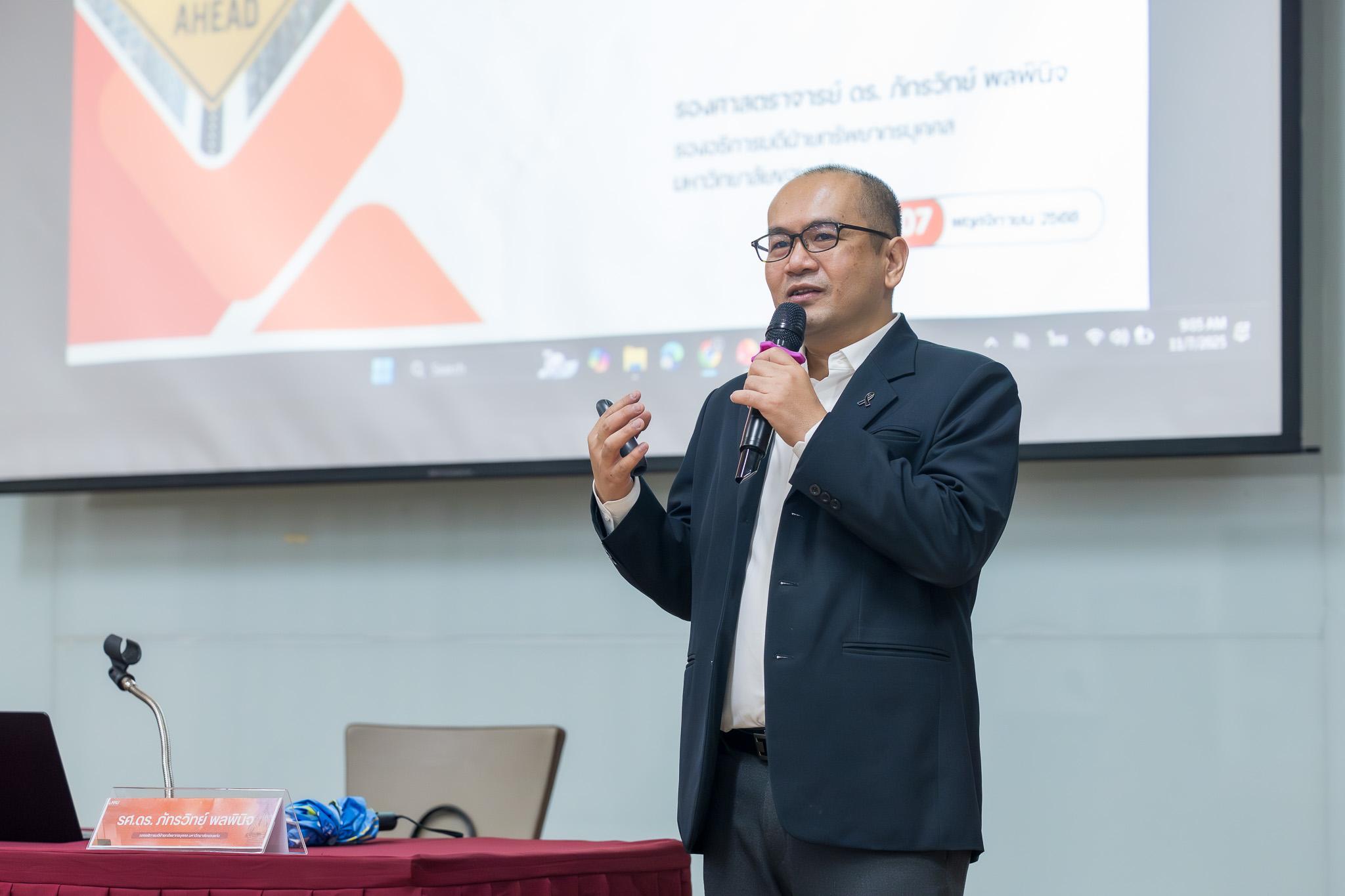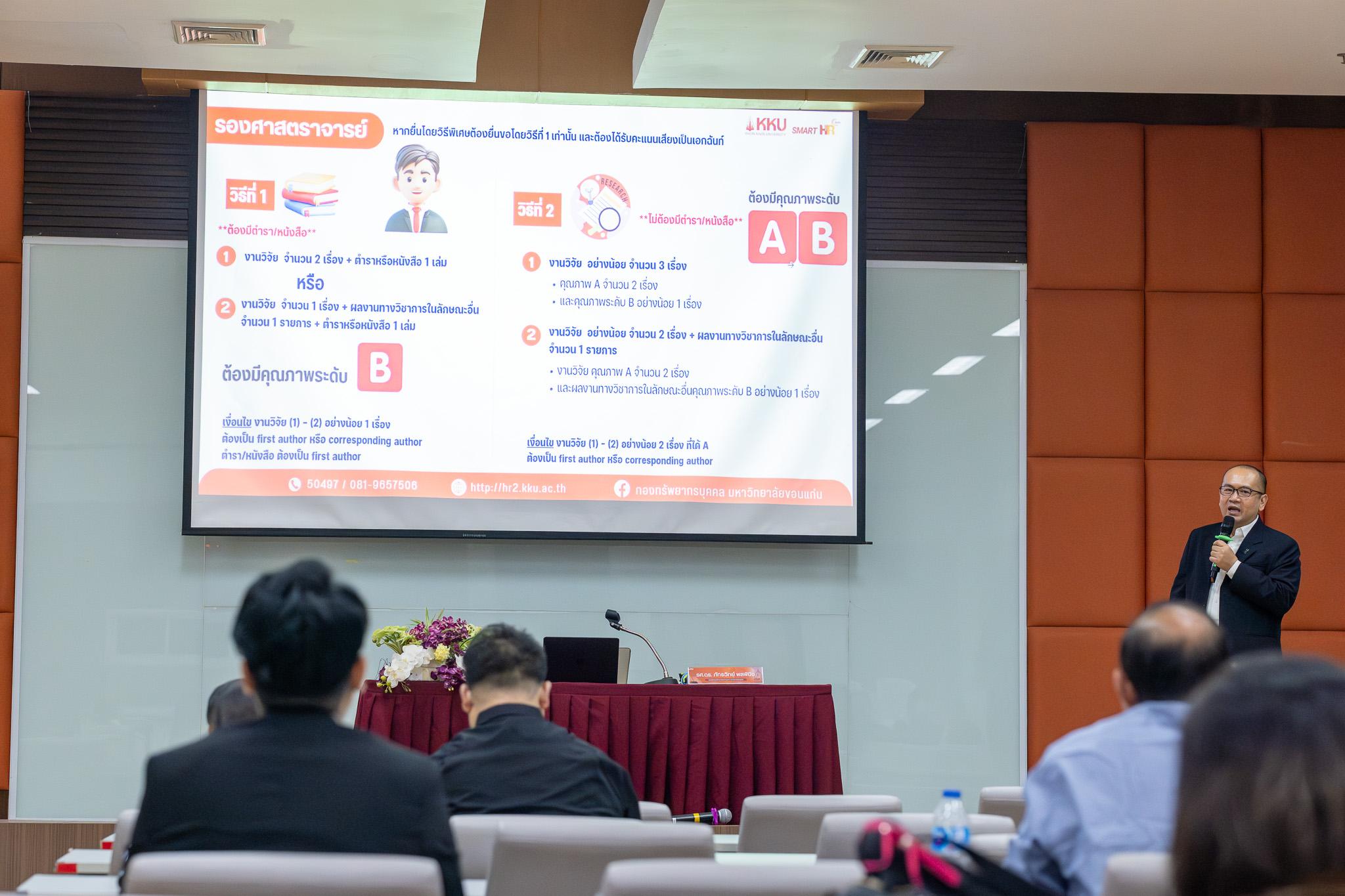 The training provided comprehensive details on the new pathway. Associate Professor Dr. Patrawit Polpinit, Vice President for Human Resources, clarified the official regulations from the Office of the Higher Education Commission (OHEC) regarding the use of social service work for promotion to the ranks of Assistant Professor, Associate Professor, and Professor.