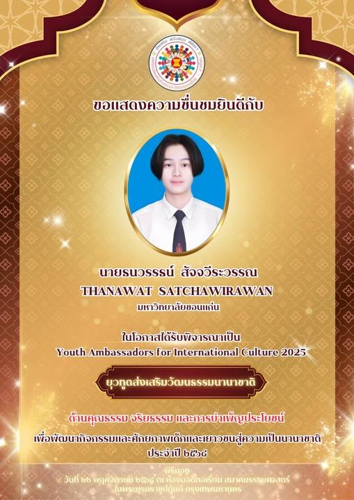 8 November 2025 — The Multidisciplinary College, Khon Kaen University, wishes to express its sincere congratulations and deep pride in the achievement of Mr. Thanawat Satchawirawan, a student from the International Economics, Innovation, and Sustainability Programme. Mr. Satchawirawan has been selected as a recipient of the prestigious Youth Ambassadors for International Culture 2025 award.
