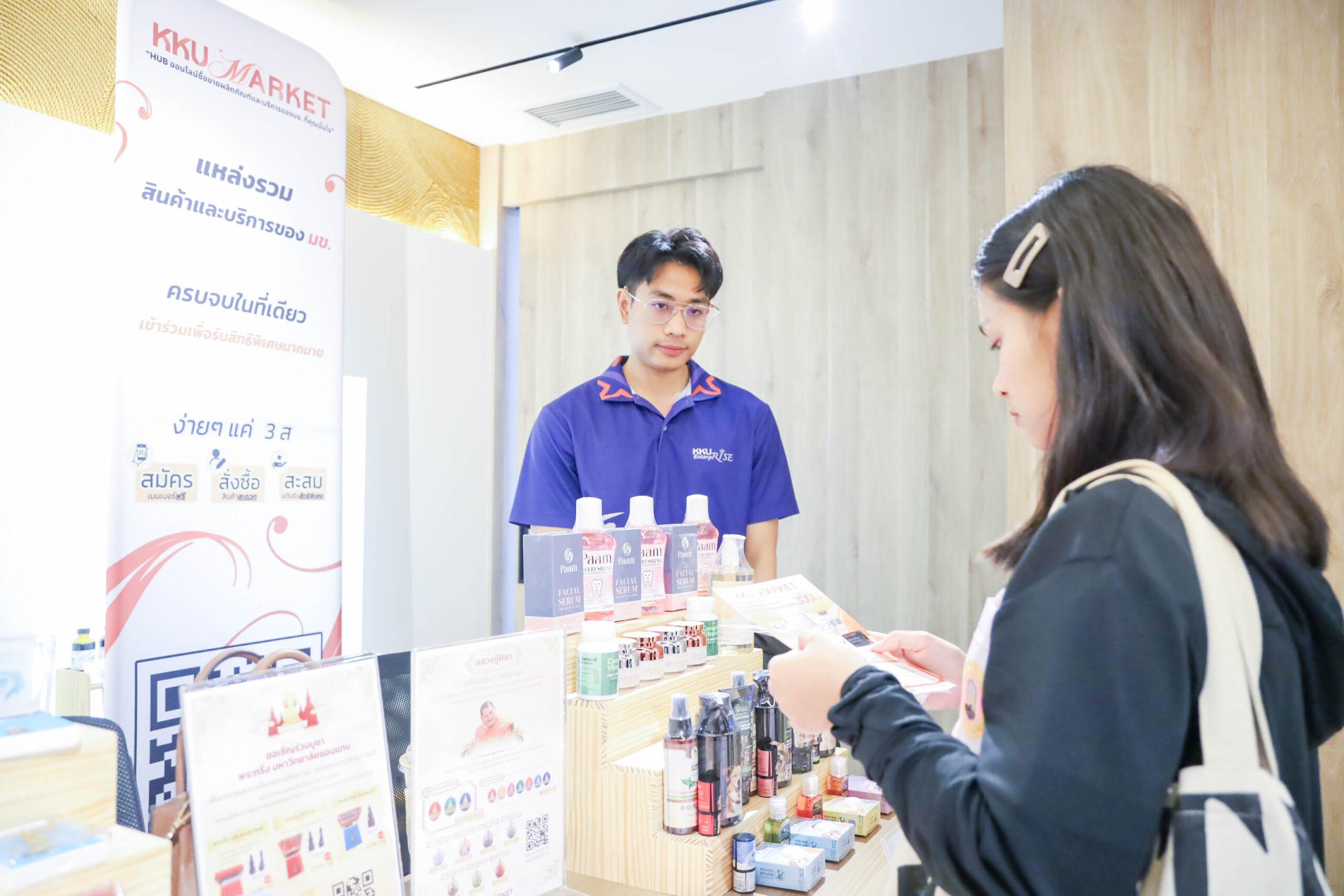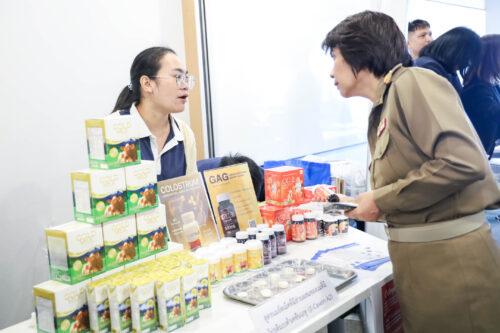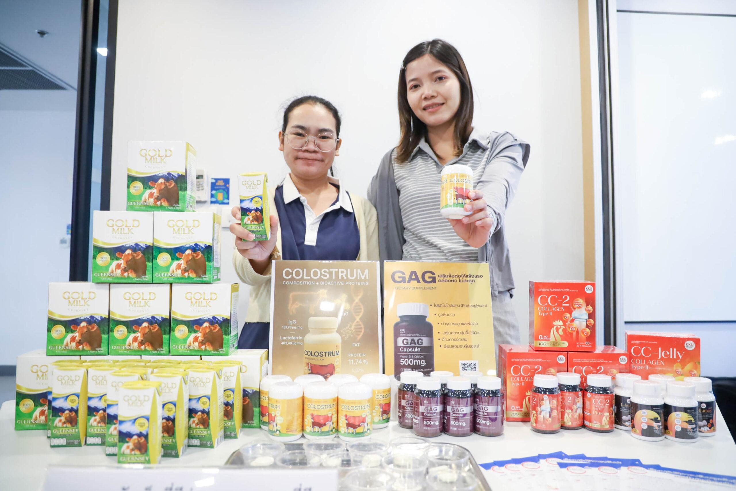 The atmosphere was vibrant, featuring presentations from nine KKU researchers who intensively shared their knowledge and innovations in medical and food technology. The showcased products included: an alpha-thalassemia 1 gene detection kit using the Polymerase Chain Reaction (PCR) technique on amniotic fluid and blood samples; a Gnathostoma spinigerum larva test kit detectable in both serum and via a finger-prick blood sample; corn soup/germinated black sticky rice milk powder formula/healthy porridge for perimenopausal and elderly individuals; ginger extract and mulberry extract capsules, and a ready-to-brew mung bean drink formula.