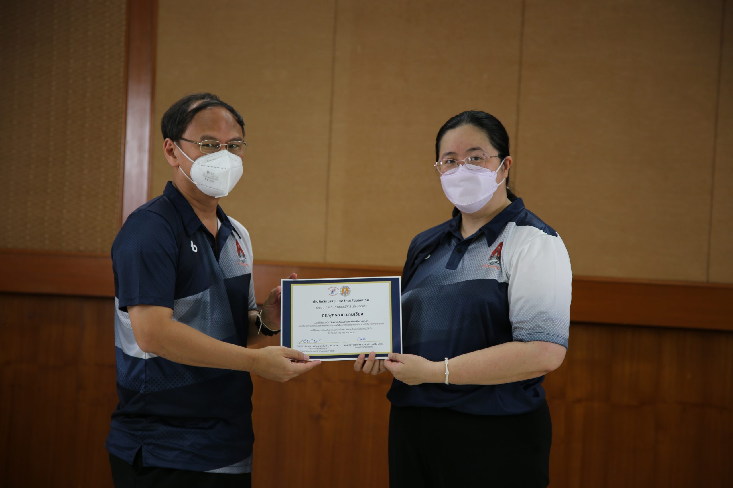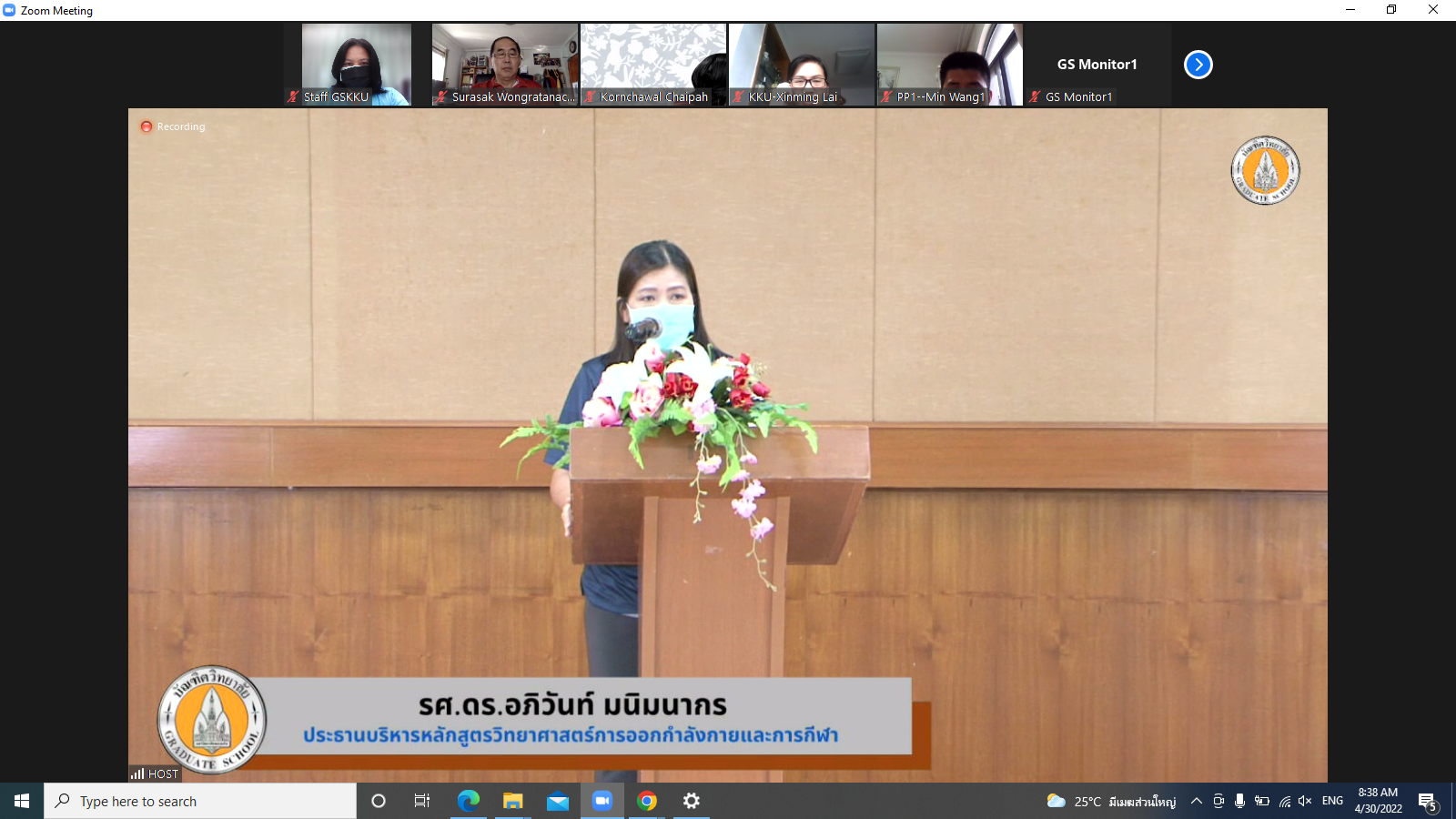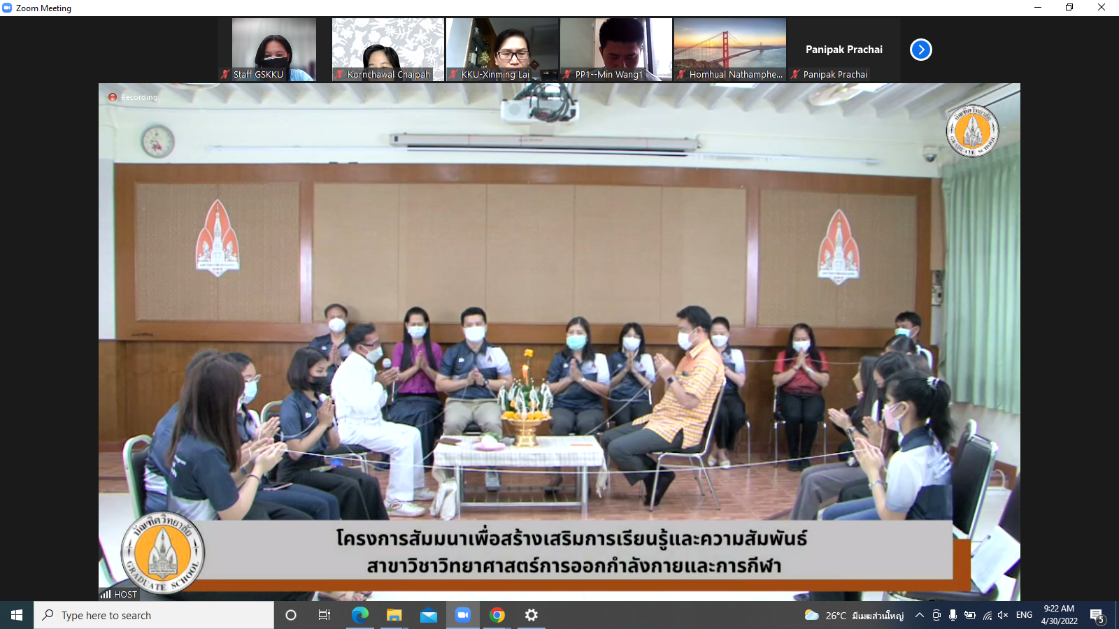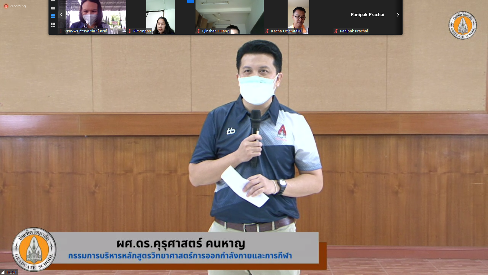 สาขาวิชาวิทยาศาสตร์การออกกำลังกายและการกีฬา สาขาวิชาร่วม บัณฑิตวิทยาลัยจัดโครงการสัมมนาเพื่อสร้างเสริมการเรียนรู้และความสัมพันธ์ ประจำปี 2565 รูปแบบไฮบริด (online และ on-site) วันเสาร์ที่ 30 เมษายน 2565 เวลา 8.00 – 16.00 น. ณ อาคารพิมล กลกิจ และผ่านระบบออนไลน์โดยใช้โปรแกรม Zoom รศ.ดร.อภิวันท์ มนิมนากร ประธานบริหารหลักสูตรวิทยาศาสตร์การออกกำลังกายและการกีฬา กล่าวต้อนรับและให้โอวาท จากนั้นผู้บริหารบัณฑิตวิทยาลัยกล่าวต้อนรับนักศึกษาและผู้เข้าร่วมกิจกรรม โดย ศ.ดร.สุรศักดิ์ วงศ์รัตนชีวิน คณบดีบัณฑิตวิทยาลัย รศ.ดร.พงศกร พรรณรัตนศิลป์ รองคณบดีฝ่ายบริหาร วางแผนและพัฒนาคุณภาพ และ ผศ.ดร. กรชวัล ชายผา ผู้ช่วยคณบดีฝ่ายสารสนเทศ จากนั้นเป็นพิธีบายศรีสู่ขวัญ การมอบเกียรติบัตรแก่นักศึกษาและผู้สร้างชื่อเสียงให้แก่หลักสูตร