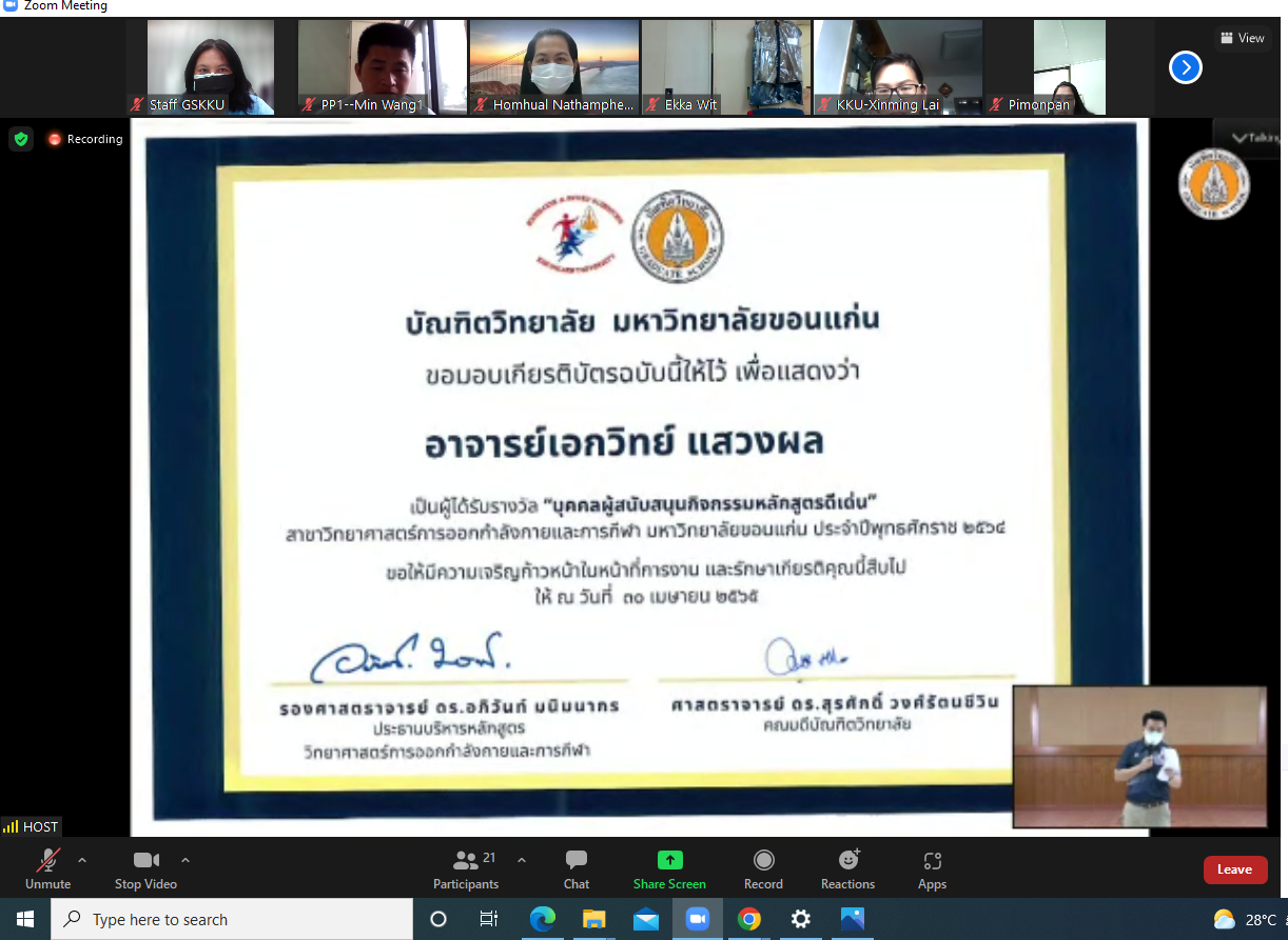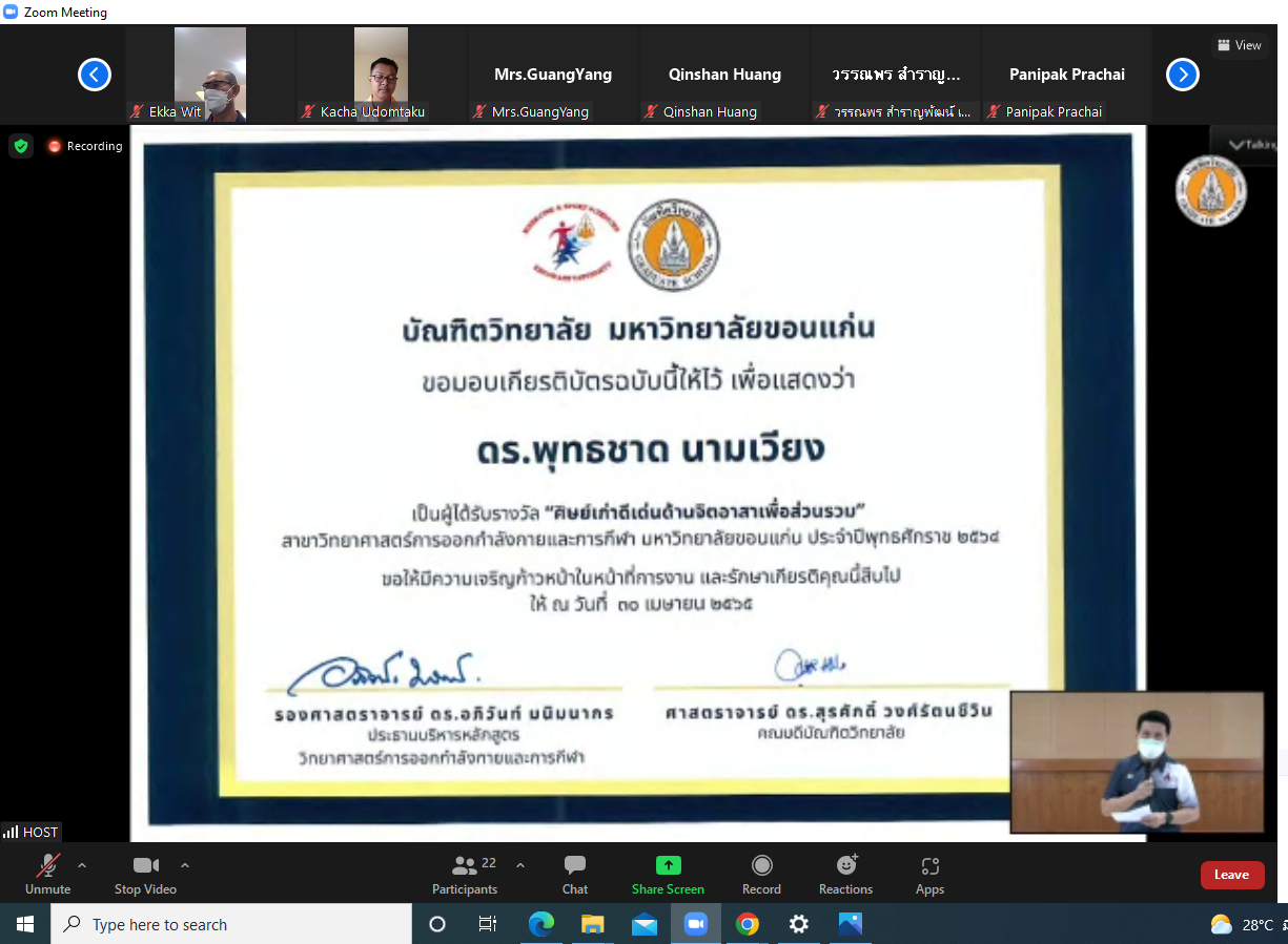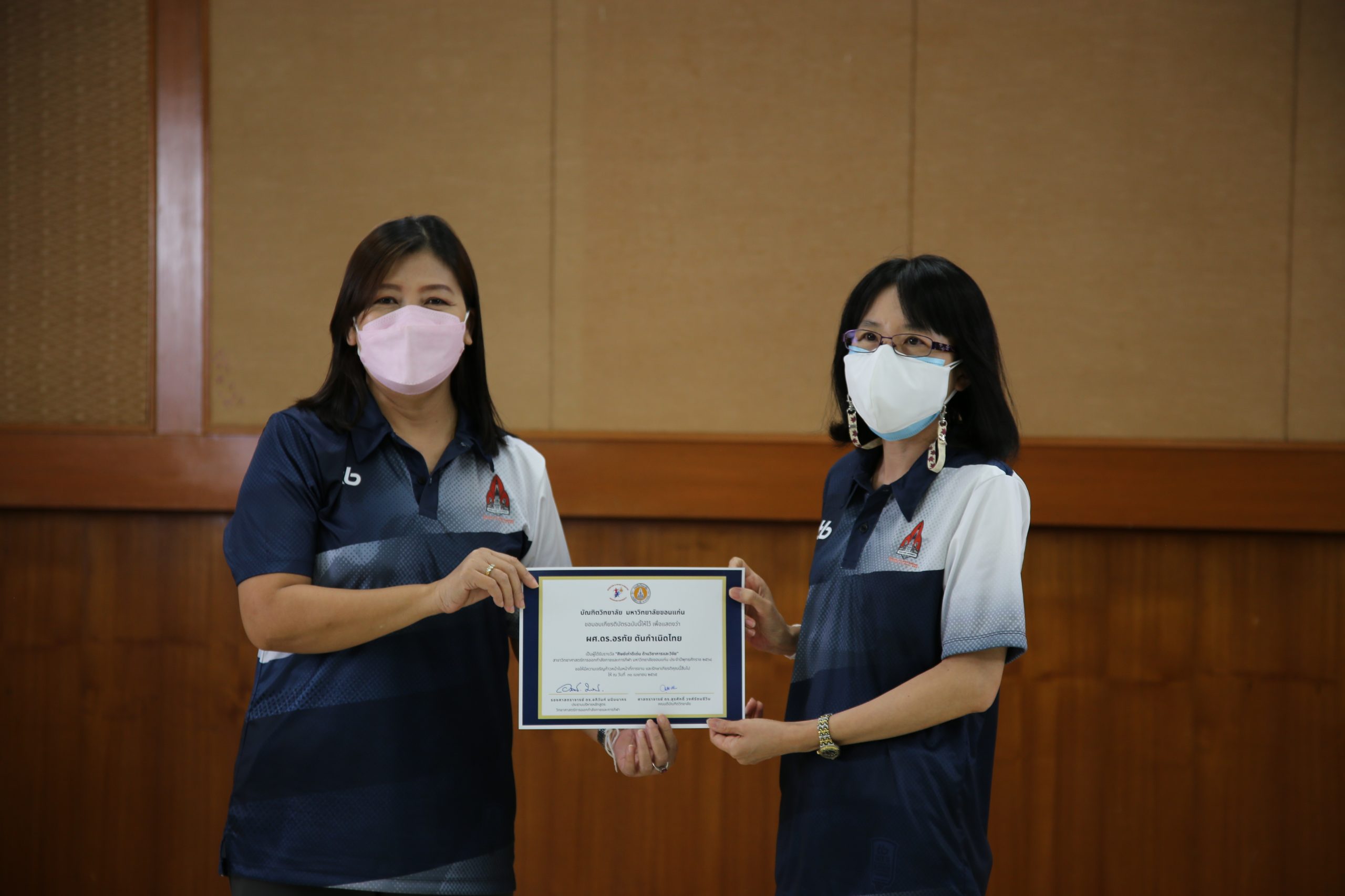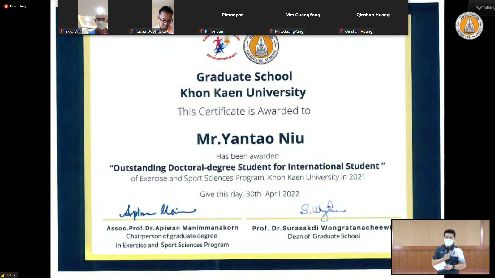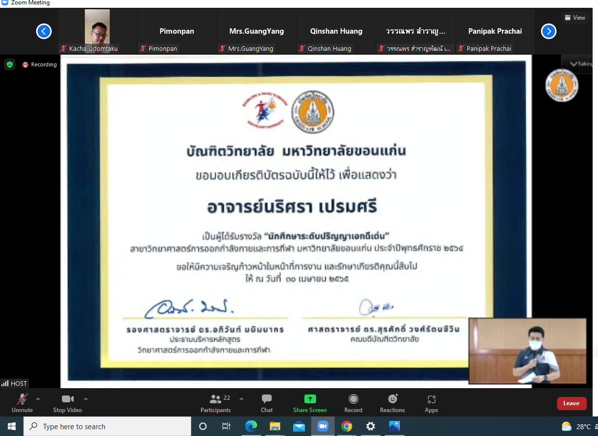 สาขาวิชาวิทยาศาสตร์การออกกำลังกายและการกีฬา สาขาวิชาร่วม บัณฑิตวิทยาลัยจัดโครงการสัมมนาเพื่อสร้างเสริมการเรียนรู้และความสัมพันธ์ ประจำปี 2565 รูปแบบไฮบริด (online และ on-site) วันเสาร์ที่ 30 เมษายน 2565 เวลา 8.00 – 16.00 น. ณ อาคารพิมล กลกิจ และผ่านระบบออนไลน์โดยใช้โปรแกรม Zoom รศ.ดร.อภิวันท์ มนิมนากร ประธานบริหารหลักสูตรวิทยาศาสตร์การออกกำลังกายและการกีฬา กล่าวต้อนรับและให้โอวาท จากนั้นผู้บริหารบัณฑิตวิทยาลัยกล่าวต้อนรับนักศึกษาและผู้เข้าร่วมกิจกรรม โดย ศ.ดร.สุรศักดิ์ วงศ์รัตนชีวิน คณบดีบัณฑิตวิทยาลัย รศ.ดร.พงศกร พรรณรัตนศิลป์ รองคณบดีฝ่ายบริหาร วางแผนและพัฒนาคุณภาพ และ ผศ.ดร. กรชวัล ชายผา ผู้ช่วยคณบดีฝ่ายสารสนเทศ จากนั้นเป็นพิธีบายศรีสู่ขวัญ การมอบเกียรติบัตรแก่นักศึกษาและผู้สร้างชื่อเสียงให้แก่หลักสูตร