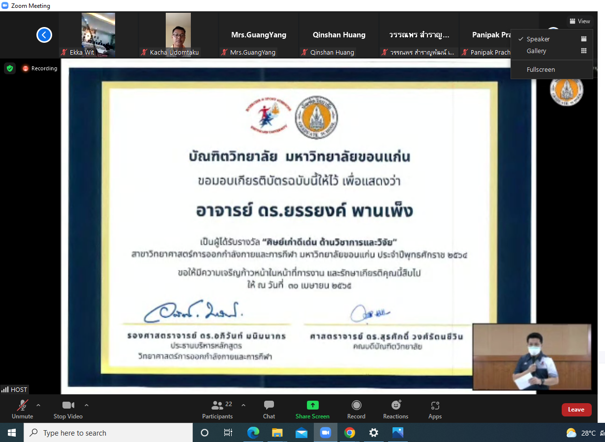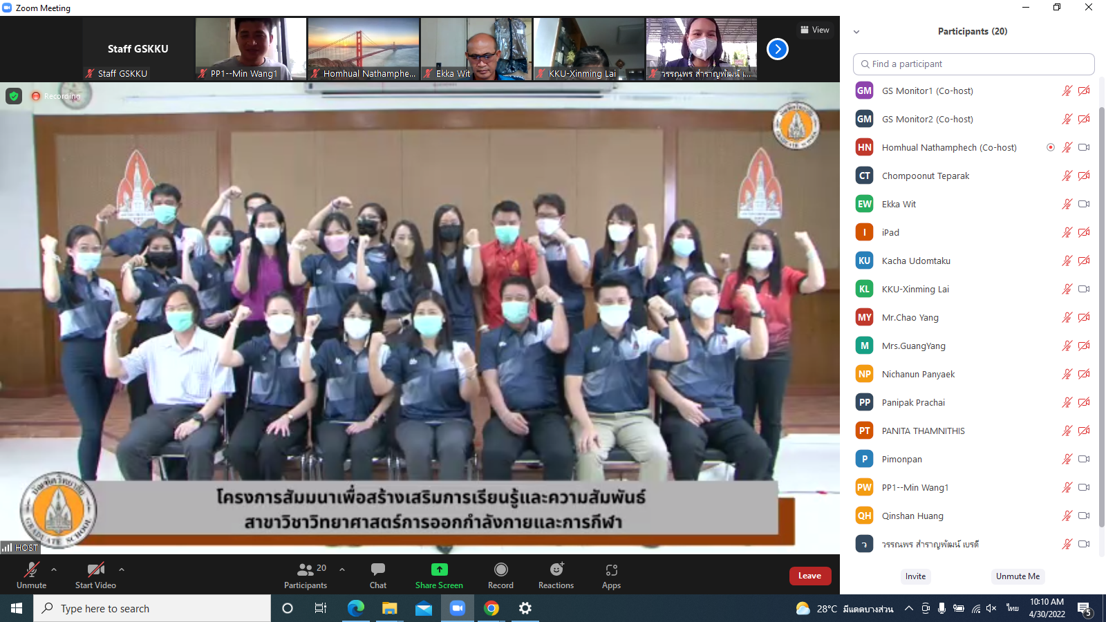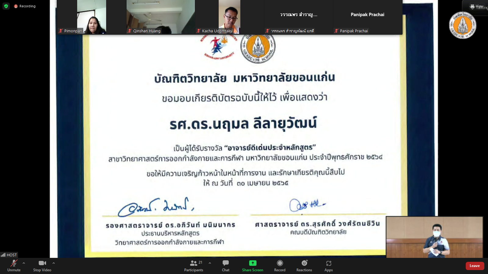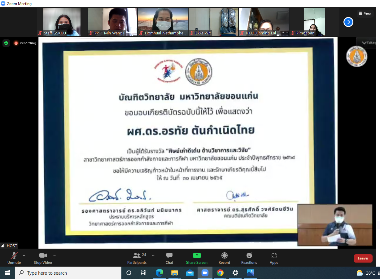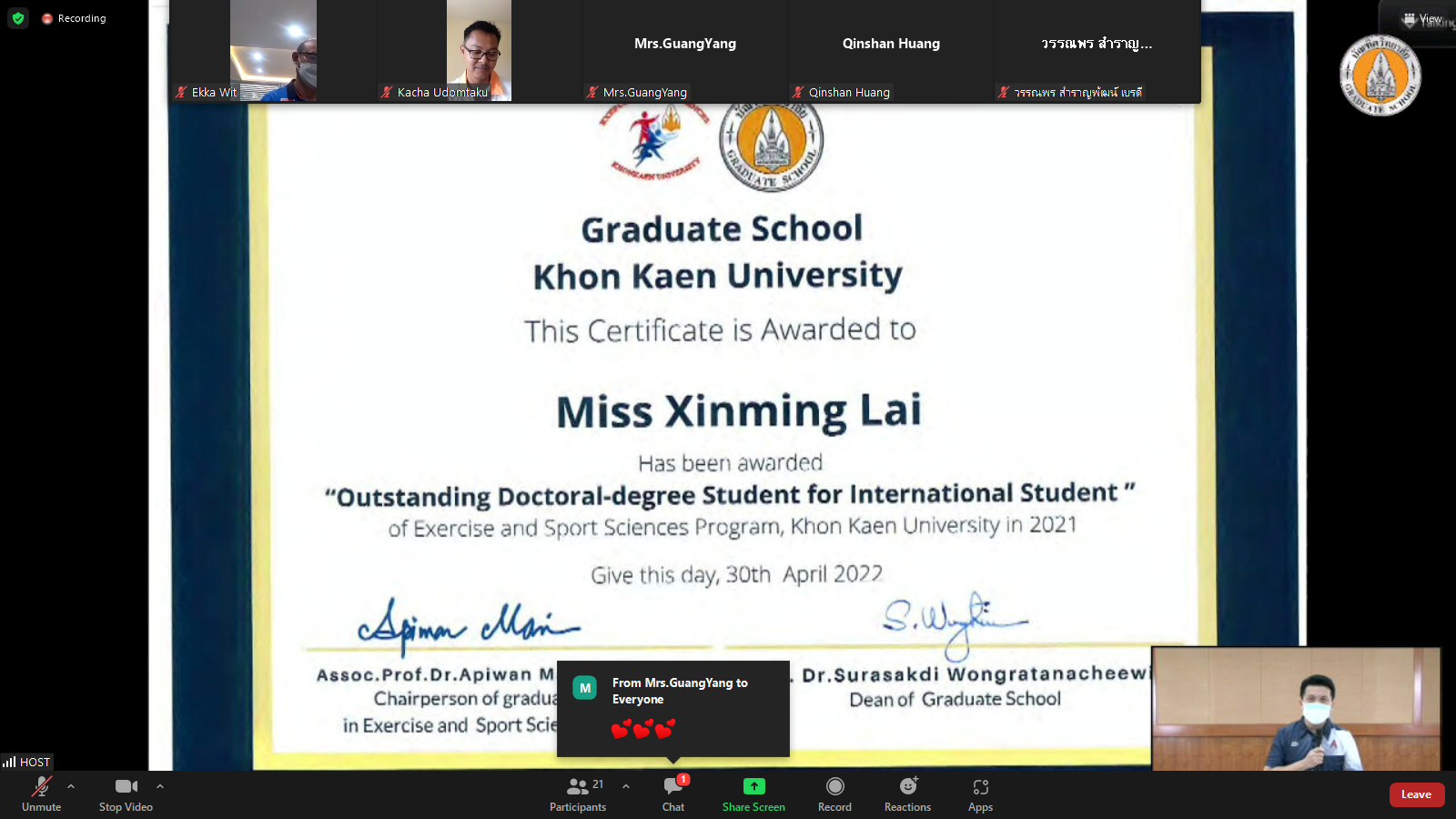 สาขาวิชาวิทยาศาสตร์การออกกำลังกายและการกีฬา สาขาวิชาร่วม บัณฑิตวิทยาลัยจัดโครงการสัมมนาเพื่อสร้างเสริมการเรียนรู้และความสัมพันธ์ ประจำปี 2565 รูปแบบไฮบริด (online และ on-site) วันเสาร์ที่ 30 เมษายน 2565 เวลา 8.00 – 16.00 น. ณ อาคารพิมล กลกิจ และผ่านระบบออนไลน์โดยใช้โปรแกรม Zoom รศ.ดร.อภิวันท์ มนิมนากร ประธานบริหารหลักสูตรวิทยาศาสตร์การออกกำลังกายและการกีฬา กล่าวต้อนรับและให้โอวาท จากนั้นผู้บริหารบัณฑิตวิทยาลัยกล่าวต้อนรับนักศึกษาและผู้เข้าร่วมกิจกรรม โดย ศ.ดร.สุรศักดิ์ วงศ์รัตนชีวิน คณบดีบัณฑิตวิทยาลัย รศ.ดร.พงศกร พรรณรัตนศิลป์ รองคณบดีฝ่ายบริหาร วางแผนและพัฒนาคุณภาพ และ ผศ.ดร. กรชวัล ชายผา ผู้ช่วยคณบดีฝ่ายสารสนเทศ จากนั้นเป็นพิธีบายศรีสู่ขวัญ การมอบเกียรติบัตรแก่นักศึกษาและผู้สร้างชื่อเสียงให้แก่หลักสูตร
