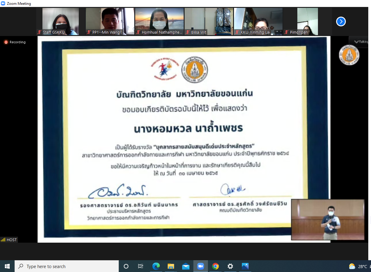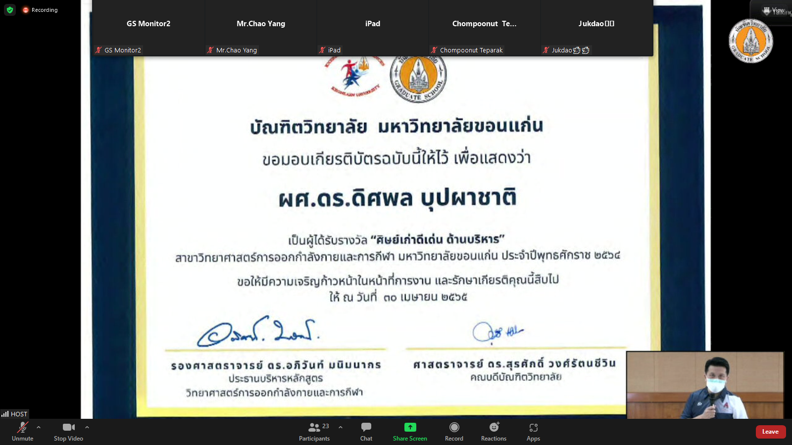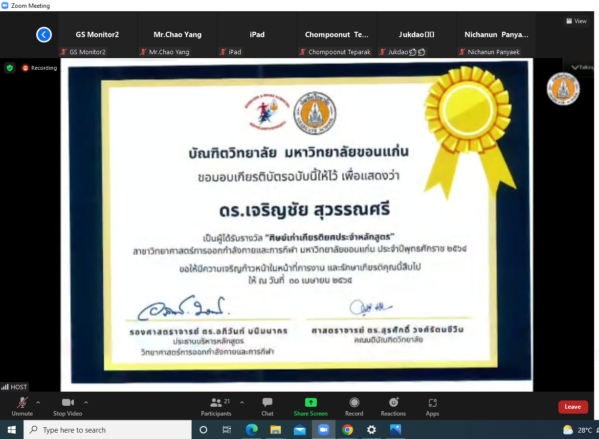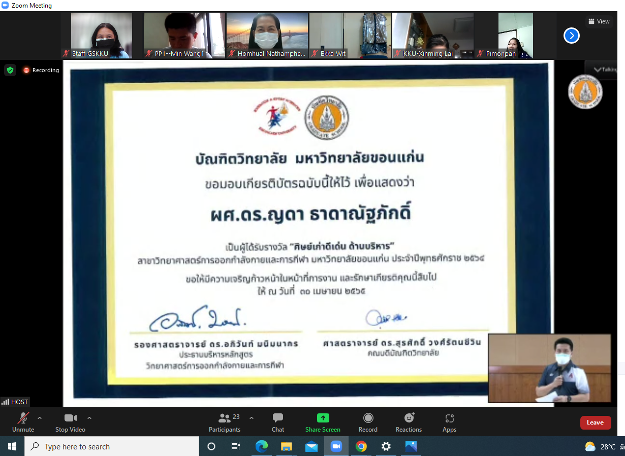 สาขาวิชาวิทยาศาสตร์การออกกำลังกายและการกีฬา สาขาวิชาร่วม บัณฑิตวิทยาลัยจัดโครงการสัมมนาเพื่อสร้างเสริมการเรียนรู้และความสัมพันธ์ ประจำปี 2565 รูปแบบไฮบริด (online และ on-site) วันเสาร์ที่ 30 เมษายน 2565 เวลา 8.00 – 16.00 น. ณ อาคารพิมล กลกิจ และผ่านระบบออนไลน์โดยใช้โปรแกรม Zoom รศ.ดร.อภิวันท์ มนิมนากร ประธานบริหารหลักสูตรวิทยาศาสตร์การออกกำลังกายและการกีฬา กล่าวต้อนรับและให้โอวาท จากนั้นผู้บริหารบัณฑิตวิทยาลัยกล่าวต้อนรับนักศึกษาและผู้เข้าร่วมกิจกรรม โดย ศ.ดร.สุรศักดิ์ วงศ์รัตนชีวิน คณบดีบัณฑิตวิทยาลัย รศ.ดร.พงศกร พรรณรัตนศิลป์ รองคณบดีฝ่ายบริหาร วางแผนและพัฒนาคุณภาพ และ ผศ.ดร. กรชวัล ชายผา ผู้ช่วยคณบดีฝ่ายสารสนเทศ จากนั้นเป็นพิธีบายศรีสู่ขวัญ การมอบเกียรติบัตรแก่นักศึกษาและผู้สร้างชื่อเสียงให้แก่หลักสูตร