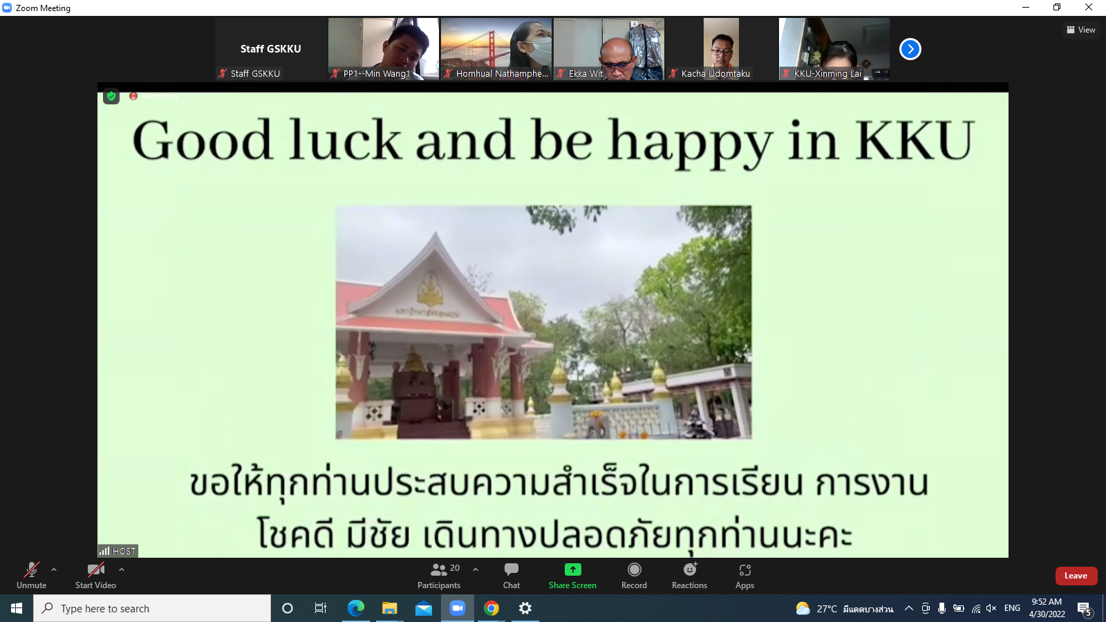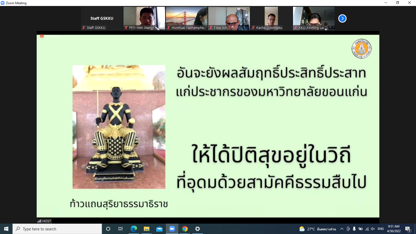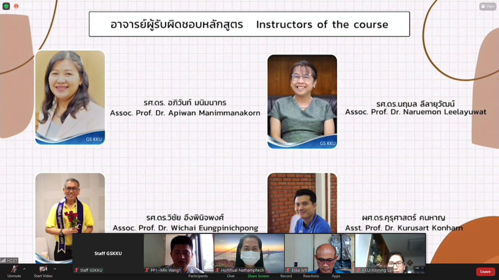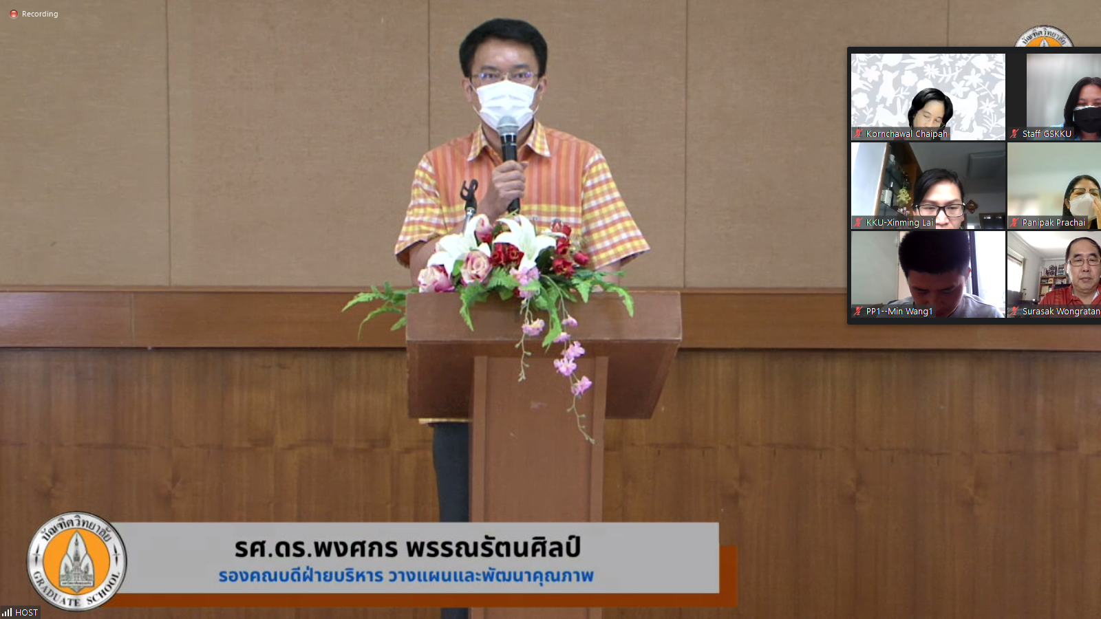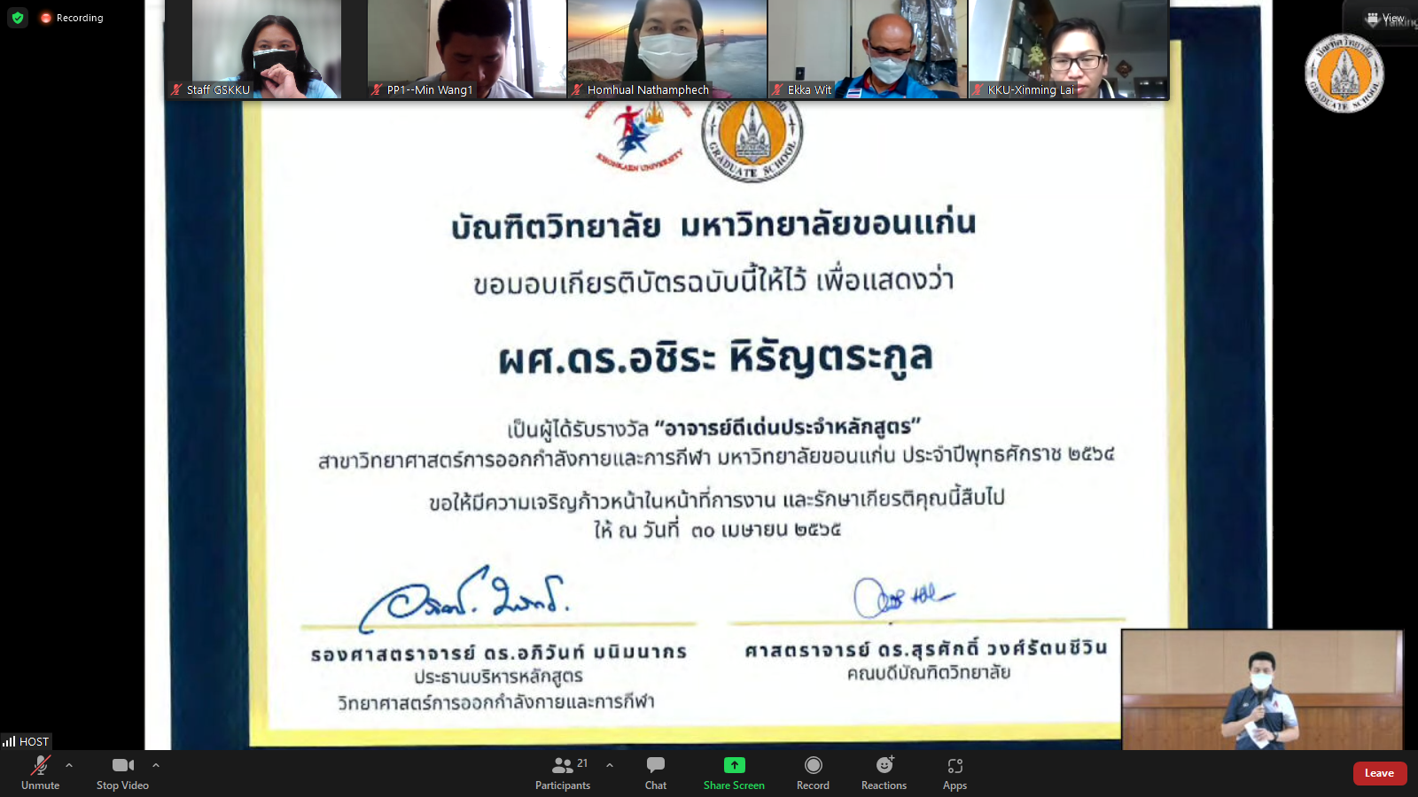 สาขาวิชาวิทยาศาสตร์การออกกำลังกายและการกีฬา สาขาวิชาร่วม บัณฑิตวิทยาลัยจัดโครงการสัมมนาเพื่อสร้างเสริมการเรียนรู้และความสัมพันธ์ ประจำปี 2565 รูปแบบไฮบริด (online และ on-site) วันเสาร์ที่ 30 เมษายน 2565 เวลา 8.00 – 16.00 น. ณ อาคารพิมล กลกิจ และผ่านระบบออนไลน์โดยใช้โปรแกรม Zoom รศ.ดร.อภิวันท์ มนิมนากร ประธานบริหารหลักสูตรวิทยาศาสตร์การออกกำลังกายและการกีฬา กล่าวต้อนรับและให้โอวาท จากนั้นผู้บริหารบัณฑิตวิทยาลัยกล่าวต้อนรับนักศึกษาและผู้เข้าร่วมกิจกรรม โดย ศ.ดร.สุรศักดิ์ วงศ์รัตนชีวิน คณบดีบัณฑิตวิทยาลัย รศ.ดร.พงศกร พรรณรัตนศิลป์ รองคณบดีฝ่ายบริหาร วางแผนและพัฒนาคุณภาพ และ ผศ.ดร. กรชวัล ชายผา ผู้ช่วยคณบดีฝ่ายสารสนเทศ จากนั้นเป็นพิธีบายศรีสู่ขวัญ การมอบเกียรติบัตรแก่นักศึกษาและผู้สร้างชื่อเสียงให้แก่หลักสูตร