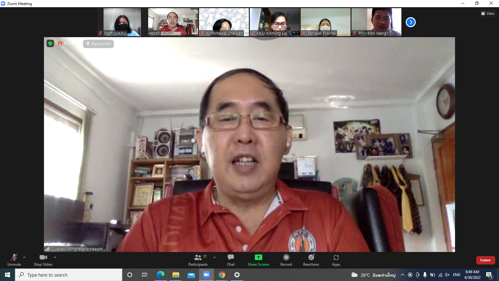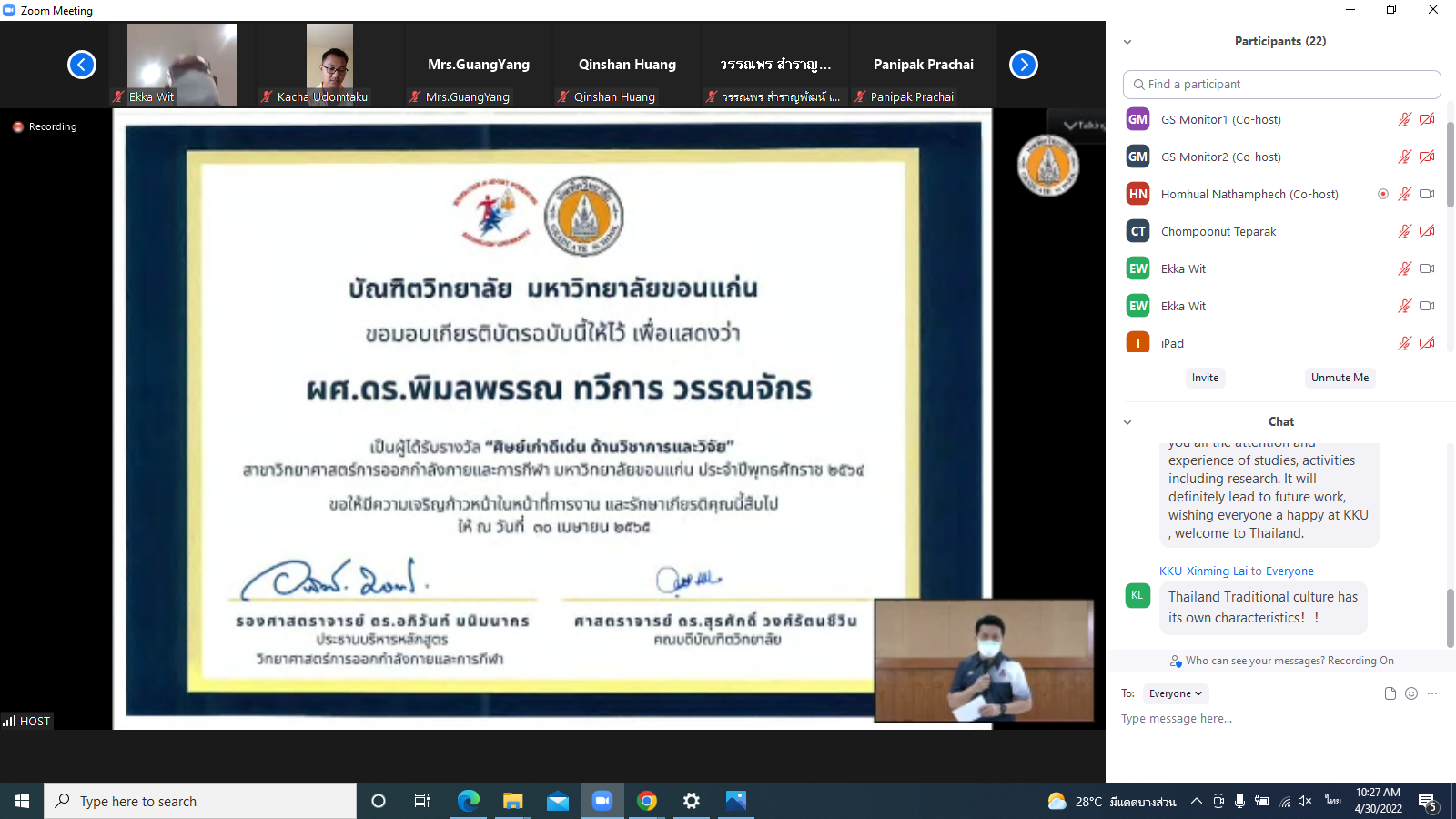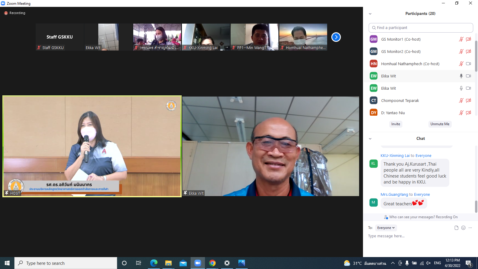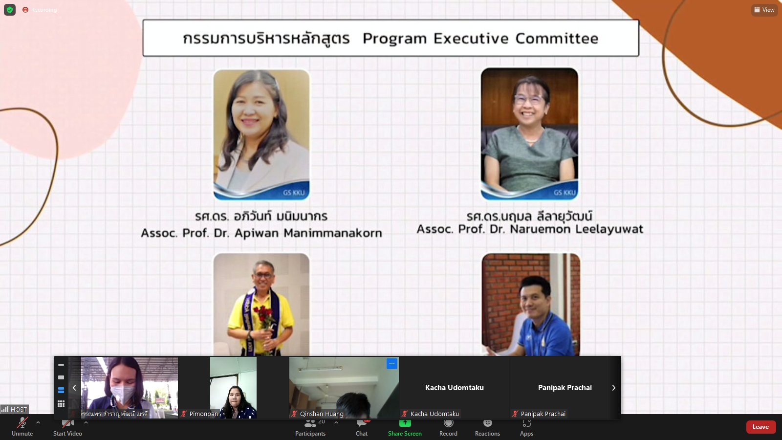 สาขาวิชาวิทยาศาสตร์การออกกำลังกายและการกีฬา สาขาวิชาร่วม บัณฑิตวิทยาลัยจัดโครงการสัมมนาเพื่อสร้างเสริมการเรียนรู้และความสัมพันธ์ ประจำปี 2565 รูปแบบไฮบริด (online และ on-site) วันเสาร์ที่ 30 เมษายน 2565 เวลา 8.00 – 16.00 น. ณ อาคารพิมล กลกิจ และผ่านระบบออนไลน์โดยใช้โปรแกรม Zoom รศ.ดร.อภิวันท์ มนิมนากร ประธานบริหารหลักสูตรวิทยาศาสตร์การออกกำลังกายและการกีฬา กล่าวต้อนรับและให้โอวาท จากนั้นผู้บริหารบัณฑิตวิทยาลัยกล่าวต้อนรับนักศึกษาและผู้เข้าร่วมกิจกรรม โดย ศ.ดร.สุรศักดิ์ วงศ์รัตนชีวิน คณบดีบัณฑิตวิทยาลัย รศ.ดร.พงศกร พรรณรัตนศิลป์ รองคณบดีฝ่ายบริหาร วางแผนและพัฒนาคุณภาพ และ ผศ.ดร. กรชวัล ชายผา ผู้ช่วยคณบดีฝ่ายสารสนเทศ จากนั้นเป็นพิธีบายศรีสู่ขวัญ การมอบเกียรติบัตรแก่นักศึกษาและผู้สร้างชื่อเสียงให้แก่หลักสูตร