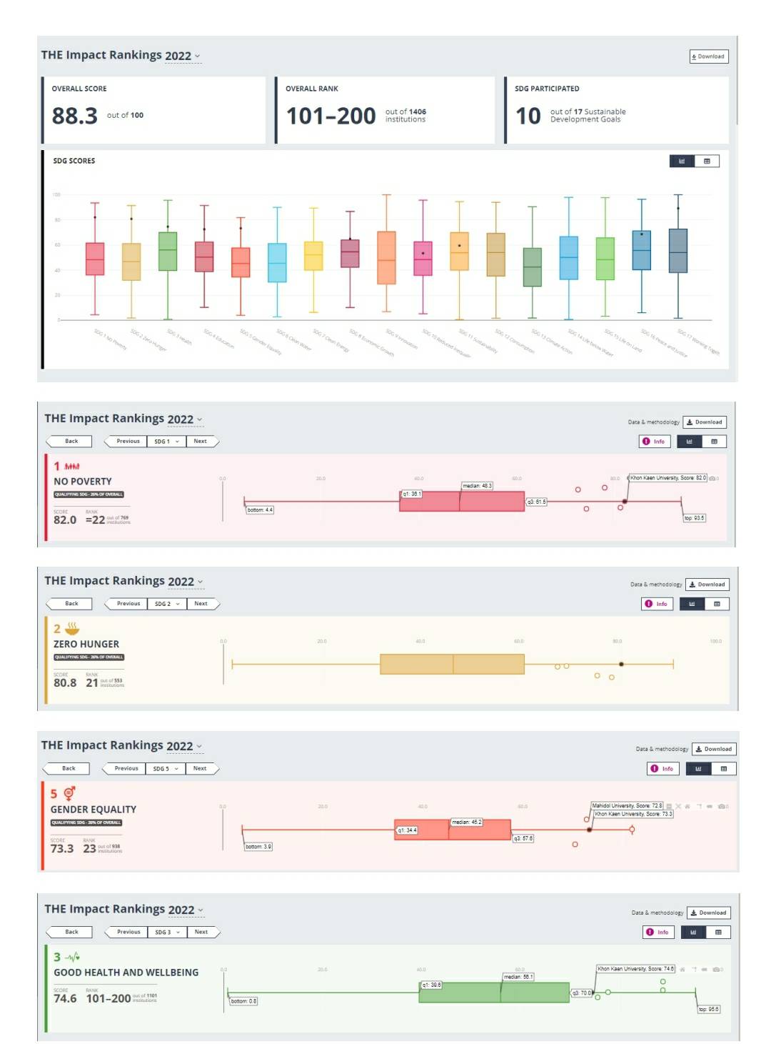 “Sustainable Development Goals (SDGs)  ของสหประชาชาติมีทั้งหมด 17 SDGs ในปี2021 มหาวิทยาลัยขอนแก่น ส่ง  8 SDGs ปี  2022  ส่ง 10 SDGs ซึ่งใน 10 SDGs ที่ส่งปีนี้มีความโดดเด่น ได้คะแนนสูงมาก ถึง  3 SDGs คือ SDGs 1: No Poverty ที่มีเป้าหมายในการขจัดความยากจนทุกรูปแบบในทุกพื้นที่ ซึ่ง มหาวิทยาลัยขอนแก่นส่งมาหลายปีแล้ว มีความโดดเด่นเกือบทุกปี มีการดำเนินการหลายโครงการ เช่น โครงการแก้จน โครงการลงพื้นที่ไปแก้ไขปัญหาเรื่องอาชีพ การเพิ่มรายได้ การพัฒนาผลิตภัณฑ์ และ ในปีสองปีที่ผ่านมา มีแรงสนับสนุนเพิ่มเติมจากโครงการของกระทรวงการอุดมศึกษา วิทยาศาสตร์ วิจัยและนวัตกรรม ที่ให้งบประมาณ U2T มหาวิทยาลัยสู่ตำบล สร้างงาน สร้างรายได้ให้ชุมชน ถึงแม้จะมีอุปสรรคเรื่องโควิด ก็มีการลงพื้นที่ช่วยเหลือชุมชน มีการเก็บข้อมูลที่เป็นระบบ รวมไปถึงการมีงานวิจัยที่โดดเด่นมากเป็นแรงสนับสนุนที่ทำให้คะแนนตรงนี้เป็นสูงเป็นอันดับต้นๆ ของโลก และ เป็นอันดับที่ 1 ของประเทศ