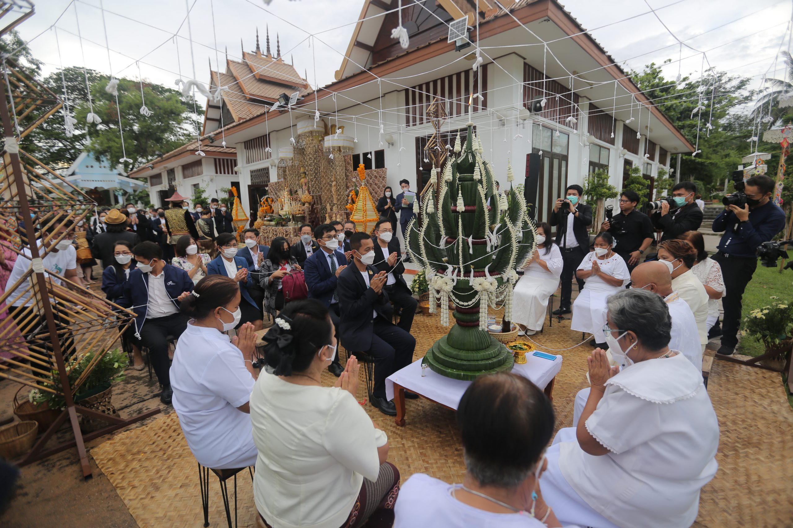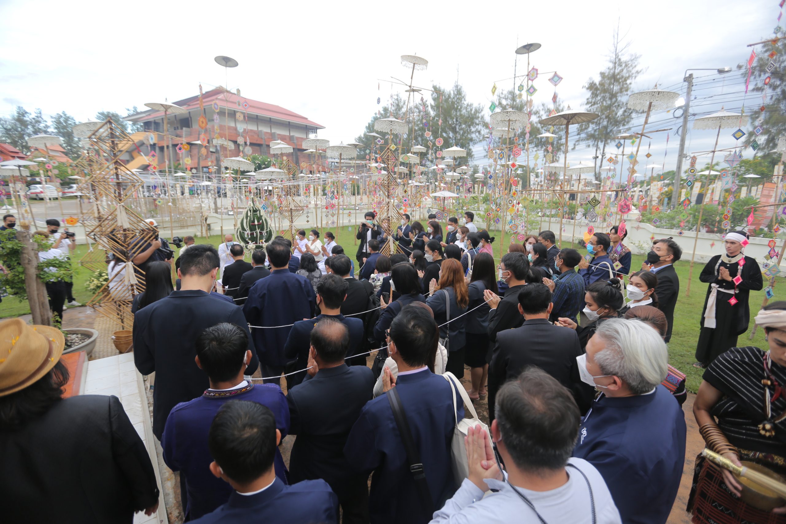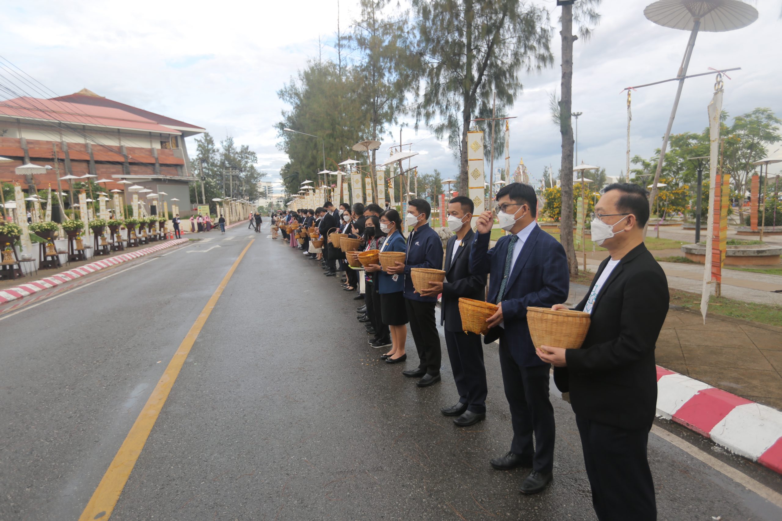 จากนั้นเวลา 17.30 น. อธิการบดีมหาวิทยาลัยขอนแก่น พร้อมคณะร่วมกิจกรรมสร้างความสัมพันธ์เครือข่าย Brain Power Thailand ร่วมกับ ผู้ว่าราชการจังหวัดขอนแก่น คณะผู้บริหารกระทรวงการอุดมศึกษา วิทยาศาสตร์ วิจัยและนวัตกรรม เดินข้ามจากโซน “บุญเปิดบ้าน แปงเมือง” ไปสู่ โลกอนาคต ผ่านเส้นทางกระทงบก เข้าสู่เวทีกลาง  กิจกรรม “บุญเปิดบ้าน แปงเมือง สู่การวิจัยขั้นแนวหน้าด้านสังคมศาสตร์ มนุษยศาสตร์ และศิลปวัฒนธรรม (SHA Frontier)” โดย มหาวิทยาลัยขอนแก่นจัดขบวนต้อนรับ งดงาม ตามประเพณีต้อนรับแขกบ้านแขกเมือง ประกอบด้วยพิธีกรรมโปรยข้าวตอกดอกไม้บูชาพระลับพระคู่บ้านคู่เมืองชาวขอนแก่น   พิธีกรรมบายศรีสู่ขวัญการต้อนรับอย่างเป็นทางการผู้มาเยือนสำคัญของชาวอีสาน   พิธีสรงน้ำพุทธศิลป์ถิ่นล้านช้างร่มขาว   พิธีเวียนเทียน   พิธีถวายขันหมากเบ็ง หลวงพ่อพระศรี พระพุทธรูปไม้ ที่มีขนาดใหญ่สุดในจังหวัดขอนแก่น   ร่วมตักบาตรดอกไม้ถวายตัวเป็นพุทธบูชา  พิธีกรรมแต่งแก้เสียเคราะห์   และชมกระทงโคกบูชาพระแม่คงคา