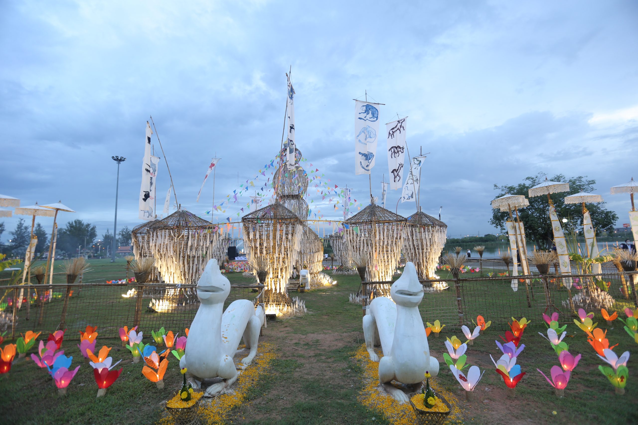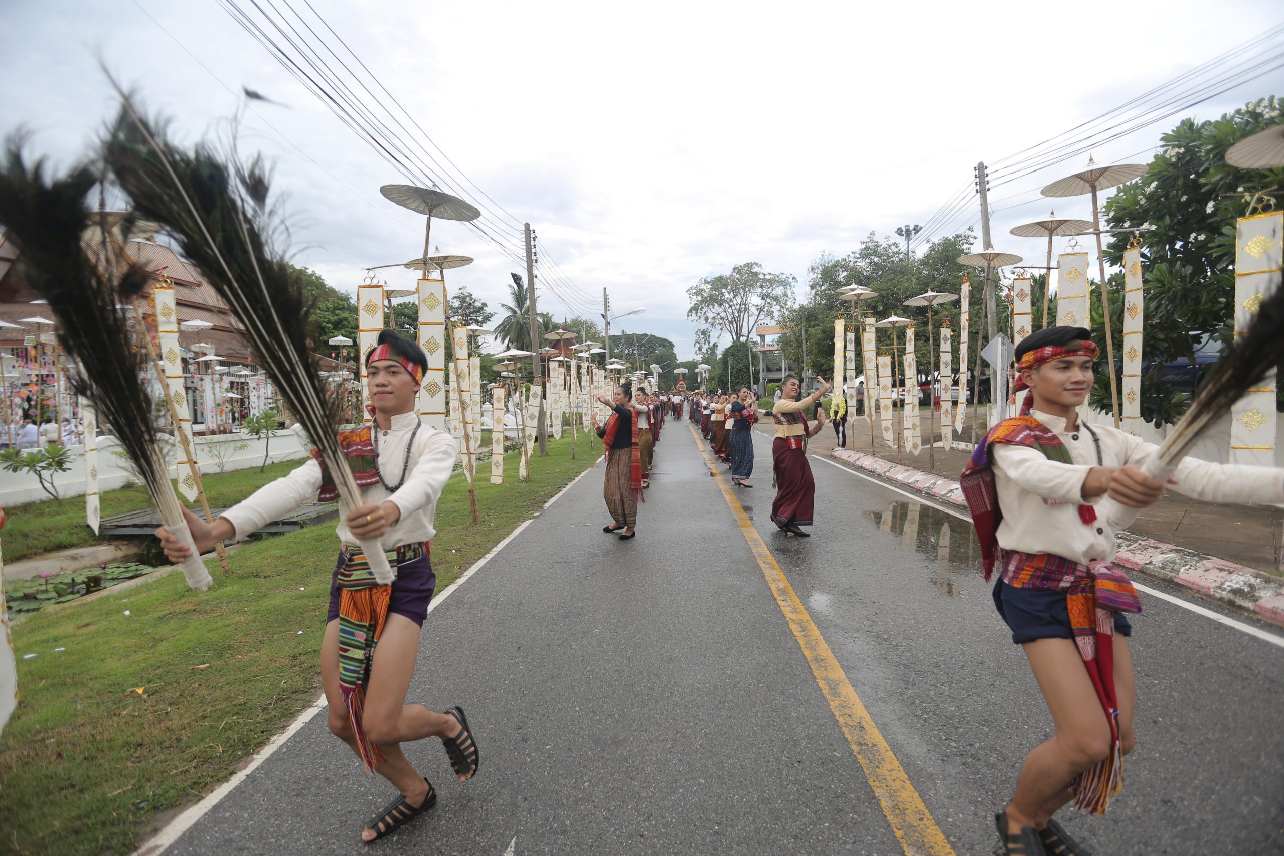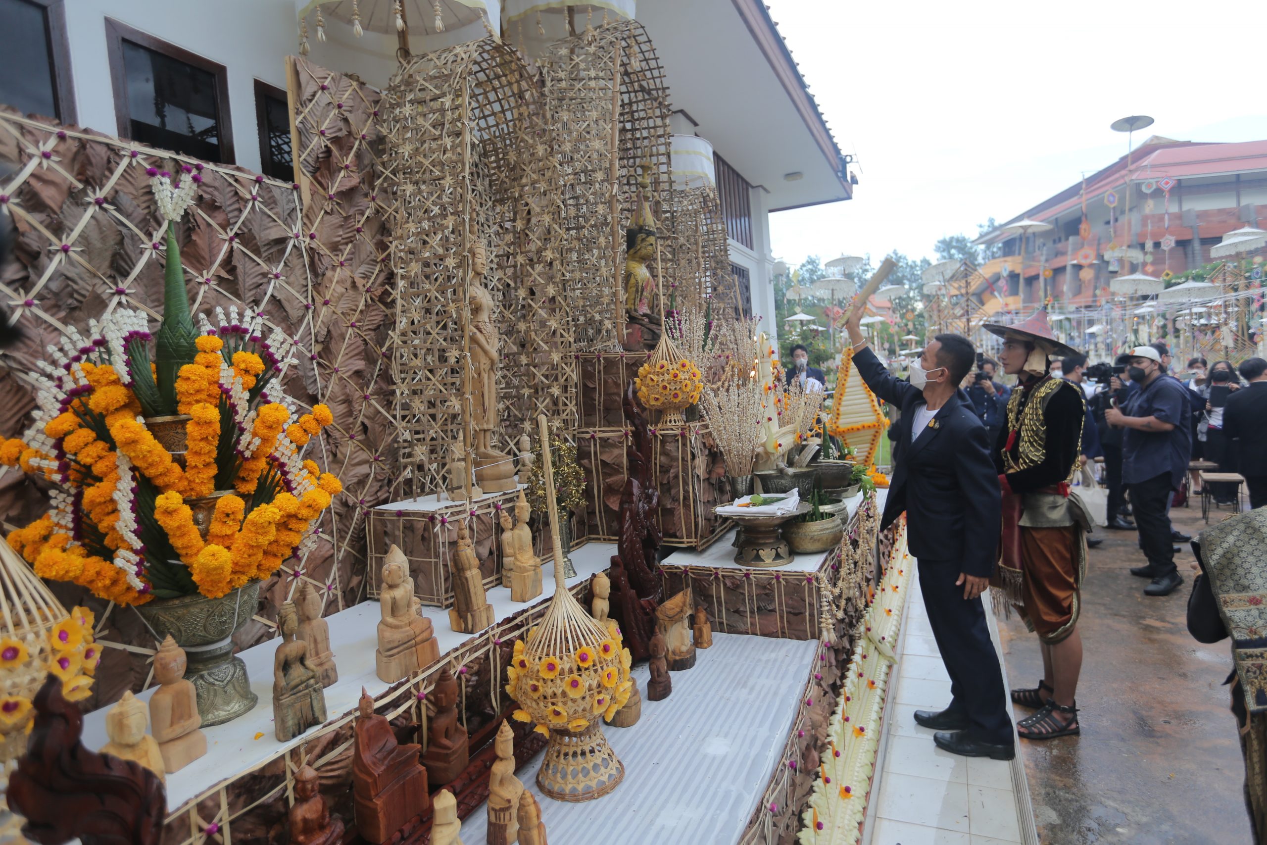 จากนั้นเวลา 17.30 น. อธิการบดีมหาวิทยาลัยขอนแก่น พร้อมคณะร่วมกิจกรรมสร้างความสัมพันธ์เครือข่าย Brain Power Thailand ร่วมกับ ผู้ว่าราชการจังหวัดขอนแก่น คณะผู้บริหารกระทรวงการอุดมศึกษา วิทยาศาสตร์ วิจัยและนวัตกรรม เดินข้ามจากโซน “บุญเปิดบ้าน แปงเมือง” ไปสู่ โลกอนาคต ผ่านเส้นทางกระทงบก เข้าสู่เวทีกลาง  กิจกรรม “บุญเปิดบ้าน แปงเมือง สู่การวิจัยขั้นแนวหน้าด้านสังคมศาสตร์ มนุษยศาสตร์ และศิลปวัฒนธรรม (SHA Frontier)” โดย มหาวิทยาลัยขอนแก่นจัดขบวนต้อนรับ งดงาม ตามประเพณีต้อนรับแขกบ้านแขกเมือง ประกอบด้วยพิธีกรรมโปรยข้าวตอกดอกไม้บูชาพระลับพระคู่บ้านคู่เมืองชาวขอนแก่น   พิธีกรรมบายศรีสู่ขวัญการต้อนรับอย่างเป็นทางการผู้มาเยือนสำคัญของชาวอีสาน   พิธีสรงน้ำพุทธศิลป์ถิ่นล้านช้างร่มขาว   พิธีเวียนเทียน   พิธีถวายขันหมากเบ็ง หลวงพ่อพระศรี พระพุทธรูปไม้ ที่มีขนาดใหญ่สุดในจังหวัดขอนแก่น   ร่วมตักบาตรดอกไม้ถวายตัวเป็นพุทธบูชา  พิธีกรรมแต่งแก้เสียเคราะห์   และชมกระทงโคกบูชาพระแม่คงคา