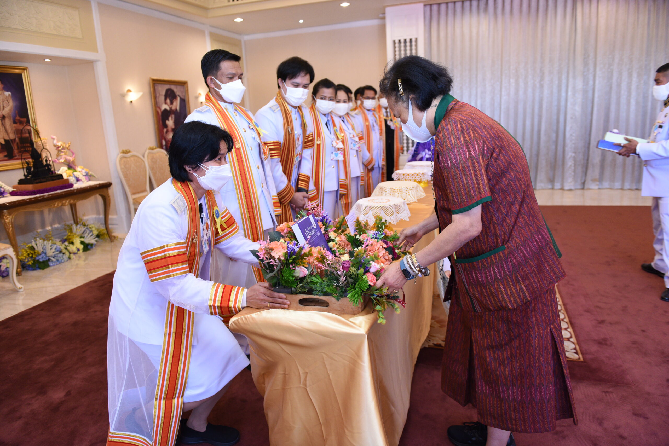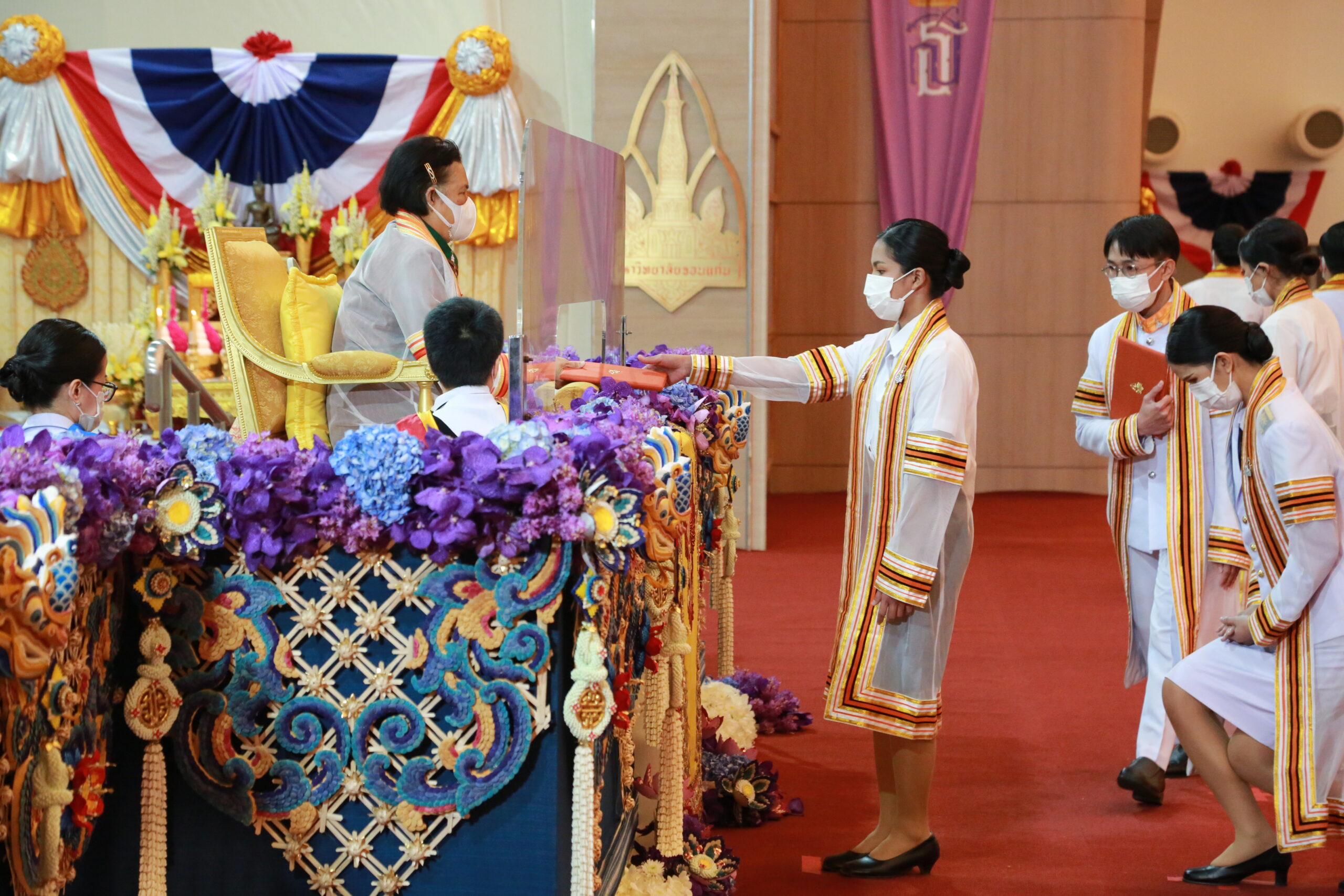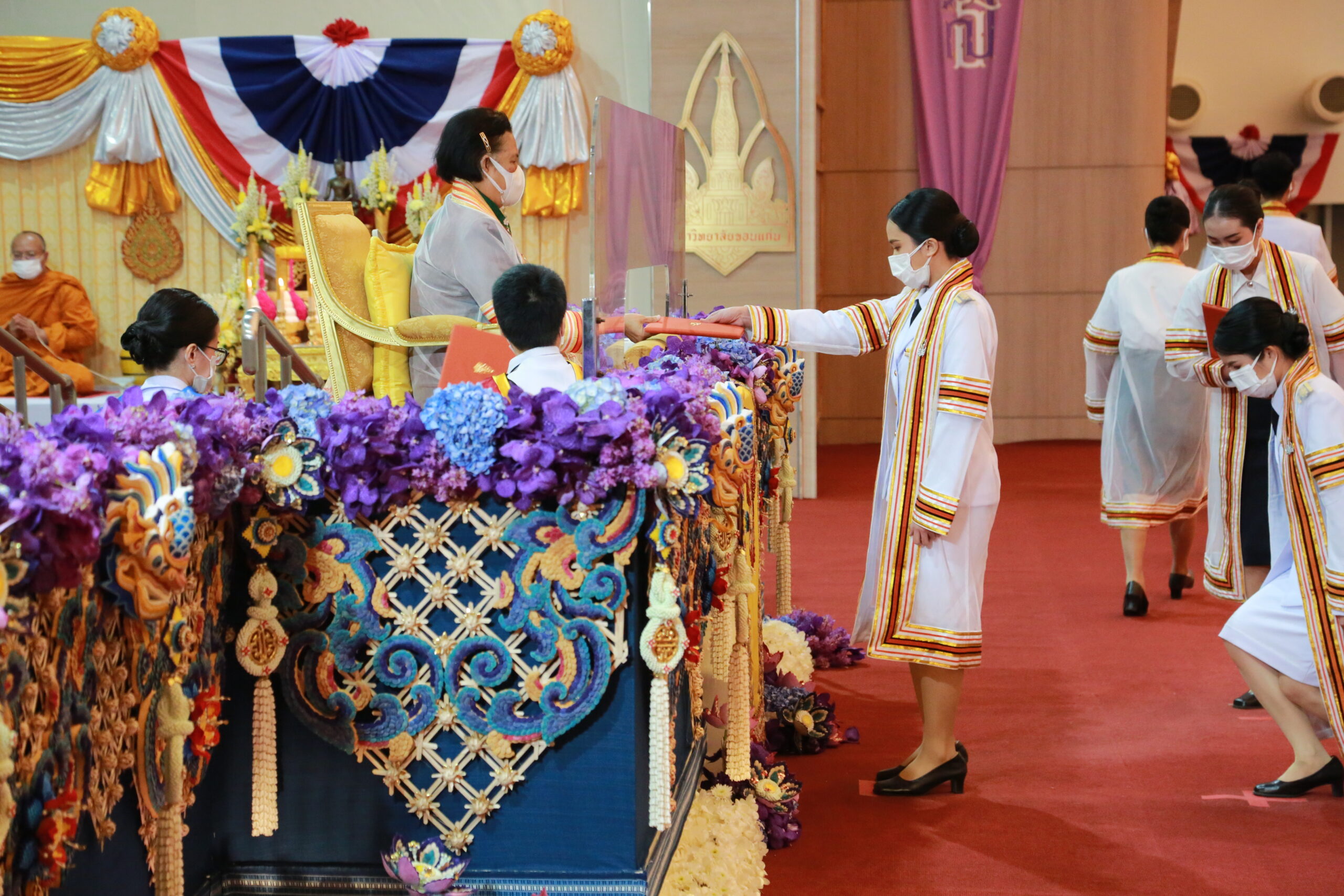 ผศ.ธรา ธรรมโรจน์ รองอธิการบดีฝ่ายบริหาร (ทูลเกล้า ฯ ถวาย สมเด็จพระนางเจ้าฯ พระบรมราชินี)ผลิตภัณฑ์พื้นเมือง (ผ้าไหม) จำนวน 1 ชิ้น