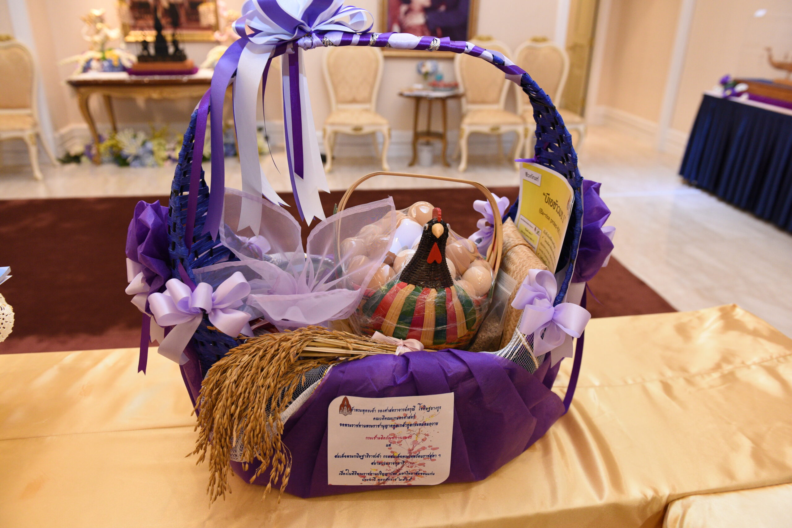 รศ.ดรุณี โชติษฐยางกูร คณบดีคณะเกษตรศาสตร์ ทูลเกล้า ฯ ถวาย ไข่ไก่พื้นเมือง จำนวน 1 กระเช้า เมล็ดพันธุ์พริกและมะเขือเทศพันธุ์แท้ จำนวน 6 พันธุ์ ข้าวพันธุ์ มข.60-2 และชาข้าวกา Antho-rice ชีวภัณฑ์ Ba-Rice Protect KKU.1 จำนวน 300 ซอง (ซองละ 20 กรัม) และ เมล็ดพันธุ์ข้าวไรซ์เบอรี่ผลิตในโรงเรือนและมีการใช้ชีวภัณฑ์ Ba-Rice Protect KKU.1 จำนวน 3 กิโลกรัม