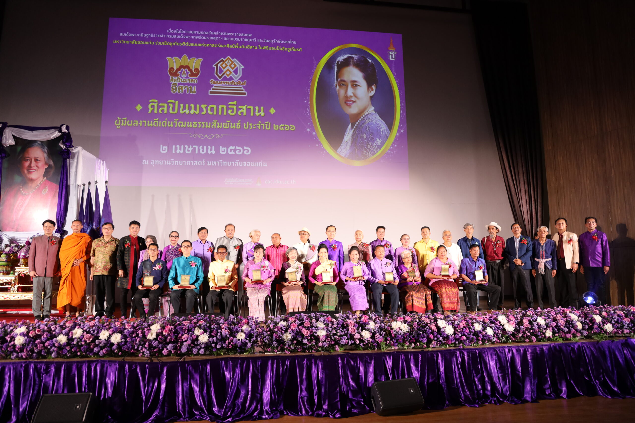 วันอาทิตย์ที่ 2 เมษายน 2566 รศ.นพ. ชาญชัย พานทองวิริยะกุล อธิการบดีมหาวิทยาลัยขอนแก่น เป็นประธานในงานเชิดชูเกียรติศิลปินมรดกอีสานและผู้ผลงานดีเด่นวัฒนธรรมสัมพันธ์ เนื่องในวันคล้ายวันพระราชสมภพสมเด็จพระกนิษฐาธิราชเจ้า กรมสมเด็จพระเทพรัตนราชสุดา สยามบรมราชกุมารี และวันอนุรักษ์มรดกไทย ประจำปี 2566 โดยมี รศ.ดร. นิยม วงศ์พงษ์คำ รองอธิการบดีฝ่ายศิลปวัฒนธรรมและเศรษฐกิจสร้างสรรค์ พร้อมด้วยคณะผู้บริหารมหาวิทยาลัยขอนแก่น นายวรศักดิ์ วรยศ รักษาการแทนผู้อำนวยการศูนย์ศิลปวัฒนธรรม ศิลปินแห่งชาติ ศิลปินมรดกอีสาน ผู้มีผลงานดีเด่นวัฒนธรรมสัมพันธ์ สื่อมวลชน และผู้มีเกียรติจำนวนมากเข้าร่วมในงาน ซึ่งในปีนี้มหาวิทยาลัยขอนแก่น ได้ประกาศเกียรติคุณเชิดชูเกียรติ อมรศิลปินมรดกอีสาน ศิลปินมรดกอีสาน และผู้มีผลงานดีเด่น ด้านวัฒนธรรมสัมพันธ์ จำนวน 18 ราย ณ ห้องประชุมออดิทอเรียม อุทยานวิทยาศาสตร์ มหาวิทยาลัยขอนแก่น