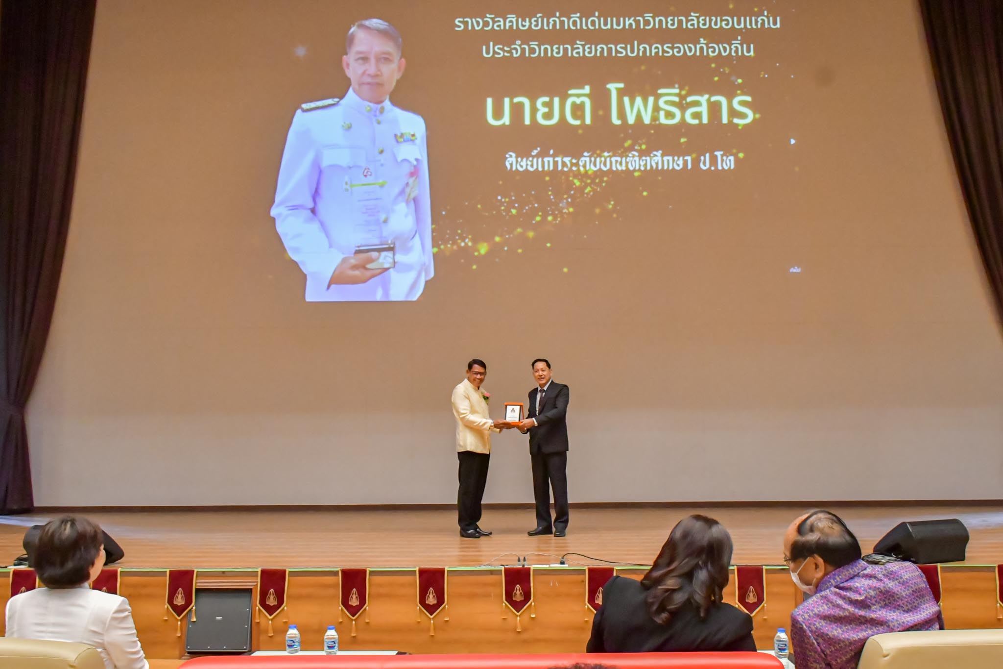 เมื่อวันที่ 27 พฤษภาคม 2566 ที่ผ่านมา ศิษย์เก่าระดับปริญญาโทของวิทยาลัยการปกครองท้องถิ่น นายตี โพธิสาร ปัจจุบันดำรงตำแหน่ง นายกเทศมนตรีตำบลโพธิ์กระสังข์ เทศบาลตำบลโพธิ์กระสังข์ อ.ขุนหาญ จ.ศรีสะเกษ ได้เข้ารับโล่รางวัล ใน “พิธีมอบรางวัลศิษย์เก่าดีเด่น มข.ประจำคณะ/วิทยาลัย ประจำปี พ.ศ.2565” ซึ่งจัดขึ้น ณ ห้องประชุม Auditorium อาคารอุทยานวิทยาศาสตร์ จ.ขอนแก่น โดยได้รับเกียรติจาก รศ.เพียรศักดิ์ ภักดี รองอธิการบดีฝ่ายพัฒนานักศึกษาและศิษย์เก่าสัมพันธ์ เป็นประธานในพิธี พร้อมทั้งกล่าวแสดงความยินดีกับผู้ที่ได้รับรางวัลอันทรงเกียรติทุกท่านในครั้งนี้