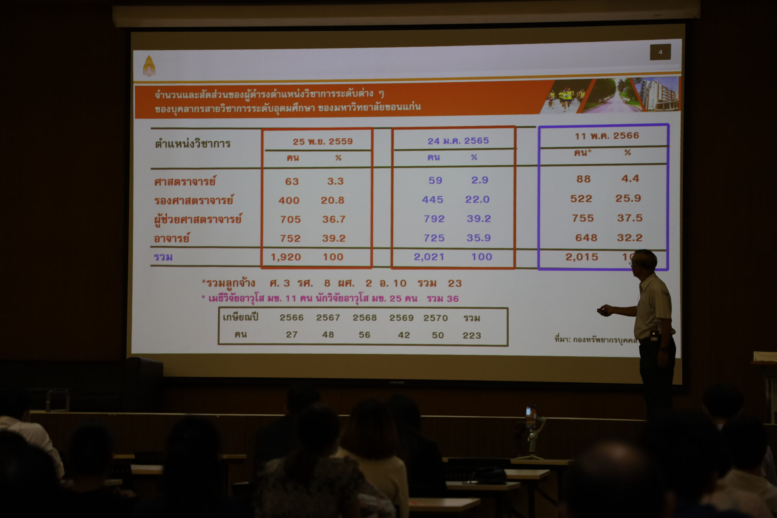 ขณะที่ รองศาสตราจารย์ ดร.เกรียงไกร กิจเจริญ รองอธิการบดีฝ่ายทรัพยากรบุคคล ระบุว่า ปัจจุบันมหาวิทยาลัยขอนแก่น มีพันธกิจในการผลิตบัณฑิต การวิจัยการบริการวิชาการแก่สังคม และการทำนุบำรุงศิลปวัฒนธรรมให้ได้มาตรฐานสากล รวมทั้งมีเป้าหมายที่จะพัฒนามหาวิทยาลัยและพัฒนาบุคลากรทุกสายงานควบคู่กันไปกับการสนับสนุนและขับเคลื่อนให้คณาจารย์มหาวิทยาลัยขอนแก่นทุกระดับ ให้มีตำแหน่งทางวิชาการที่สูงขึ้น จึงเป็นภารกิจที่มหาวิทยาลัยขอนแก่นให้ความสำคัญเป็นอย่างมาก โดยเฉพาะการตอบ OKRs ของมหาวิทยาลัยขอนแก่นในด้านการเพิ่มจำนวนผู้ดำรงตำแหน่งที่สูงขึ้นของสายวิชาการให้อยู่ในอัตราร้อยละที่กำหนดในแต่ละปี ซึ่งถือว่าเป็นความท้าทายอย่างหนึ่งของผู้รับผิดชอบในด้านบริหารทรัพยากรบุคคล