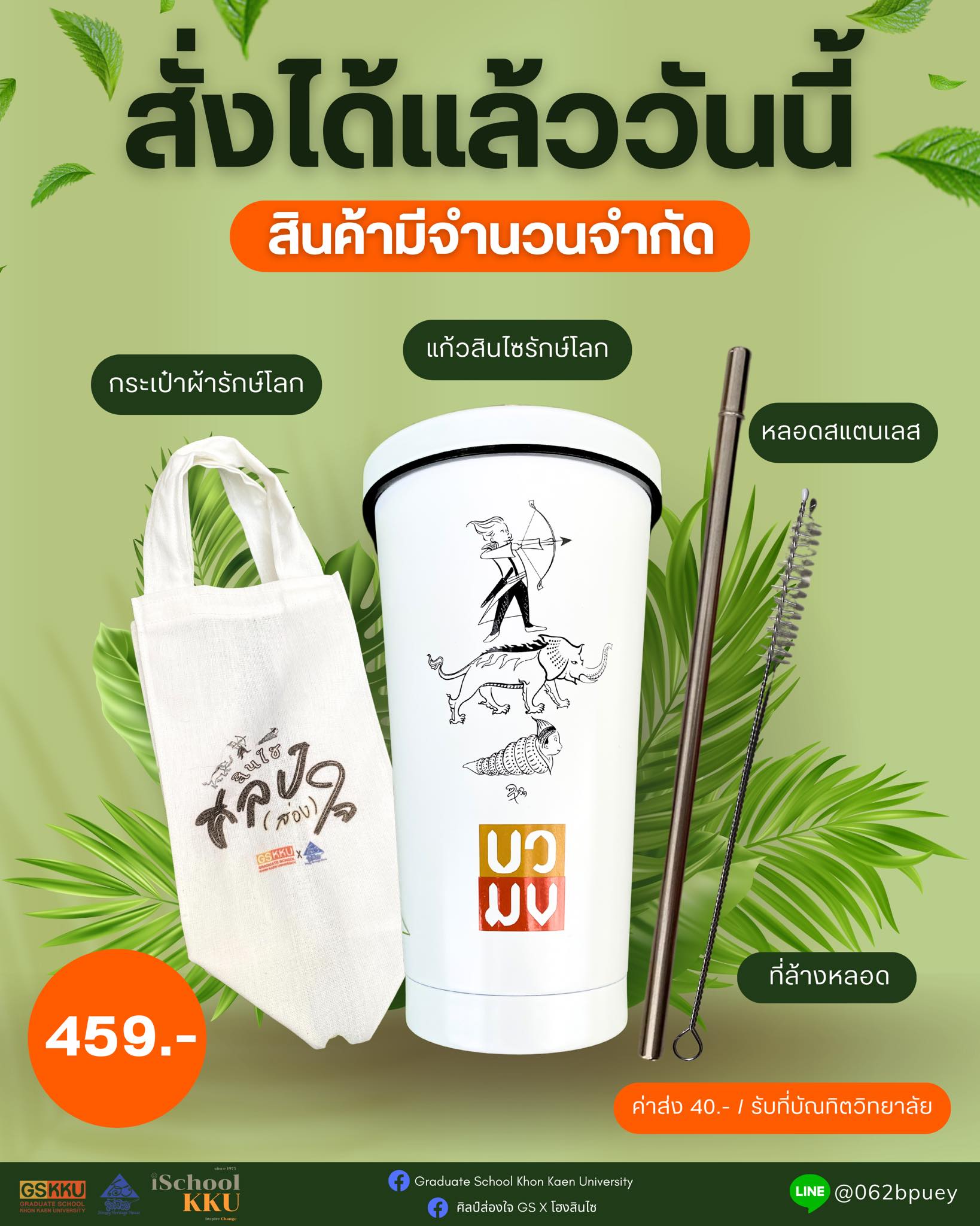 การเปิดตัวแก้วสินไซรักษ์โลก จำหน่ายราคาใบละ 459 บาท ซื้อช่วงนี้รับฟรี หลอดดูดและถุงผ้าใส่แก้วรักษ์โลก มีจำนวนจำกัด สั่งซื้อได้ที่ Line Official : @062bpuey หรือ คลิกได้ที่ https://lin.ee/lam0Jsh / บัณฑิตวิทยาลัย ชั้น 3 อาคารพิมล กลกิจ โทร. 08-1768-9618