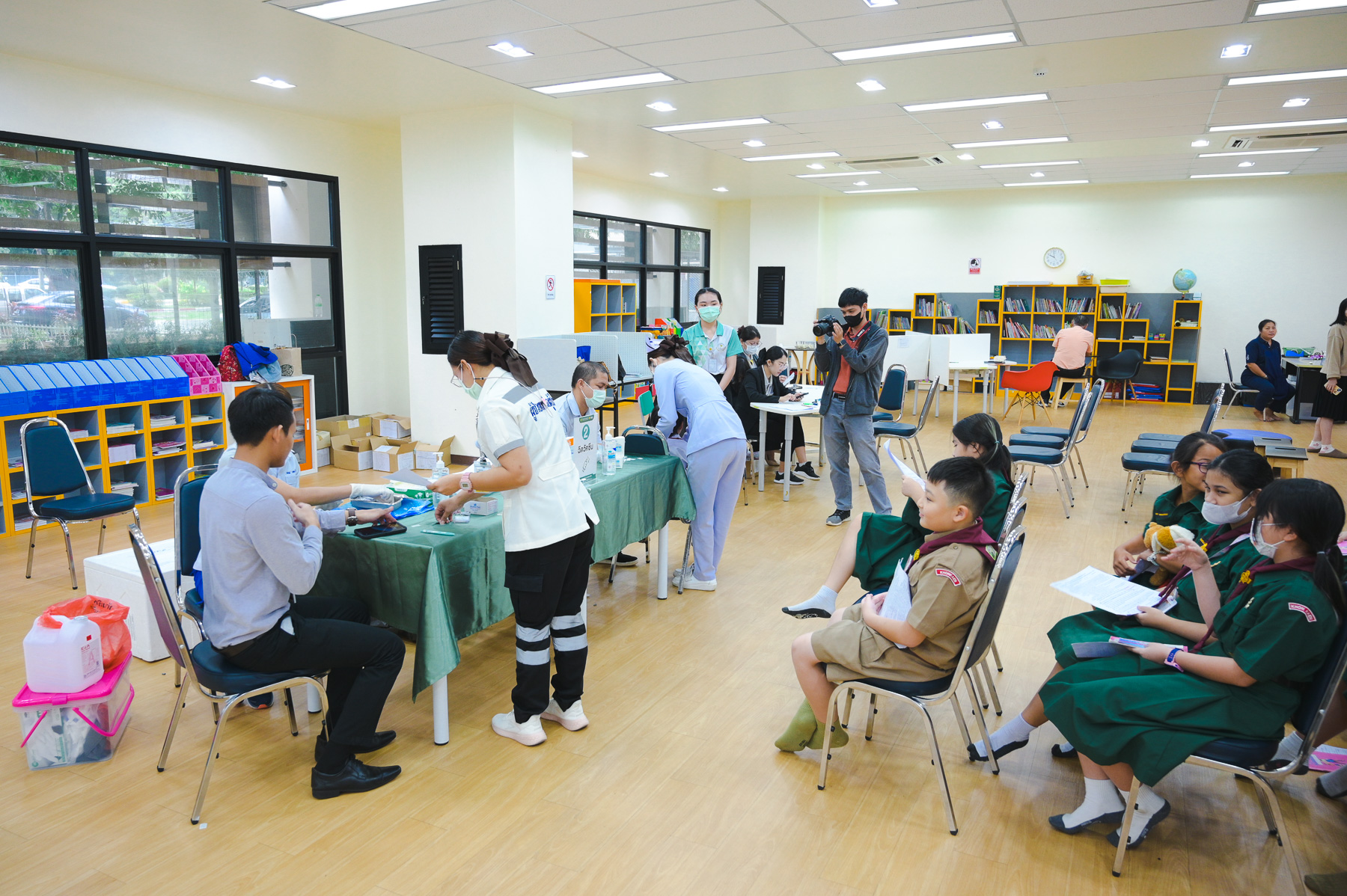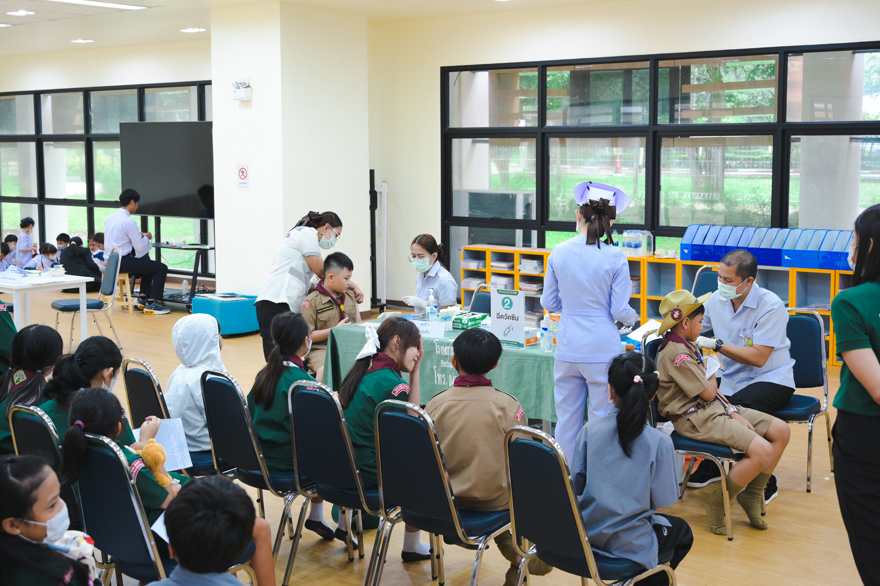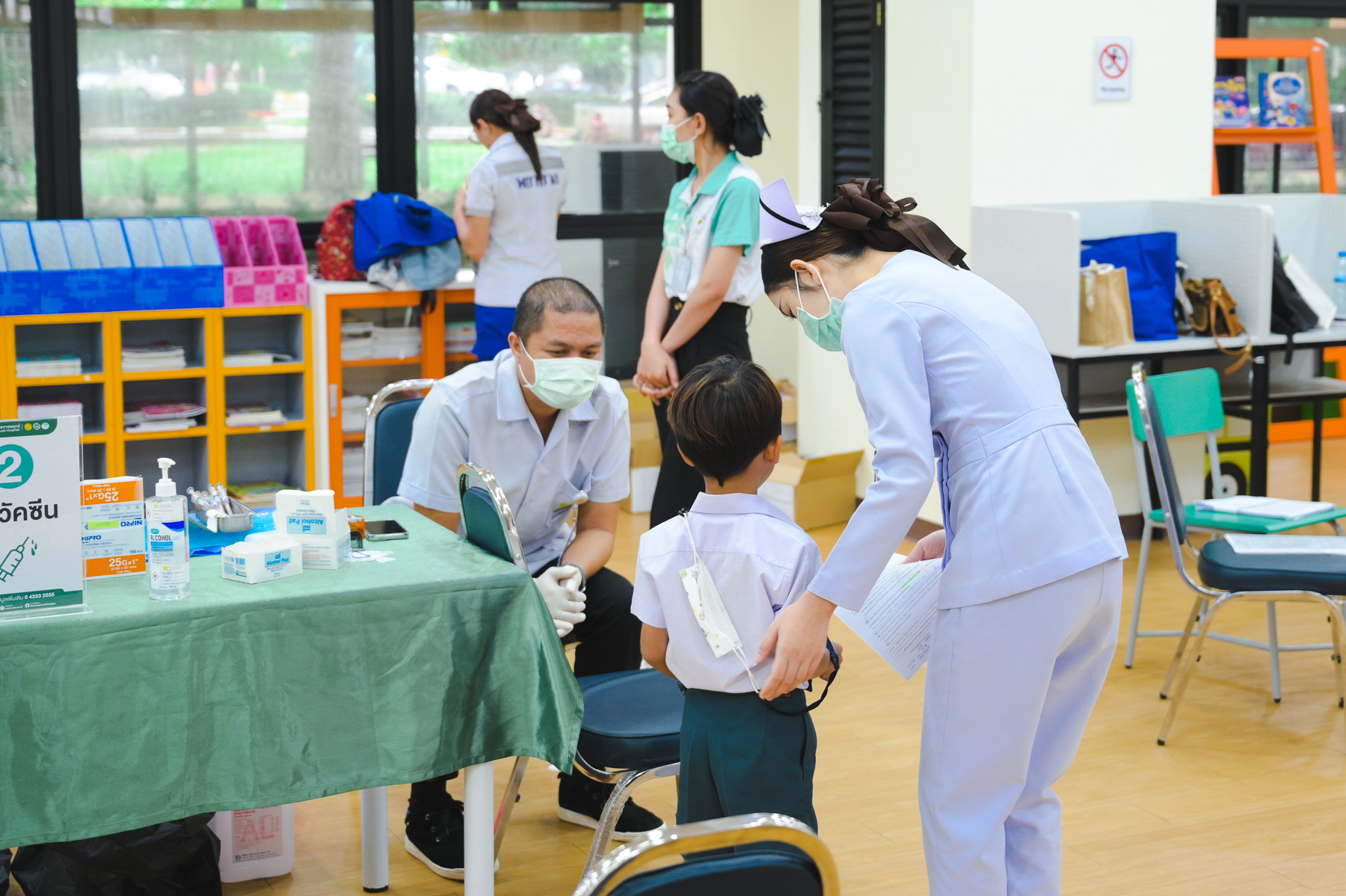 เมื่อวันที่ 5 กันยายน 2566 รศ.ดร.อิศรา ก้านจักร คณบดีคณะศึกษาศาสตร์ มหาวิทยาลัยขอนแก่น พร้อมด้วย ผศ.ดร.ศราวุธ จักรเป็ง รองคณบดีฝ่ายโรงเรียนสาธิตและพัฒนานวัตกรรมการศึกษารักษาการเทน ผู้อำนวยการโรงเรียสาธิตมหาวิทยาลัยขอนแก่น เข้าร่วมสังเกตการการฉีดวัคซีนให้แก่นักเรียน คณะครู และเจ้าหน้าที่ ในโรงเรียนสาธิตมหาวิทยาลัยขอนแก่นฝ่ายนานาชาติ โดยโรงเรียนสาธิตมหาวิทยาลัยขอนแก่นได้มีการวิเคราะห์และระบุกลุ่มเสี่ยงที่อาจเกิดการระบาดของไข้หวัดใหญ่ในเด็กเล็ก และได้มีมาตรการในการบริหารความเสี่ยงและความปลอดภัยในโรงเรียน ซึ่งได้จัดให้มีการฉีดวัคซีนในโรงเรียนสาธิตฯ ในระดับอนุบาลศึกษาและประถมศึกษา เพื่อทั้งป้องกันการแพร่ระบายของของไข้หวัดใหญ่ในเด็กเล็กและสร้างสภาพแวดล้อมที่ปลอดภัยสำหรับการเรียนรู้