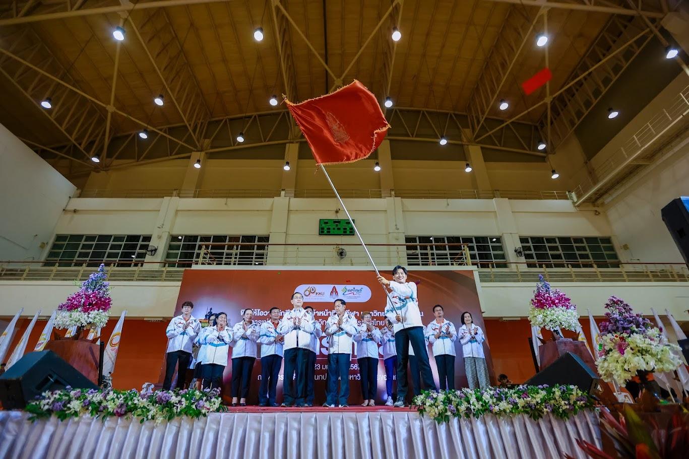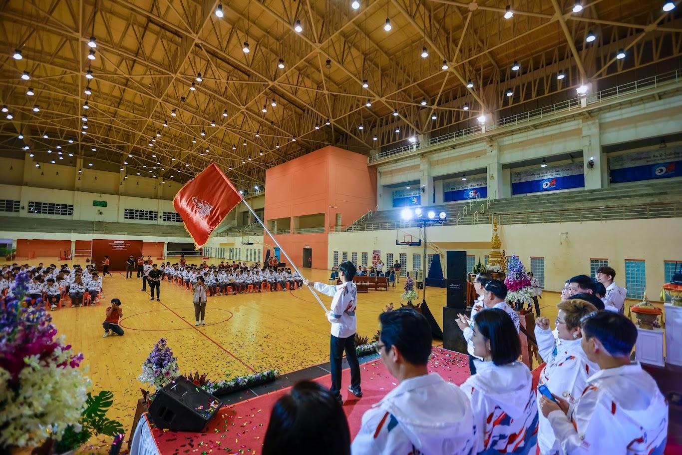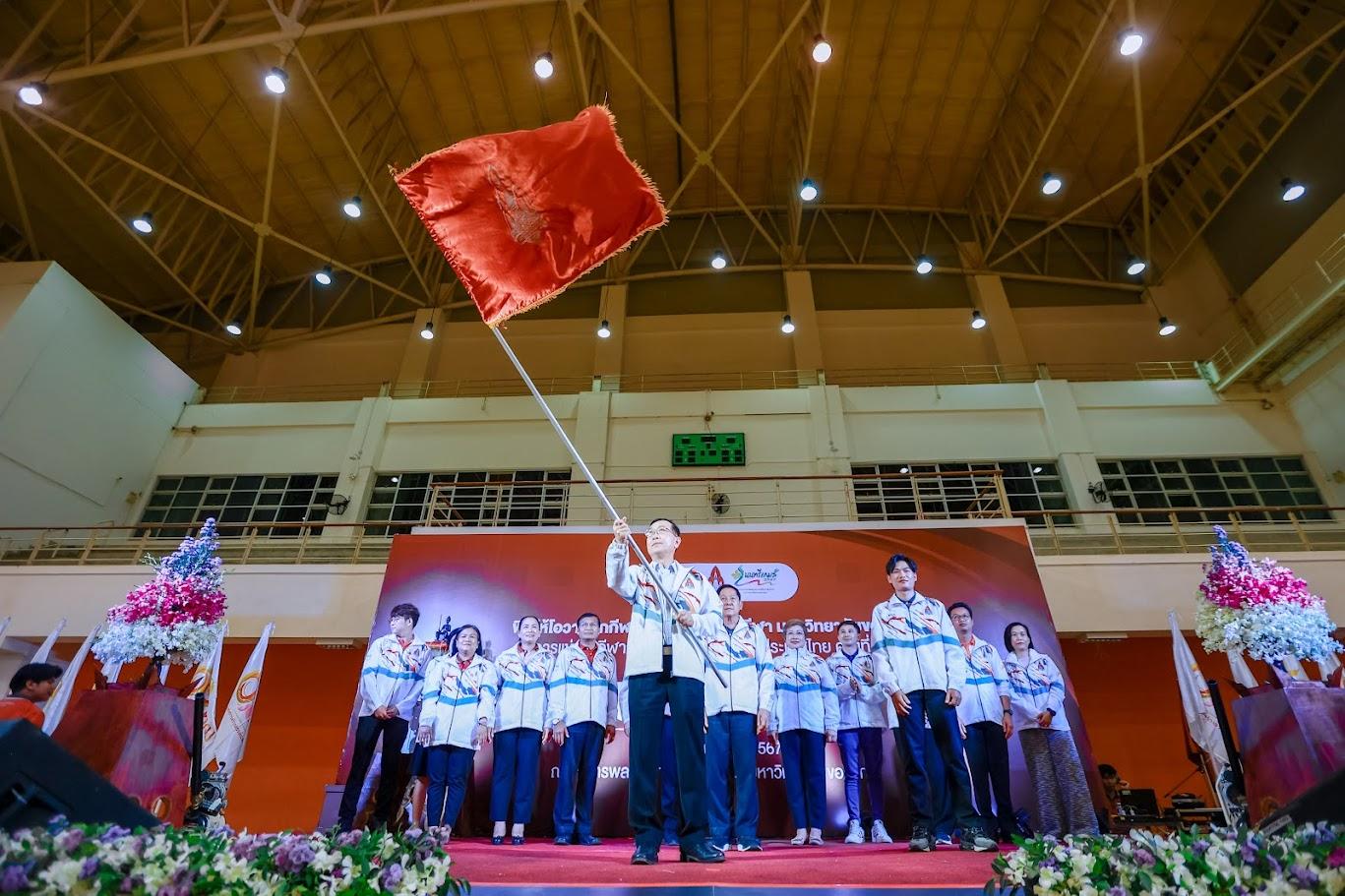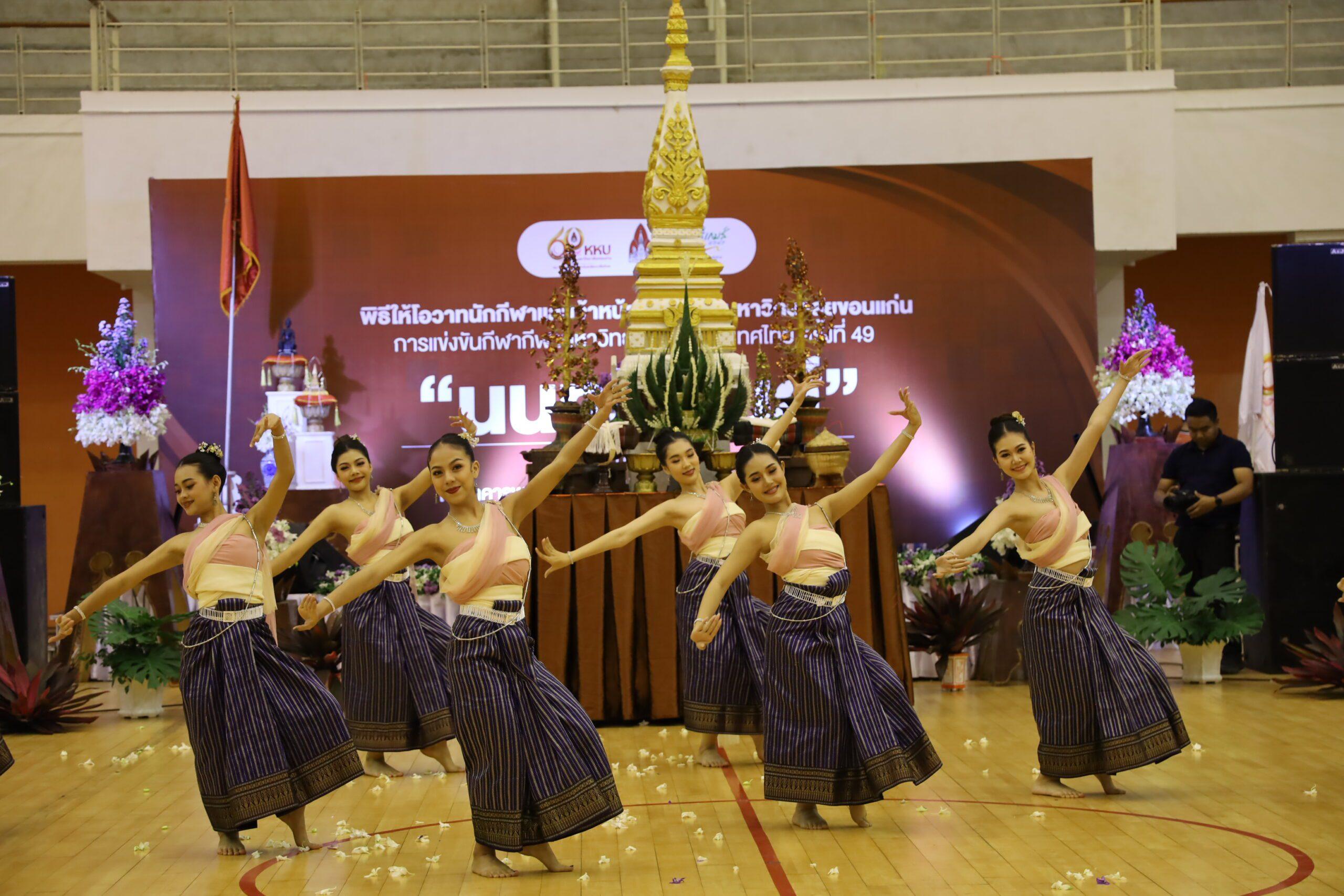 เมื่อ รองศาสตราจารย์ นพ.ชาญชัย พานทองวิริยะกุล อธิการบดีมหาวิทยาลัยขอนแก่น ได้มอบธงมหาวิทยาลัยฯ ให้กับ นายธีรภัทร ศรีสุลัย ประธานฝ่ายกีฬาและนันทนาการ องค์การนักศึกษามหาวิทยาลัยขอนแก่น และธงมหาวิทยาลัยขอนแก่นได้ถูกโบกสบัดปลิวไสวแสดงถึงการได้รับความมอบหมายหน้าที่ในการเข้าแข่งขันกีฬา จากนั้น นักกีฬาและเจ้าหน้าที่ ร่วมร้องเพลงขวัญแดนเสียงแคน (มอดินแดง) ดังกระหึ่มไปทั่วบริเวณงาน