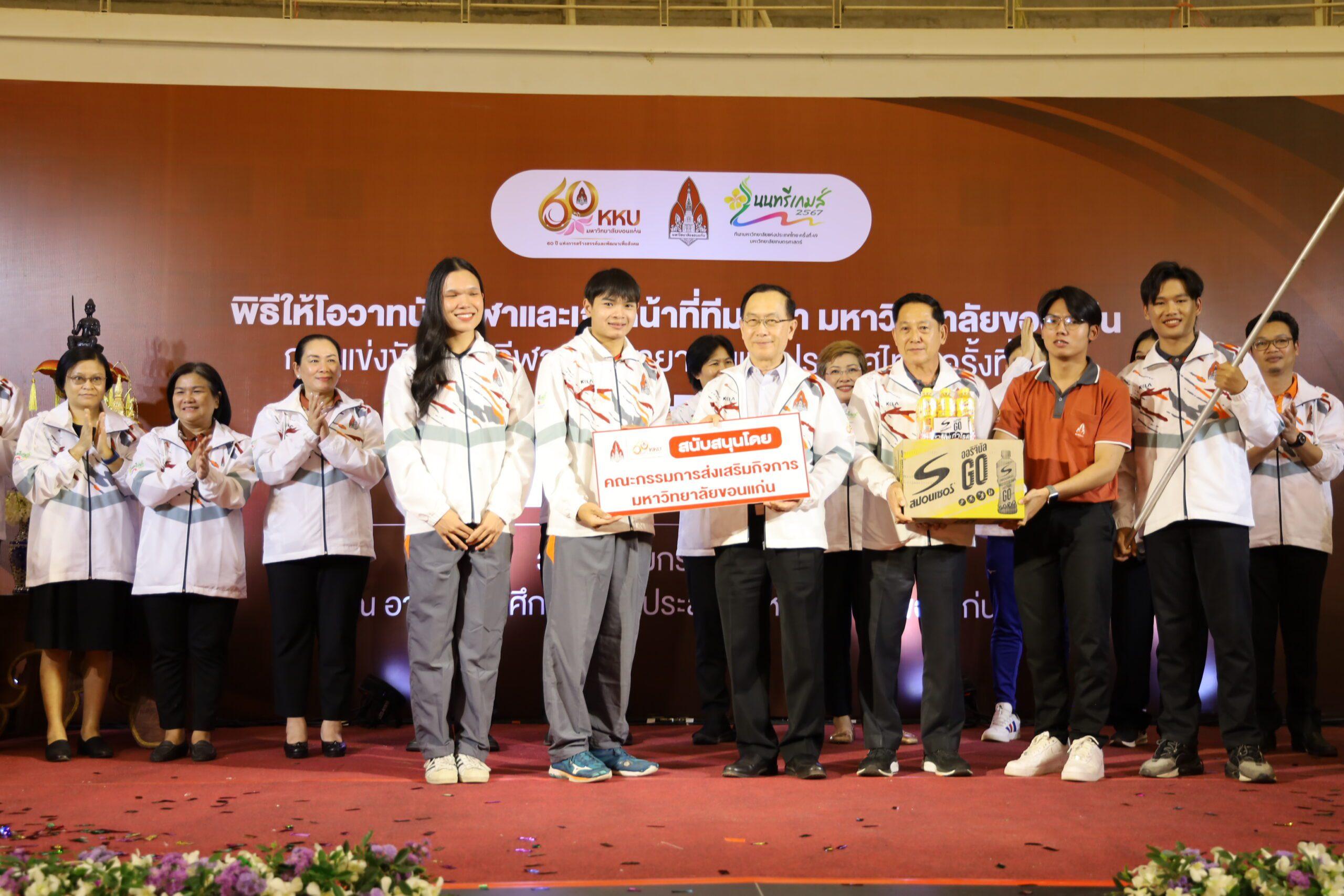 ในโอกาสนี้ นายสุกิจ ศิรินรกุล ประธานคณะกรรมการส่งเสริมกิจการมหาวิทยาลัยขอนแก่น ให้การสนับสนุนเครื่องดื่มเกลือแร่ เพื่อมอบเป็นสวัสดิการและขวัญกำลังใจแก่ทัพนักกีฬามหาวิทยาลัยขอนแก่น จำนวน 100 ลัง มูลค่ากว่า 36,000 บาท