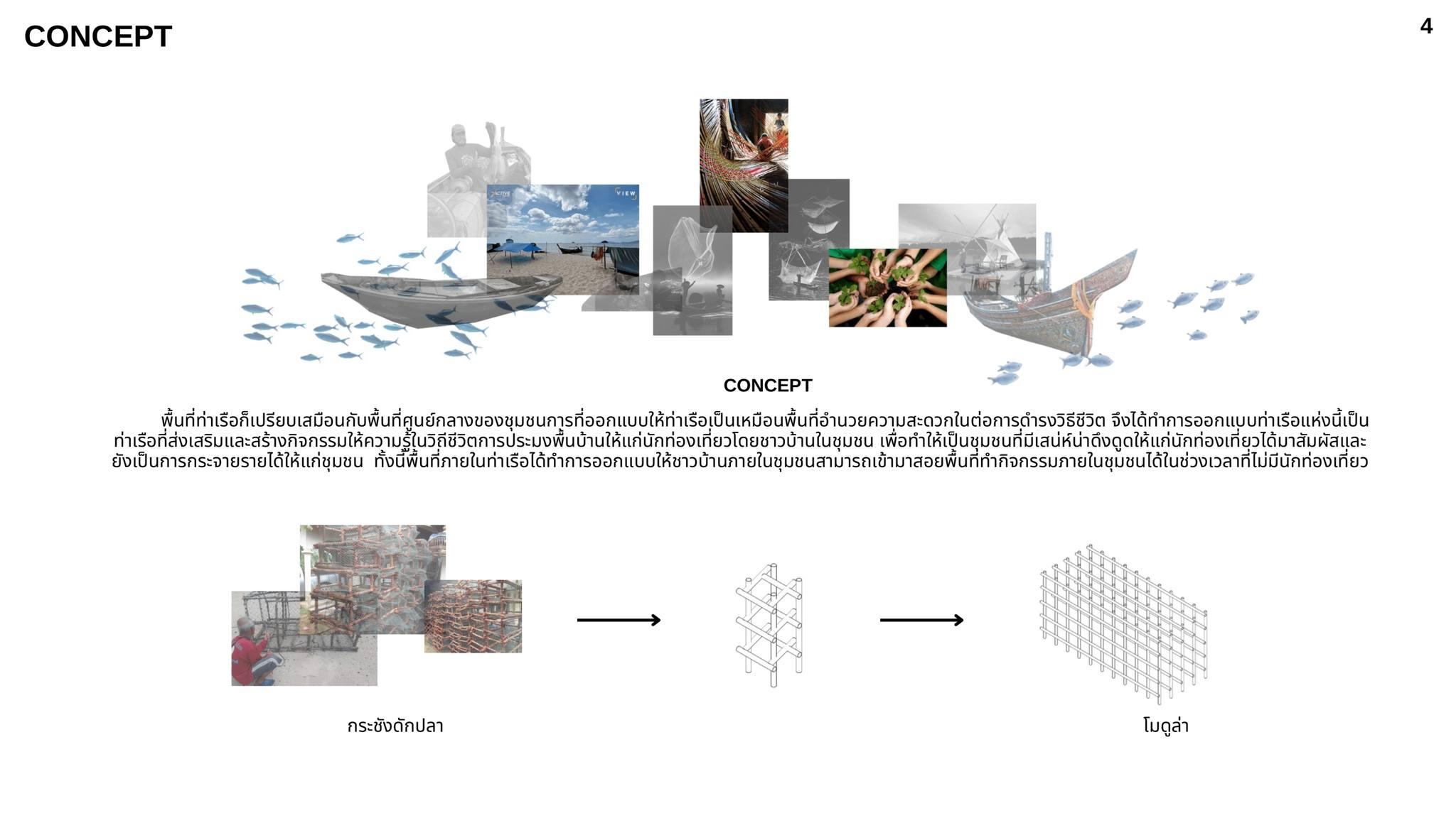 นางสาวปัญจภรณ์ คงสำโรง ตัวแทนผู้ที่ได้รับรางวัลรองชนะเลิศอันดับ 2 ให้สัมภาษณ์ถึงแนวคิดในการออกแบบก็มาจากการที่เราเริ่มศึกษาวิถีชีวิตของชาวบ้าน จากการไปลงพื้นที่จริง ทำให้เราเนี่ยเห็นถึงการใช้ชีวิต และ คิดว่า ชาวประมงต้องคู่กับเรือ จึงนำ “เรือ สะท้อน ชีวิต ” มาเป็นแนวคิดหลักในการพัฒนาแบบต่อร่วมด้วยค่ะ และต้องขอขอบคุณอาจารย์ที่ปรึกษาในครั้งนี้ด้วยที่ อาจารย์เดินทางไปพร้อมกับพวกเราและก็คอยแนะนำตลอดค่ะ