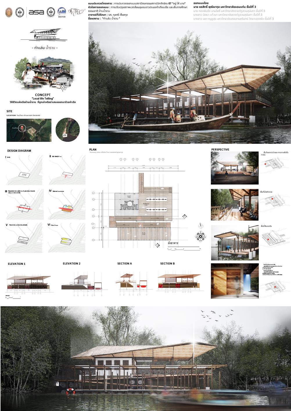 นายชลสิทธิ์ พุฒิษากุล ตัวแทนผู้ที่ได้รับรางวัลชนะเลิศได้ให้สัมภาษณ์ว่า ชื่อผลงาน ท่าแล่น-น้ำราบ มีแนวคิดการออกแบบเกิดมาจากการได้ลงไปเห็นไป รับฟังผู้คนในหมู่บ้าน ได้ทำกิจกรรมร่วมกับพวกเขาและได้รับรู้ความเป็นไปเป็นมา ว่าชาวบ้านน้ำราบ กับเรือถือเป็นของคู่กัน เราจึงอยากนำเสนอวิถีชีวิตของพี่น้องชาวน้ำราบอย่างตรงไปตรงมาในเชิงสัญลักษณ์ จึงหยิบยก เรื่องราวของ เรือหัวโทง ซึ่งเป็นเรือพื้นถิ่น มานำเสนอเป็นรูปแบบอาคาร ท่าเรือ โดยจะออกแบบให้มีความน่าสนใจ เด็ดขาด เป็นทั้งท่าเรือ ศาลาประชาคนและแลนด์มาร์คเล็ก ๆของหมู่บ้านด้วย ตัวผมมีหน้าที่เป็นผู้นำทีม คอยแจกแจงงานและรับหน้าที่ออกแบบอาคารหลัก