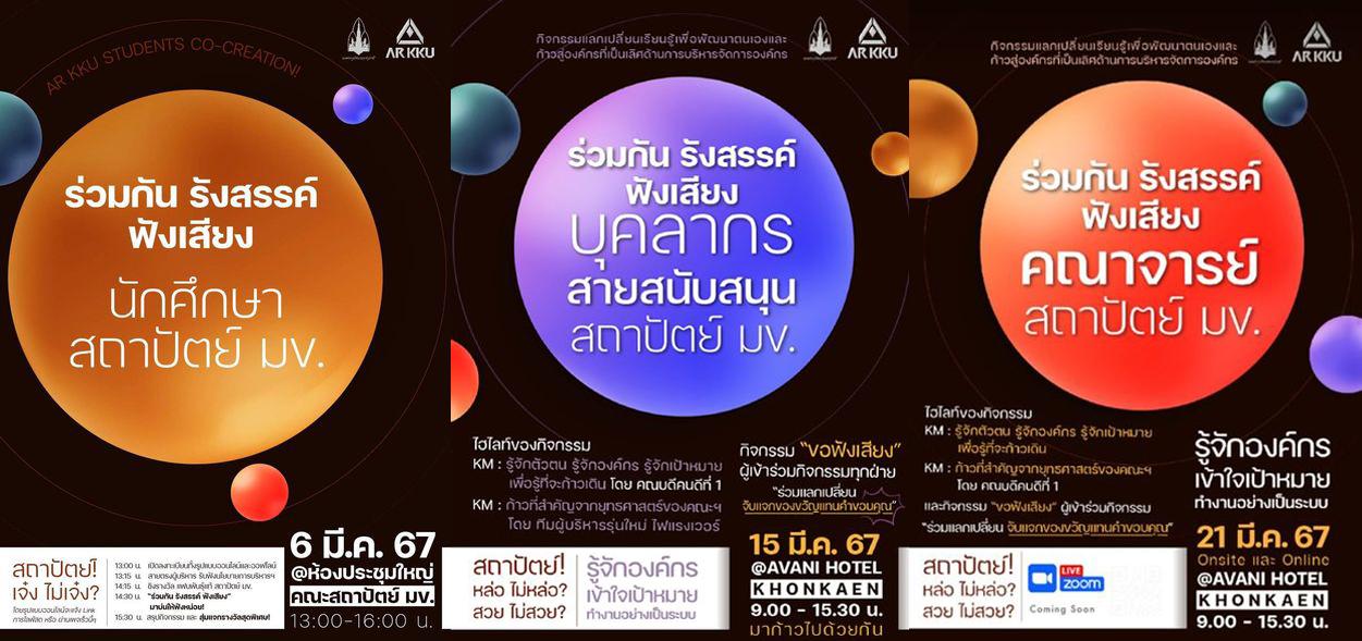 ช่วงที่ 1 กิจกรรม Co-creation ร่วมกัน รังสรรค์ ฟังเสียง (น้องพี่สถาปัตย์และเครือข่าย ภาคี คู่ความร่วมมือ) ในวันที่ 6 มีนาคม 2567 แบ่งเป็น 2 กลุ่มเป้าหมาย ได้แก่ ศิษย์เก่าและเครือข่ายภาคี (ช่วงเช้า) ณ อาคารห้องประชุม 1113 และ ตัวแทนนักศึกษา (ช่วงบ่าย) ณ ห้องประชุมใหญ่ คณะสถาปัตยกรรมศาสตร์ มหาวิทยาลัยขอนแก่น