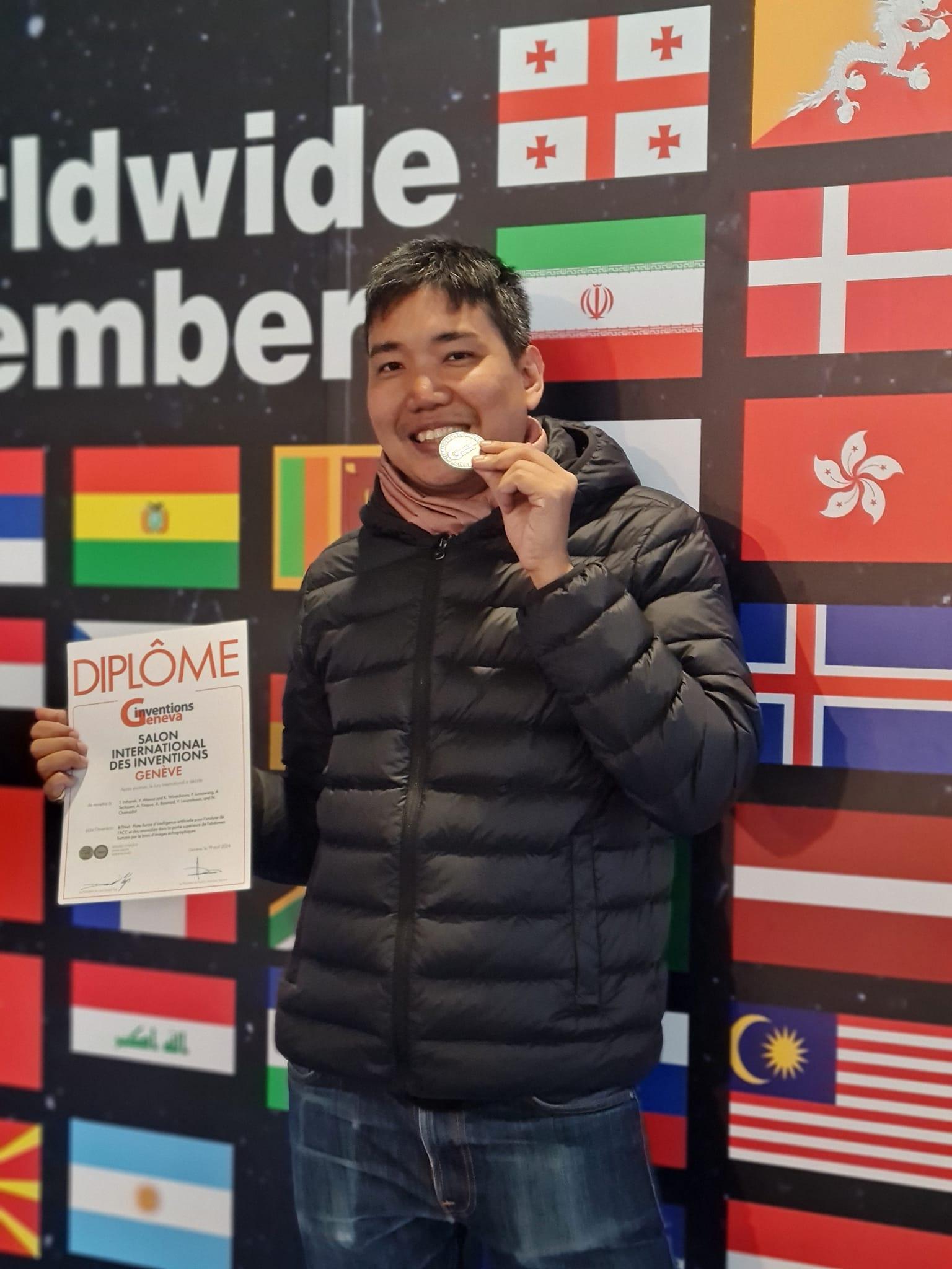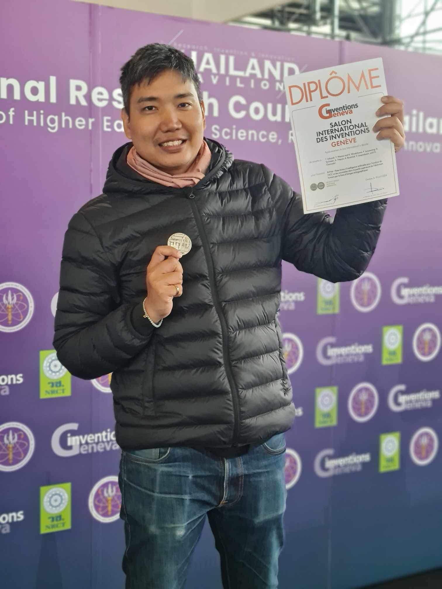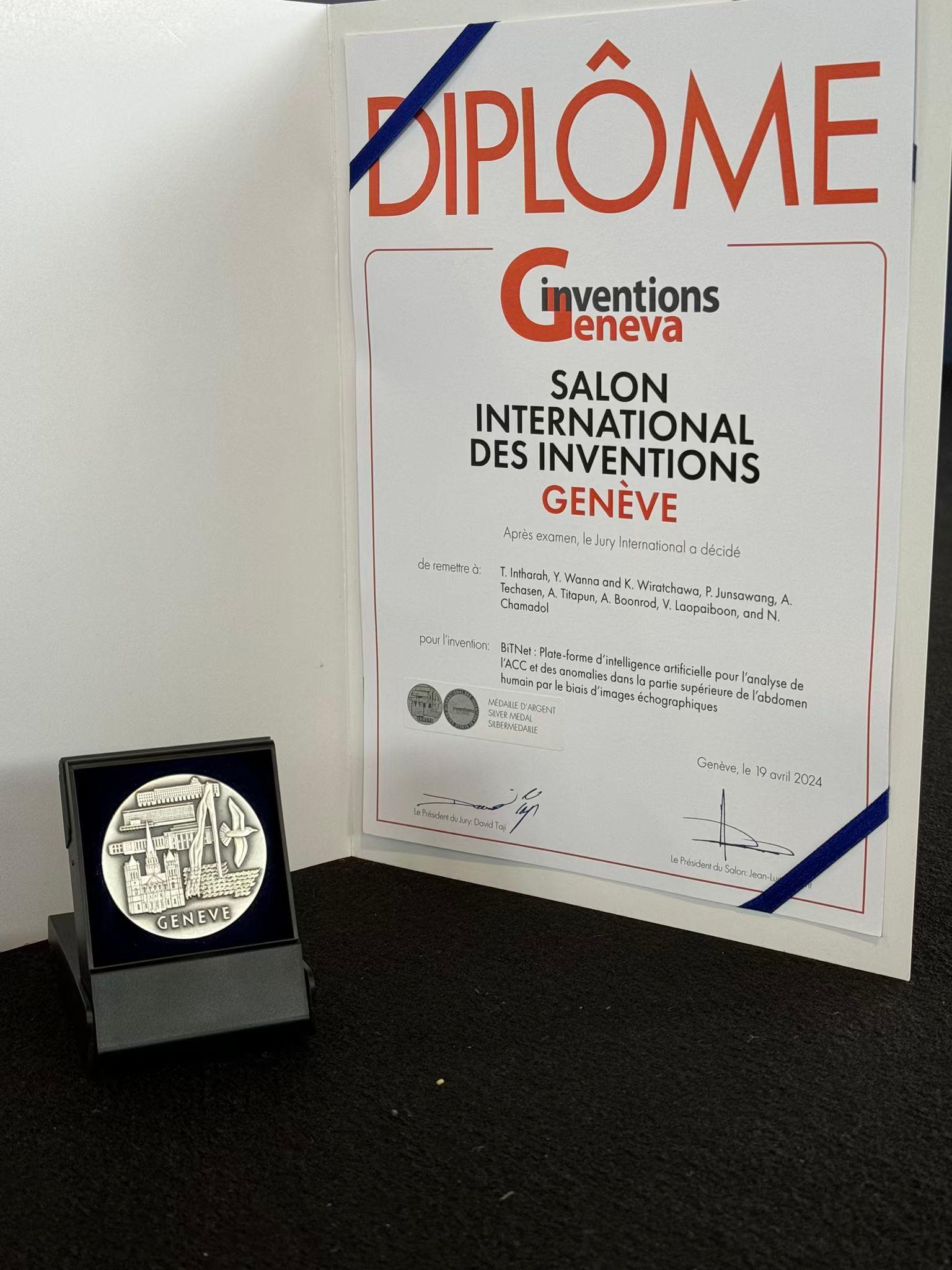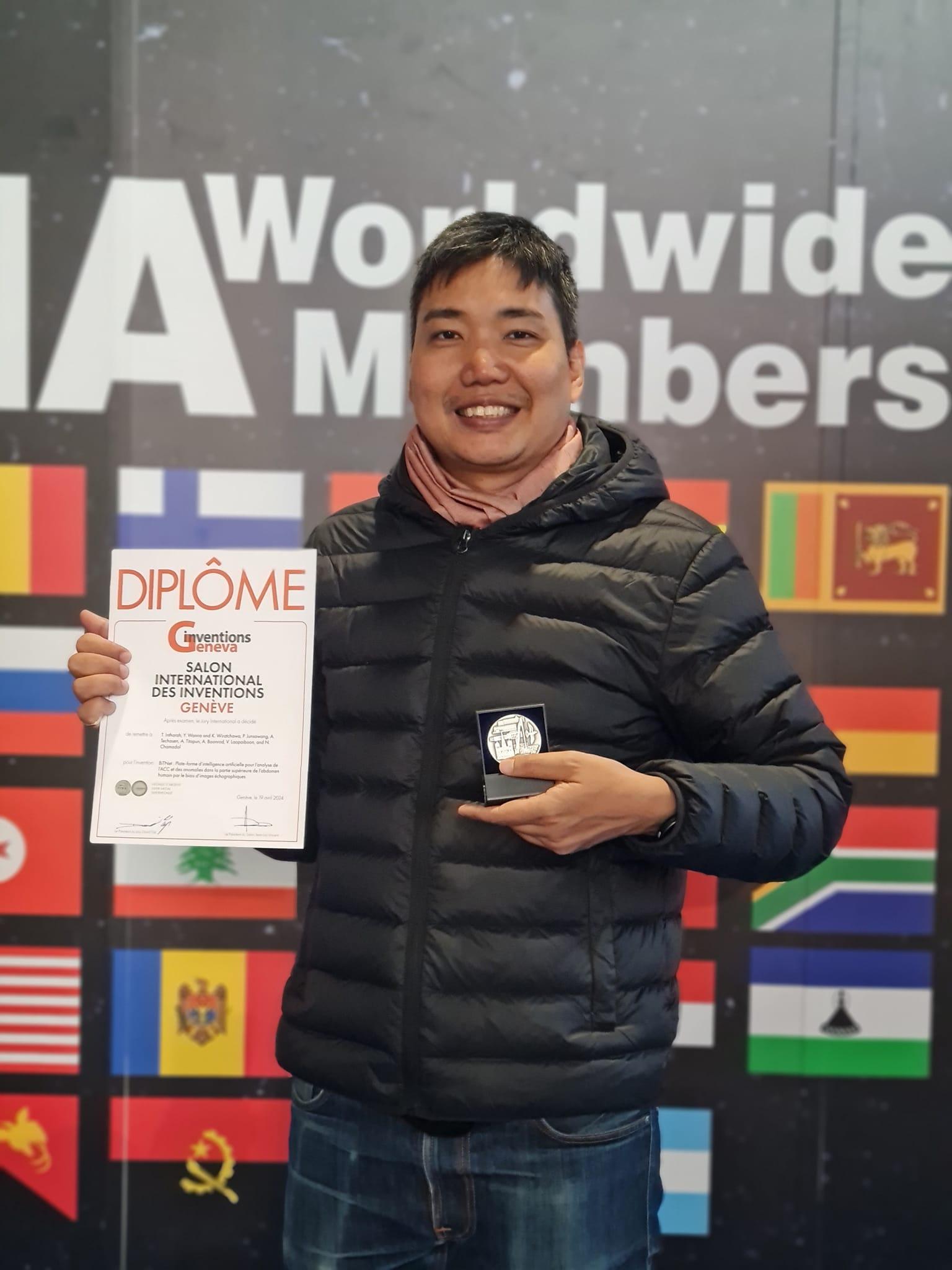 ผศ. ดร.ธนพงศ์ อินทระ สาขาวิชาสถิติ คณะวิทยาศาสตร์ หัวหน้าทีมผู้พัฒนานวัตกรรม “BiTNet ระบบปัญญาประดิษฐ์สำหรับตรวจคัดกรองความเสี่ยงมะเร็งท่อน้ำดีและความผิดปกติในช่องท้องส่วนบนจากภาพถ่ายอัลตราซาวน์” ได้รับรางวัลเหรียญเงิน จากการร่วมประกวดผลงานนวัตกรรมสิ่งประดิษฐ์ในงาน “The 49th International Exhibition of Inventions Geneva” ณ นครเจนีวา สมาพันธรัฐสวิส ซึ่งภายในงานฯ มีผลงานเข้าร่วมประกวดและจัดแสดงนิทรรศการกว่า 1,000 ผลงาน จากนานาประเทศกว่า 40 ประเทศ ระหว่างวันที่ 17-21 เมษายน 2567 ที่ผ่านมา