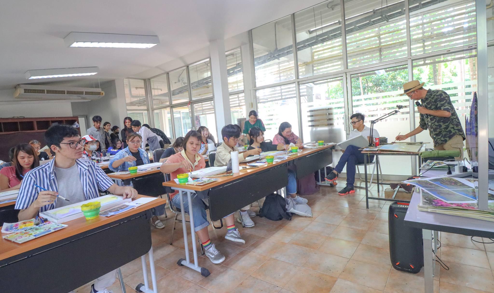 ผู้ช่วยศาสตราจารย์ ดร.พรณรงค์ ชาญนุวงศ์ อาจารย์ประจำสาขาวิชาสถาปัตยกรรมศาสตร์ วิทยากรในครั้งนี้ เผยที่มาที่ไปและแรงบันดาลใจในการวาดสีน้ำว่า เริ่มต้นจากความหลงใหลในงานออกแบบและการวาดรูป บวกกับประสบการณ์การเรียนสถาปัตยกรรมศาสตร์ที่จุฬาลงกรณ์มหาวิทยาลัย ซึ่งเปิดโอกาสให้ได้สัมผัสกับสีน้ำที่มีคุณภาพ จุดประกายความสนใจจนนำมาสู่การฝึกฝนและพัฒนาฝีมืออย่างต่อเนื่อง ปัจจุบันอาจารย์พรณรงค์มีผลงานสีน้ำมากมาย และยังเปิดแกลเลอรี่ส่วนตัวเพื่อแบ่งปันผลงานและแรงบันดาลใจ ผู้เข้าร่วมมีหลากหลายวัย ฝึกฝนทักษะและปลดปล่อยจินตนาการ ให้ผู้เข้าร่วมได้ฝึกฝนทักษะการวาดสีน้ำในบรรยากาศสบายๆ โดยไม่จำเป็นต้องมีพื้นฐานมาก่อน ผู้เข้าร่วมมีทั้งนักเรียนมัธยม ศิษย์เก่าคณะสถาปัตยกรรมศาสตร์ บุคคลทั่วไป และผู้สูงอายุ ทุกคนต่างตั้งใจวาดภาพตามโจทย์ที่กำหนดไว้ ซึ่งเป็นการฝึกฝนการมอง การคิดวิเคราะห์ และปลดปล่อยจินตนาการผ่านสีสัน ซึ่งหวังว่าผู้เข้าร่วมเวิร์คช็อปครั้งนี้ จะได้รับแรงบันดาลใจ ค้นพบมุมมองใหม่ในการวาดภาพ และกล้าที่จะแสดงออกผ่านสีน้ำ