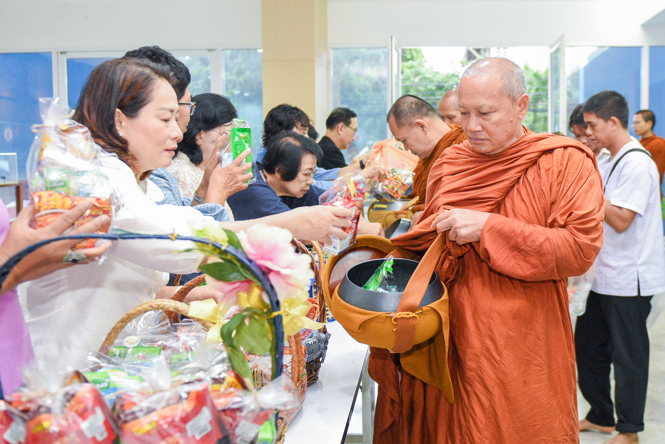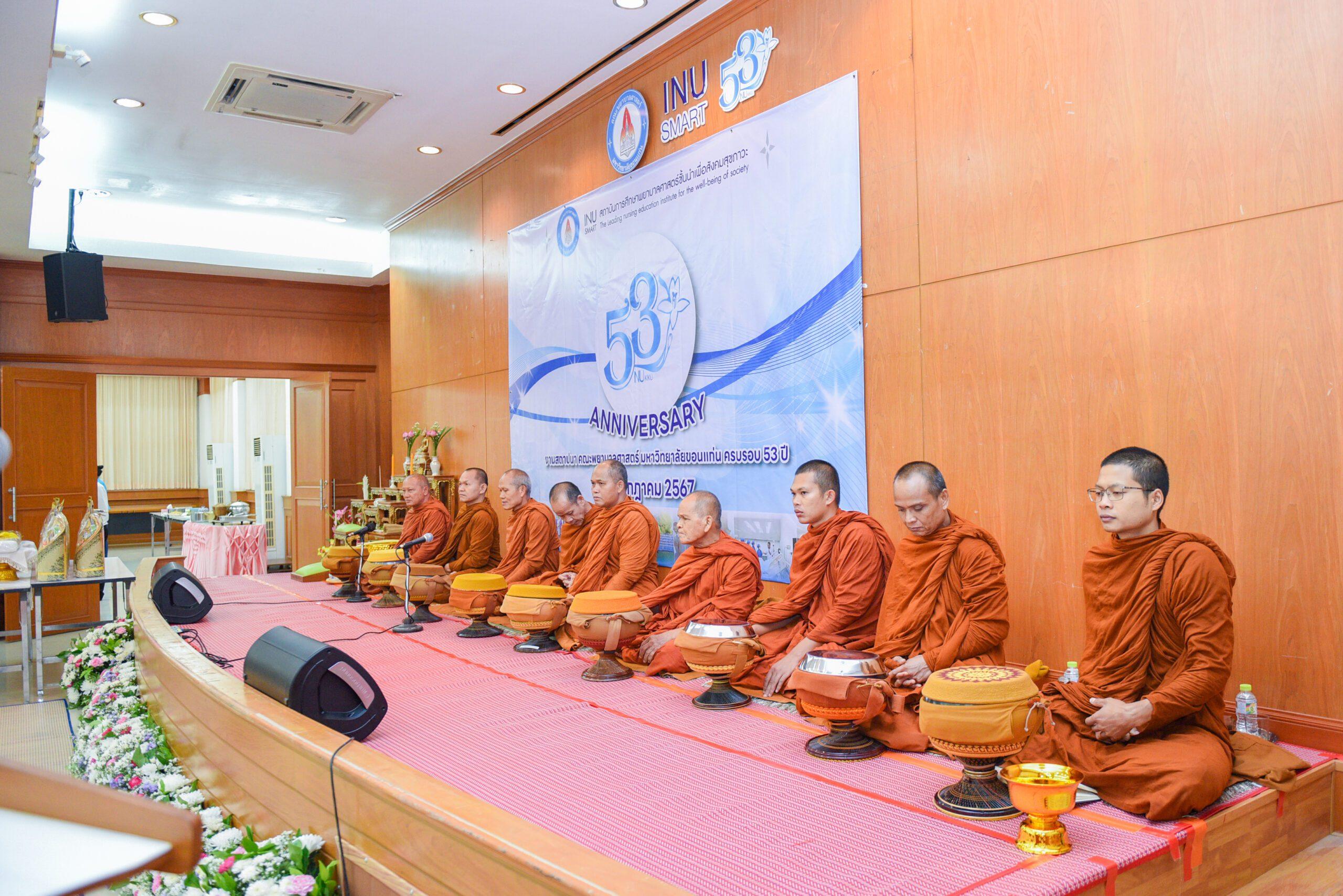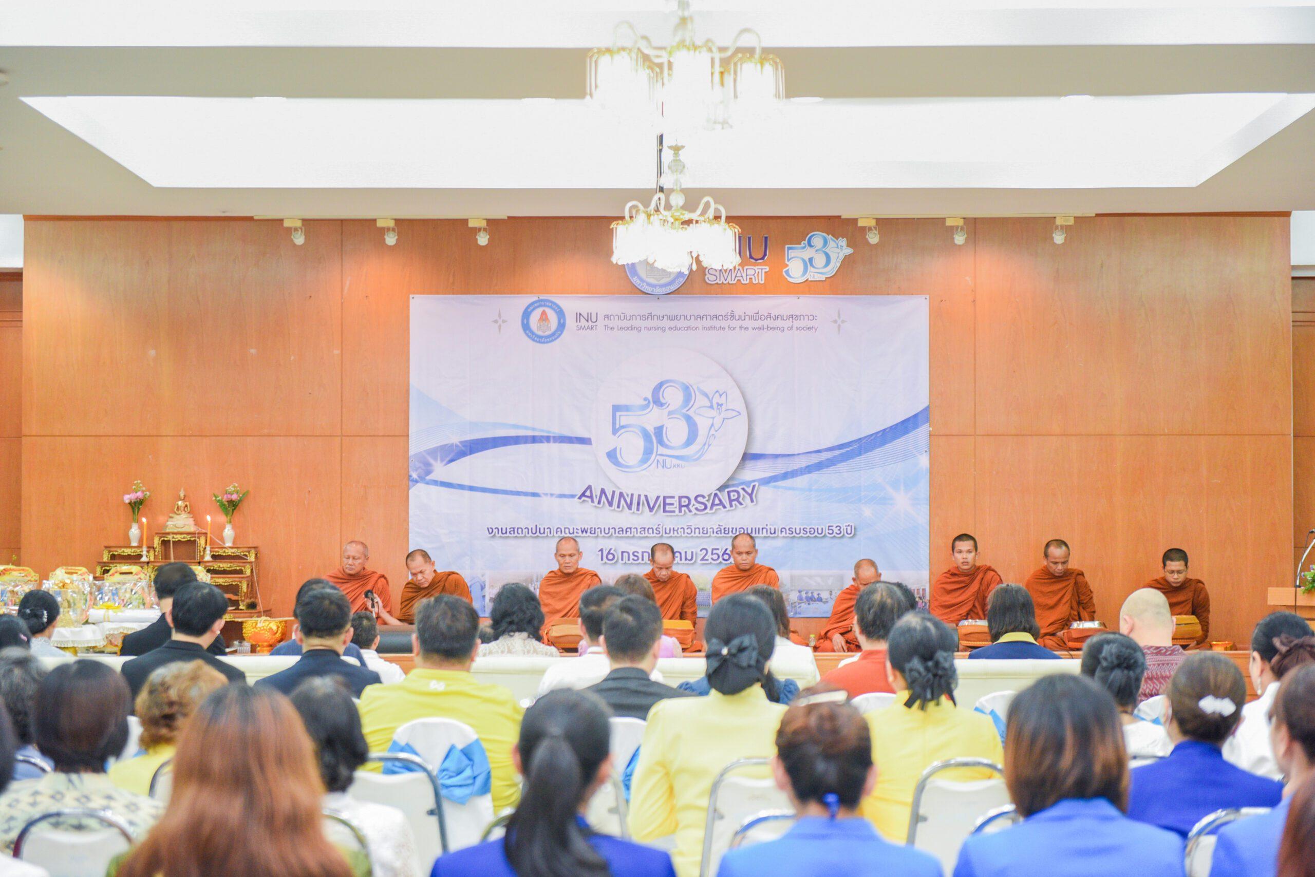 ภายในงาน (ภาคเช้า) ได้มีกิจกรรมทำบุญตักบาตร ถวายภัตตาหารเช้าแด่พระสงฆ์ จำนวน 9 รูป และพิธีสวดเจริญพุทธมนต์ เพื่อความเป็นสิริมงคล แก่ผู้บริหาร อาจารย์ บุคลากร และนักศึกษา คณะพยาบาลศาสตร์ มหาวิทยาลัยขอนแก่น และเพื่อรักษาวัฒนธรรมขนบธรรมเนียมประเพณีอันดีงาม พร้อมร่วมรำลึกและภาคภูมิใจ ในประวัติและผลงานของคณะฯ รวมถึงการประกอบกุศลกิจเพื่อประโยชน์แก่สังคม