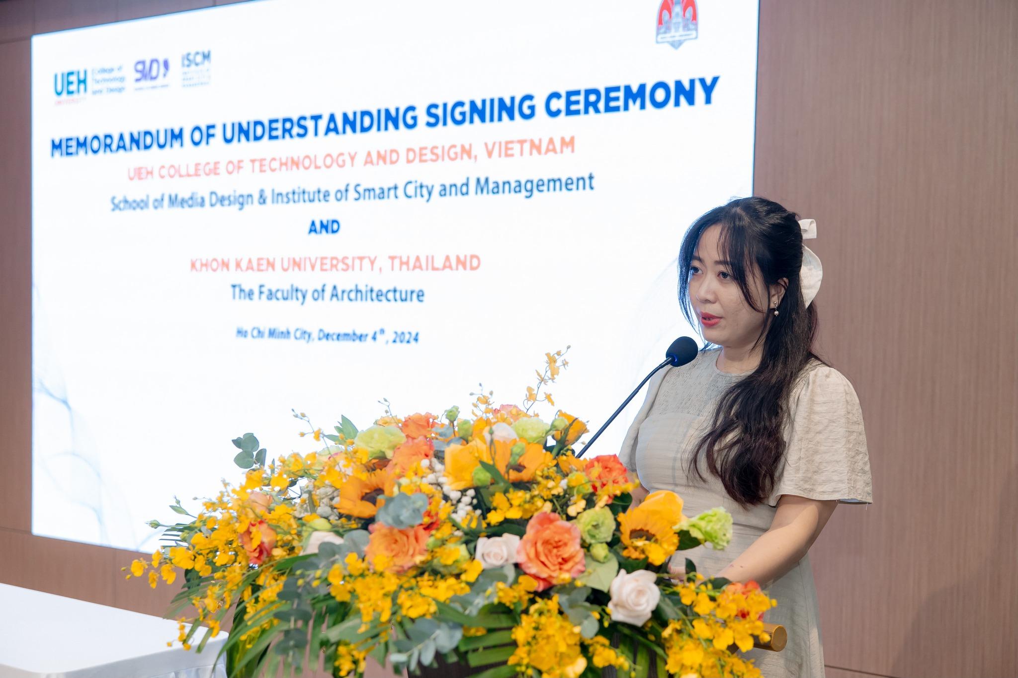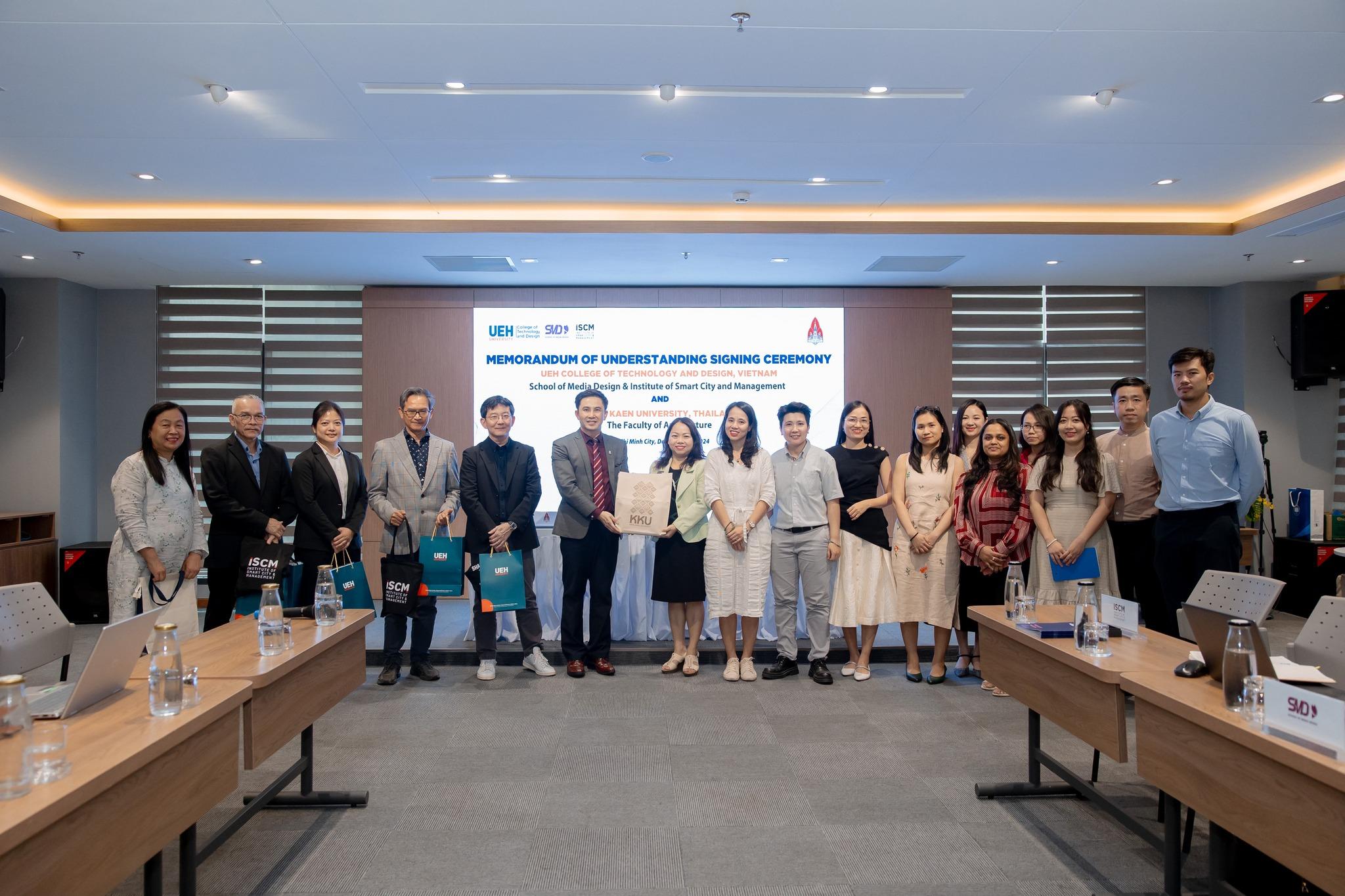 สำหรับความร่วมมือกับคณะสถาปัตยกรรมและศิลปะ มหาวิทยาลัย Ho Chi Minh City University of Technology (HuTech) ได้รับเกียรติจาก Assoc.Prof.Dr.Nguyen Thanh Phuong รองอธิการบดี และ Nguyen Thi Ngoc Quyen คณบดีคณะสถาปัตยกรรมและศิลปะ ร่วมลงนาม โดยมีขอบเขตความร่วมมือที่สำคัญ ได้แก่ การเปิดวิชาสอนร่วมกันสำหรับนักศึกษาระดับปริญญาตรีของทั้งสองคณะในเดือนมิถุนายน 2568 เช่น วิชา Design and Architectural Presentation และวิชา Basic Principles of Design การรับอาจารย์จาก HuTech เข้าศึกษาต่อระดับปริญญาเอกที่คณะสถาปัตยกรรมศาสตร์ มหาวิทยาลัยขอนแก่น ในหลักสูตรการวิจัยเชิงบูรณาการด้านการออกแบบเซรามิก ปีการศึกษา 2568 รวมถึงการจัดโครงการและนิทรรศการคู่ขนาน และการทัศนศึกษาเชิงวัฒนธรรมสร้างสรรค์