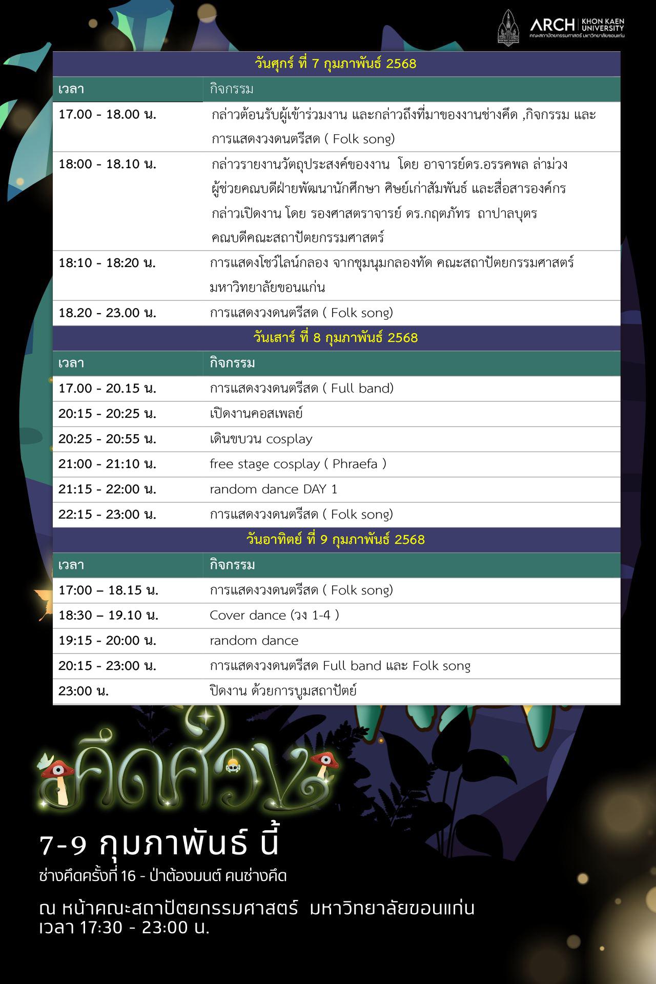คณะสถาปัตยกรรมศาสตร์ มหาวิทยาลัยขอนแก่น ขอเชิญทุกท่านที่สนใจร่วม “เทศกาลช่างคึด ครั้งที่ 16” ภายใต้ธีม 🦋✨️ “ท่องไปในโลกป่าพิศวง ของคนช่างคึด”