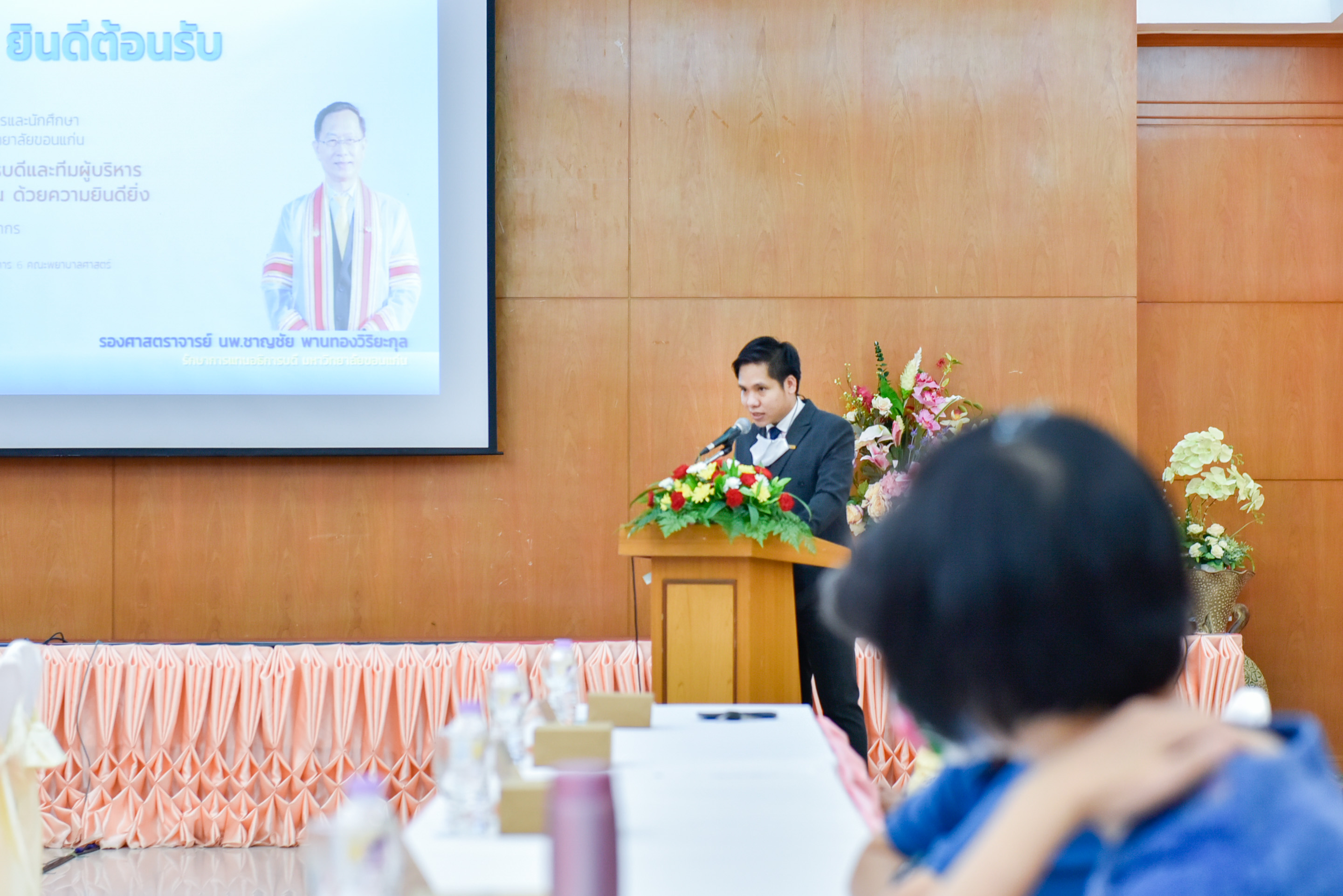 หลังจากนั้น รองศาสตราจารย์ นพ.ชาญชัย พานทองวิริยะกุล รักษาการแทนอธิการบดี ได้กล่าวถึงวัตถุประสงค์ในการเดินทางมาพบปะผู้บริหาร อาจารย์และบุคลากร ว่า “ขอชื่นชมคณะพยาบาลศาสตร์ ที่มีความก้าวหน้าและมีการพัฒนาอย่างเห็นได้ชัด และได้รับความสำเร็จมาเป็นอย่างดี และได้ให้คำแนะนำในประเด็นที่คณบดีนำเสนอนโยบาย รวมถึงเรื่องของแผนยุทธศาสตร์ของคณะเชื่อมโยงไปถึงแผนยุทธศาสตร์ของมหาวิทยาลัยเพื่อดำเนินไปในทิศทางเดียวกัน และเรื่องสถานการณ์ Covid-19 ตามที่ท่านคณบดีได้นำเสนอ ถึงการดูแลนักศึกษาถือวาครอบคลุมในทุกด้าน และขอชื่นชมศูนย์ความเป็นเลิศการพัฒนาเด็กปฐมวัย คณะพยาบาลศาสตร์ ที่ได้รับการับรองมาตรฐาน ด้านการบริหารจัดการสถานพัฒนาเด็กปฐมวัย ซึ่งเป็นสถานที่ดูแลเด็กๆ ที่มีชื่อเสียงแห่งหนึ่งใน จ.ขอนแก่น