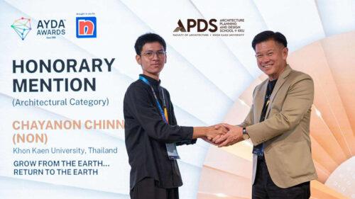 คณะสถาปัตยกรรมศาสตร์ มหาวิทยาลัยขอนแก่น ขอแสดงความยินดีกับ นายชญานนท์ ชิณวงค์ นักศึกษาสาขาสถาปัตยกรรมศาสตร์ ชั้นปีที่ 5 ในฐานะตัวแทนประเทศไทย สามารถคว้ารางวัล Honorary Mention (Architectural Category) จากผลงาน “Grow from the earth…. Return to the earth” ในเวที AYDA International Awards Summit 2025 ณ ประเทศญี่ปุ่น