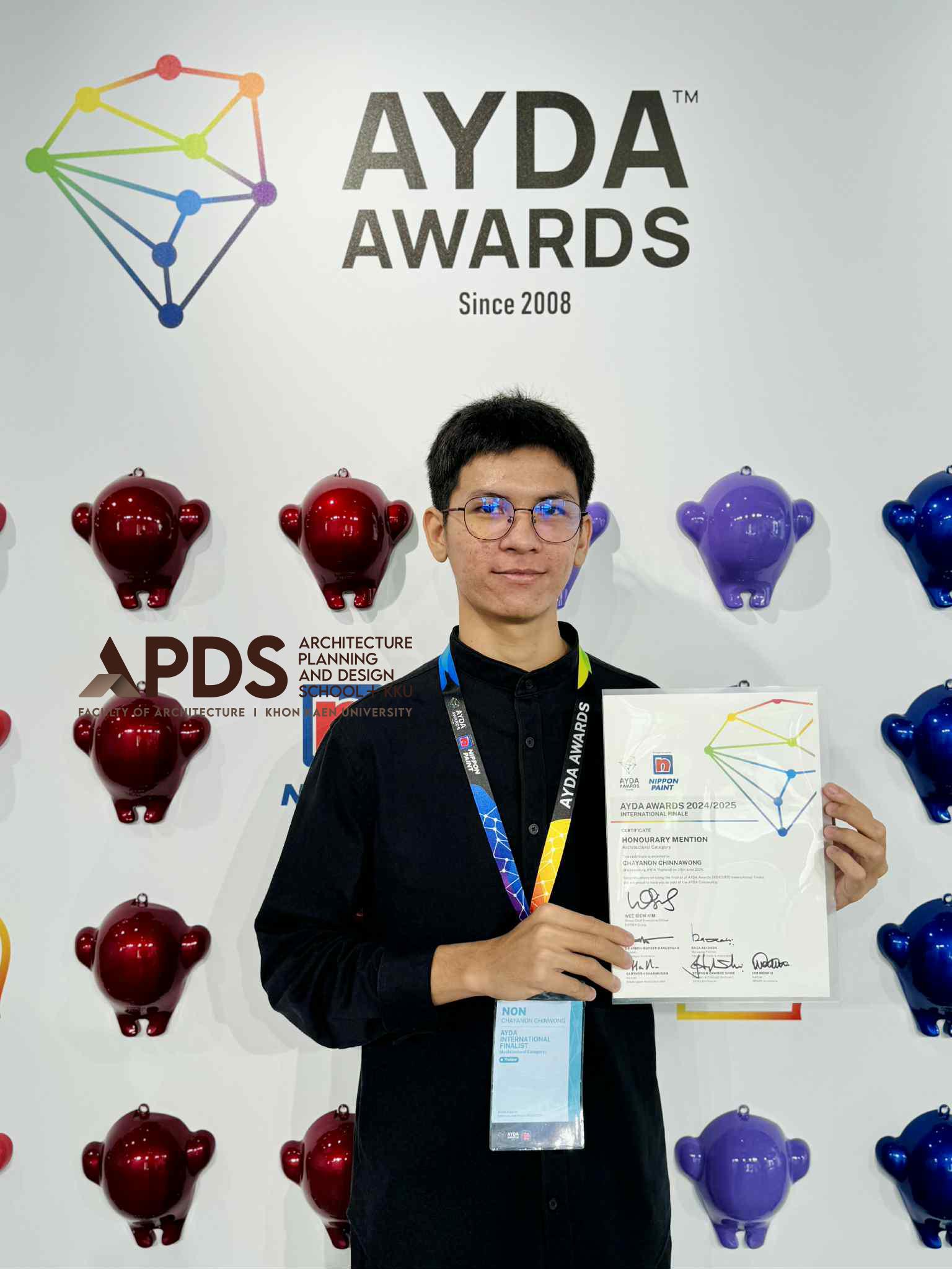 คณะสถาปัตยกรรมศาสตร์ มหาวิทยาลัยขอนแก่น ขอแสดงความยินดีกับ นายชญานนท์ ชิณวงค์ นักศึกษาสาขาสถาปัตยกรรมศาสตร์ ชั้นปีที่ 5 ในฐานะตัวแทนประเทศไทย สามารถคว้ารางวัล Honorary Mention (Architectural Category) จากผลงาน “Grow from the earth…. Return to the earth” ในเวที AYDA International Awards Summit 2025 ณ ประเทศญี่ปุ่น