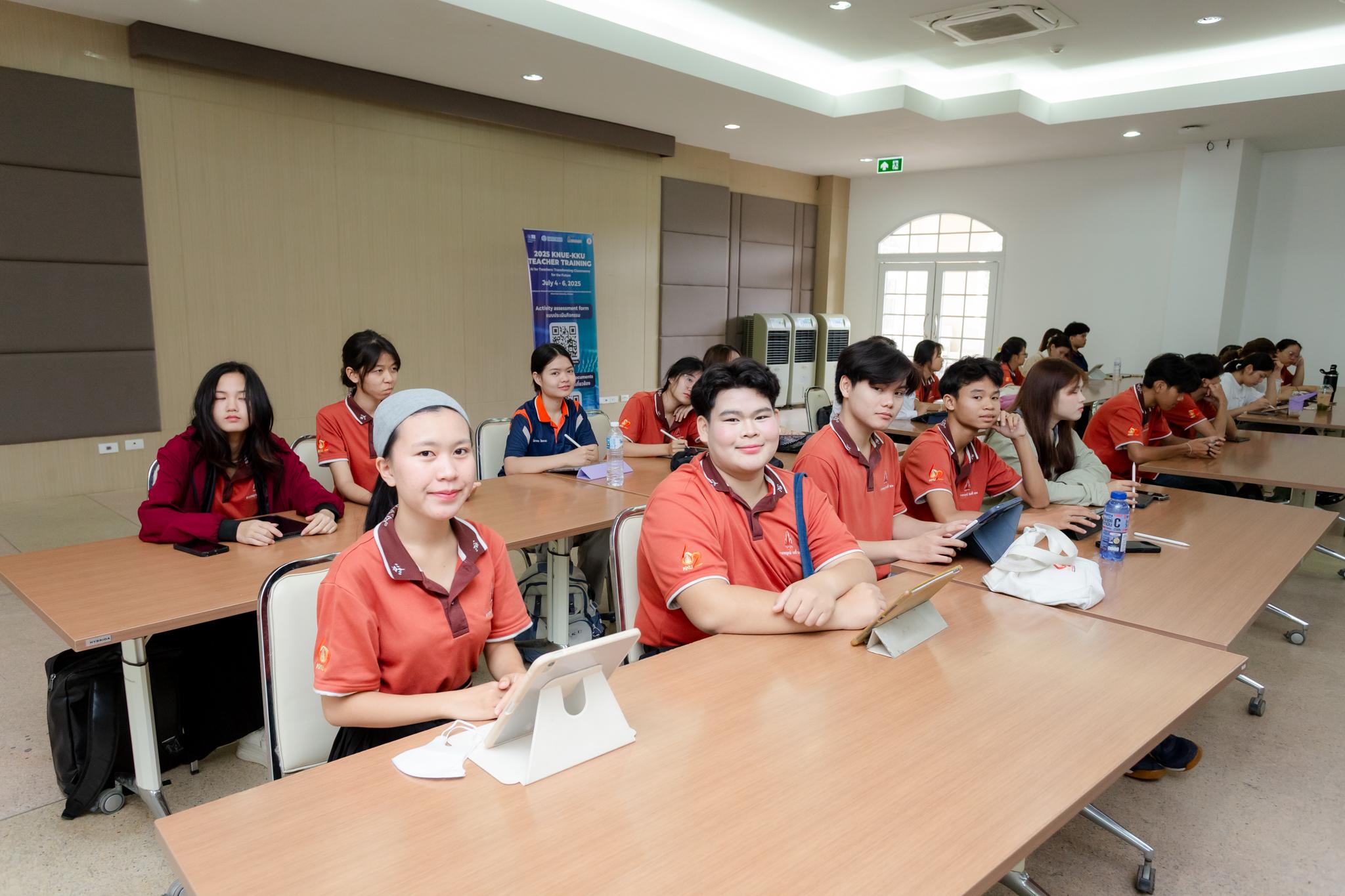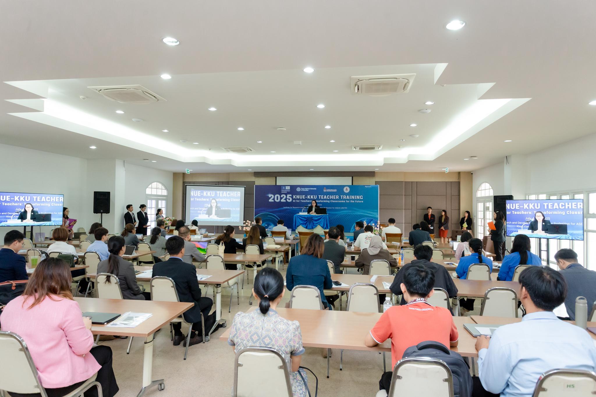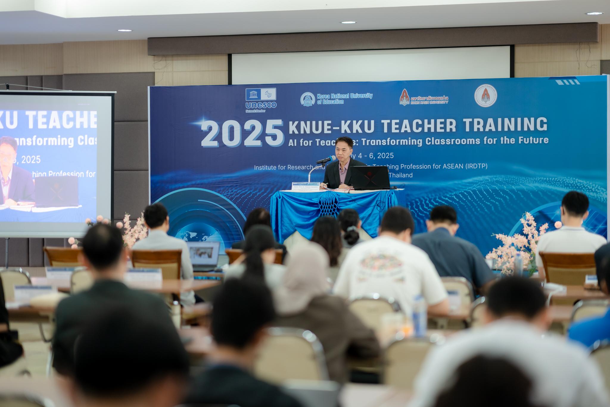 เมื่อวันที่ 4 กรกฎาคม 2568 สถาบันวิจัยและพัฒนาวิชาชีพครูสำหรับอาเซียน มหาวิทยาลัยขอนแก่น จัดพิธีเปิดโครงการอบรมเชิงปฏิบัติการ 2025 KNUE-KKU UNITWIN Teacher Training Program for Quality Teacher Education ภายใต้หัวข้อ “AI for Teachers: Transforming Classrooms for the Future” โดยมี อาจารย์ณัฐสมล ธนกุลรังสฤษดิ์ รองอธิการบดีฝ่ายกฎหมายและสื่อสารองค์กร มหาวิทยาลัยขอนแก่น เป็นประธานในพิธี พร้อมด้วย Prof. Dr. Younghoon Kim ผู้อำนวยการโครงการ UNESCO UNITWIN จาก Korea National University of Education และ ผู้ช่วยศาสตราจารย์สกาวเดือน ซาธรรม รองผู้อำนวยการสถาบันวิจัยและพัฒนาวิชาชีพครูสำหรับอาเซียน ร่วมงาน ในการนี้มีวิทยากรผู้ทรงคุณวุฒิจากประเทศเกาหลีใต้ ญี่ปุ่น และไทย รวมถึงครูและผู้เข้าร่วมอบรมเข้าร่วมงาน ณ สถาบันวิจัยและพัฒนาวิชาชีพครูสำหรับอาเซียน มหาวิทยาลัยขอนแก่น