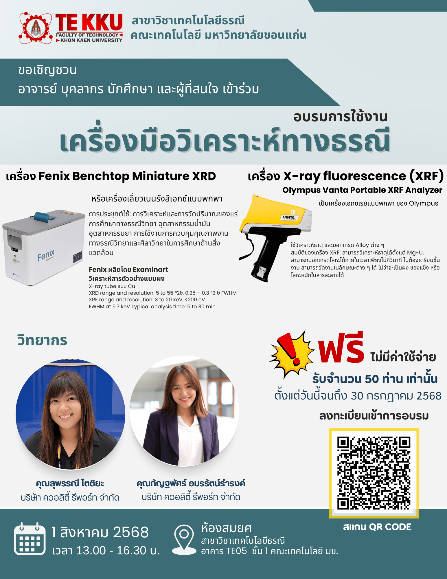 คณะเทคโนโลยี มหาวิทยาลัยขอนแก่น ขอเชิญชวนเข้าร่วมอบรมเชิงปฏิบัติการ “การใช้งานเครื่องมือวิเคราะห์ทางธรณี”
