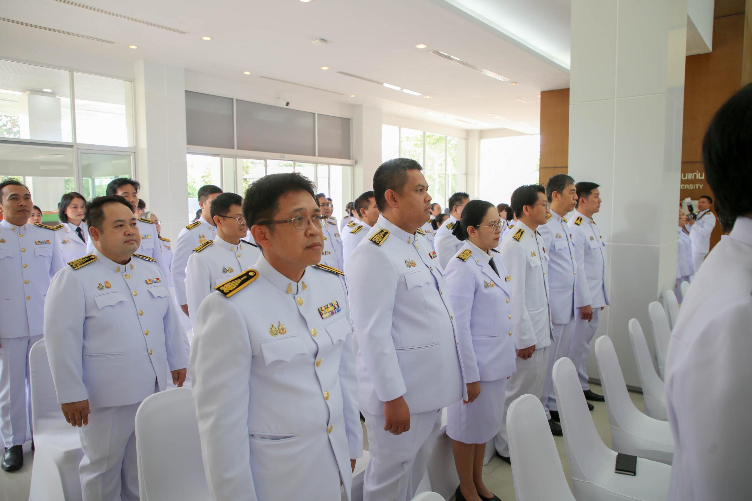 พิธีการเริ่มจาก ท่านประธานในพิธี รศ.นพ. ชาญชัย พานทองวิริยะกุล อธิการบดี และภริยา ดร.เอื้อนจิต พานทองวิริยะกุล ถวายความเคารพเบื้องหน้าพระบรมฉายาลักษณ์ พระบาทสมเด็จพระเจ้าอยู่หัว พร้อมเปิดกรวยกระทงดอกไม้ ธูปเทียนแพ และถวายความเคารพพระบรมฉายาลักษณ์ จากนั้นประธานนำผู้เข้าร่วมพิธี กราบบังคมทูลถวายพระพร