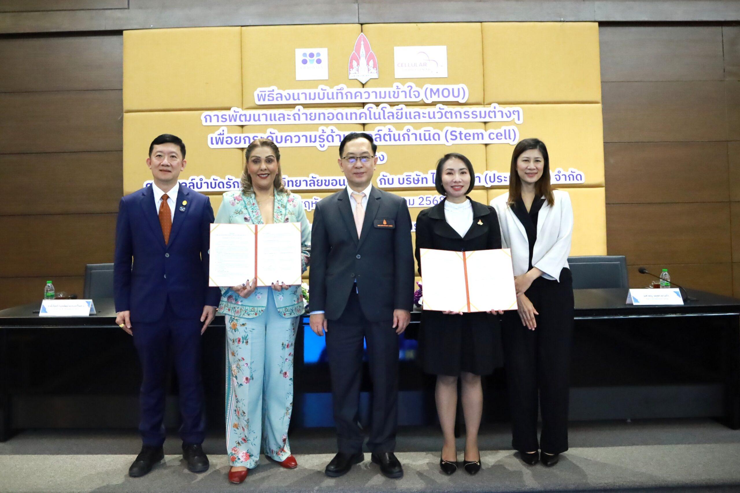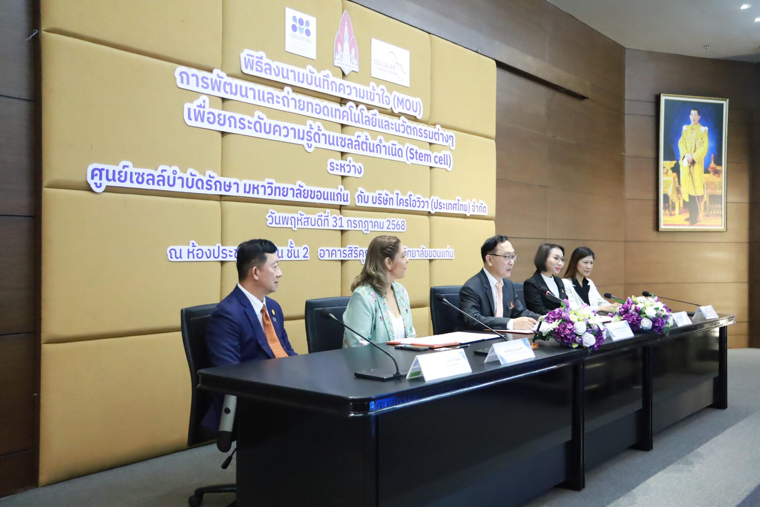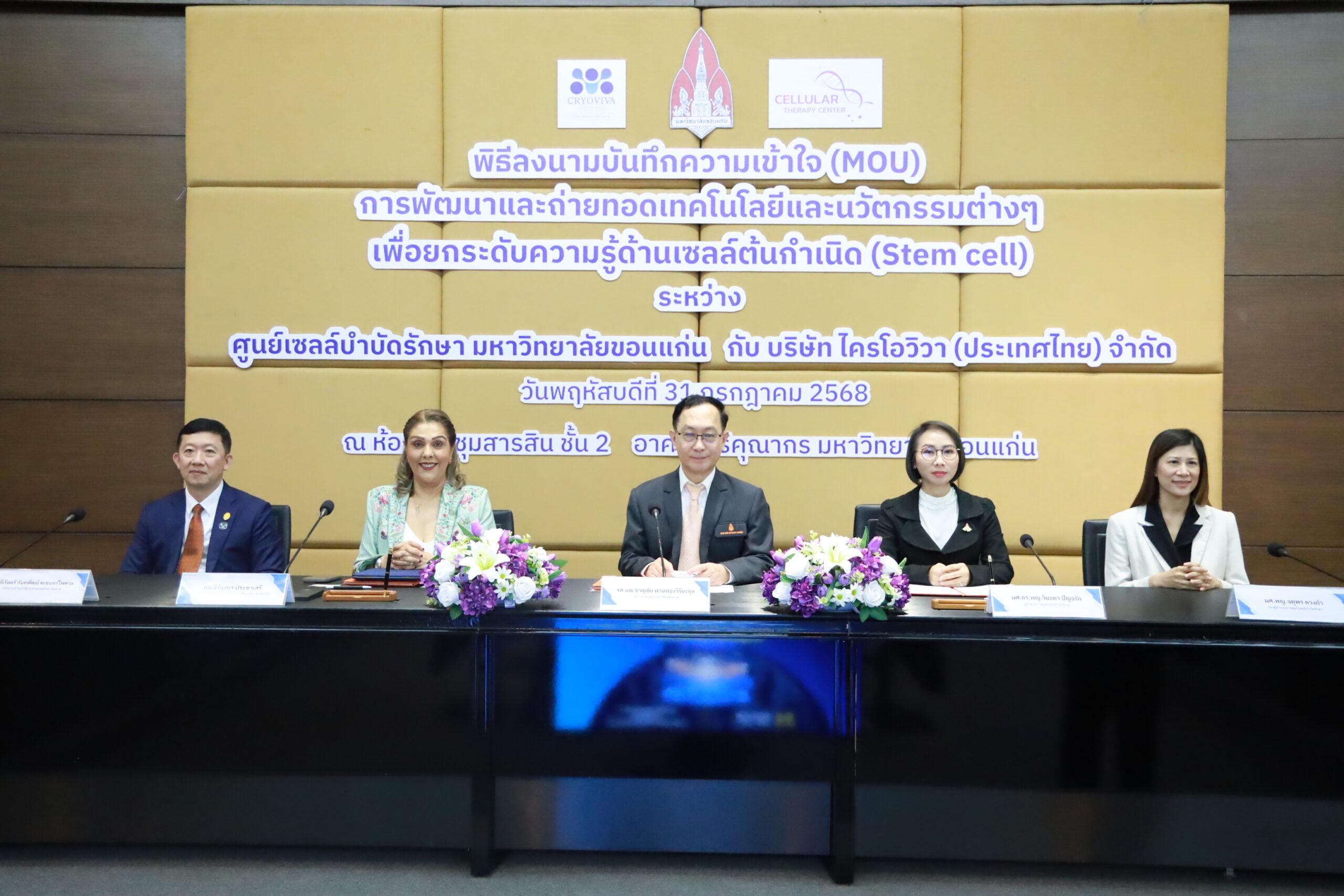 เมื่อวันที่ 31 กรกฎาคม 2568 ศูนย์เซลล์บำบัดรักษา มหาวิทยาลัยขอนแก่น ร่วมกับ บริษัท ไครโอวิวา (ประเทศไทย) จำกัด จัดพิธีลงนามบันทึกข้อตกลงความร่วมมือ (MOU) เพื่อการพัฒนาและถ่ายทอดเทคโนโลยีและนวัตกรรมด้านเซลล์ต้นกำเนิด โดยมี รศ.นพ.ชาญชัย พานทองวิริยะกุล อธิการบดีมหาวิทยาลัยขอนแก่น และ คุณจิรัญญา ประชาเสรี ประธานกรรมการบริหาร ภูมิภาคเอเชียตะวันออกเฉียงใต้ บริษัท ไครโอวิวา (ประเทศไทย) จำกัด พร้อมด้วย ผศ.ดร.แพทย์หญิง วิยะดา ปัญจรัก ผู้อำนวยการศูนย์เซลล์บำบัดรักษา และคณาจารย์จากสาขาวิชาที่เกี่ยวข้องเข้าร่วมพิธี ณ ห้องประชุมสารสิน ชั้น 2 อาคารสิริคุณากร มหาวิทยาลัยขอนแก่น