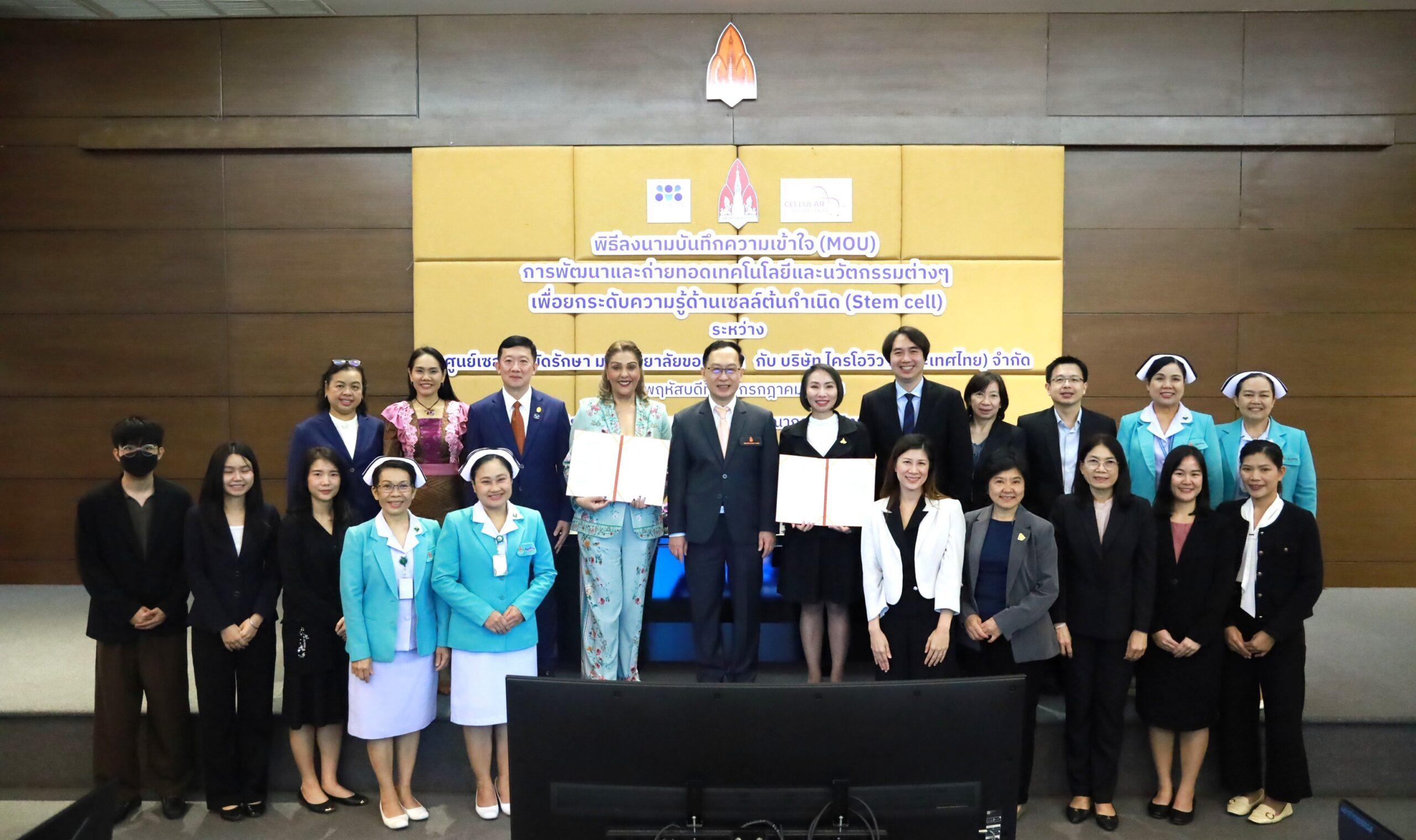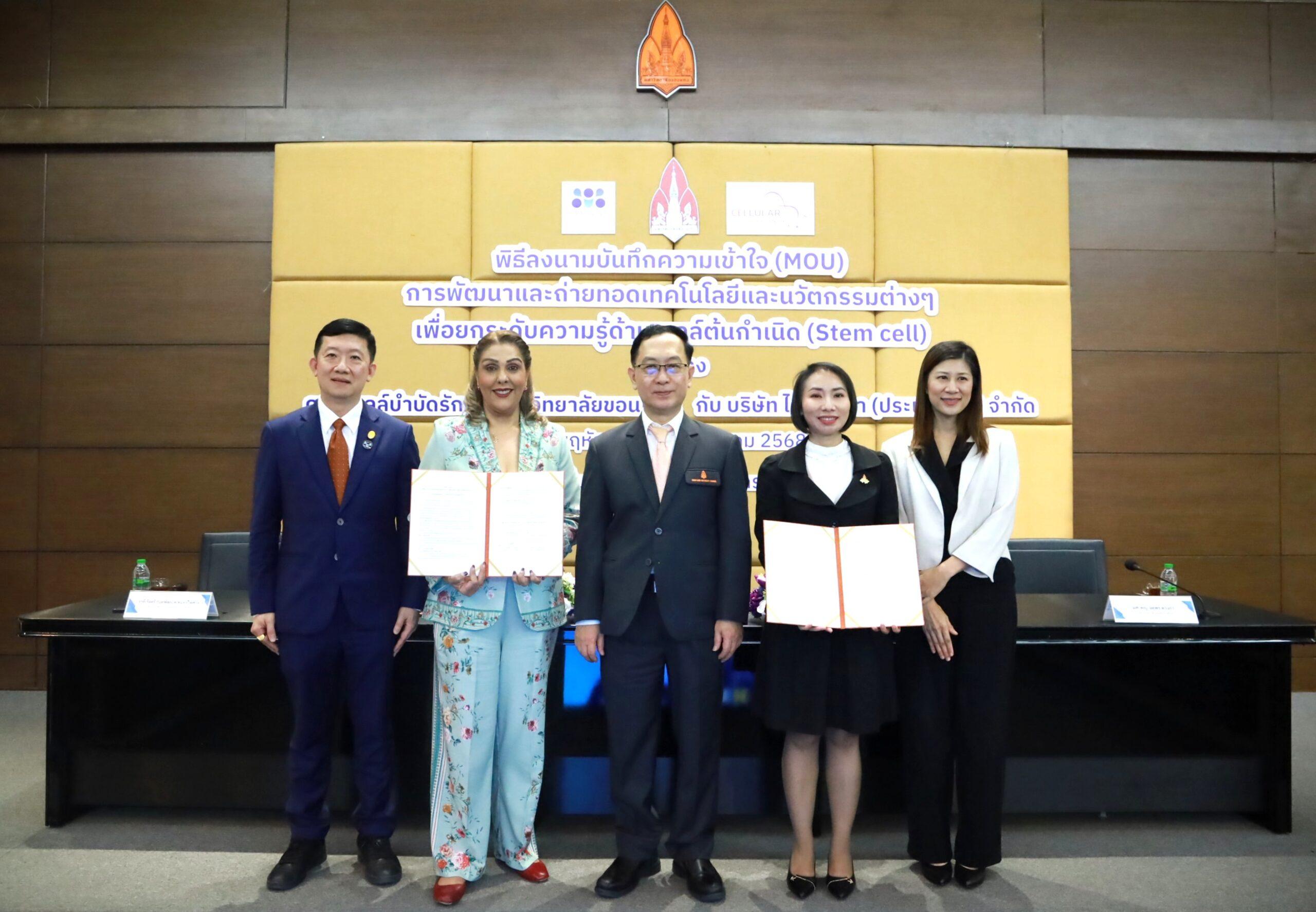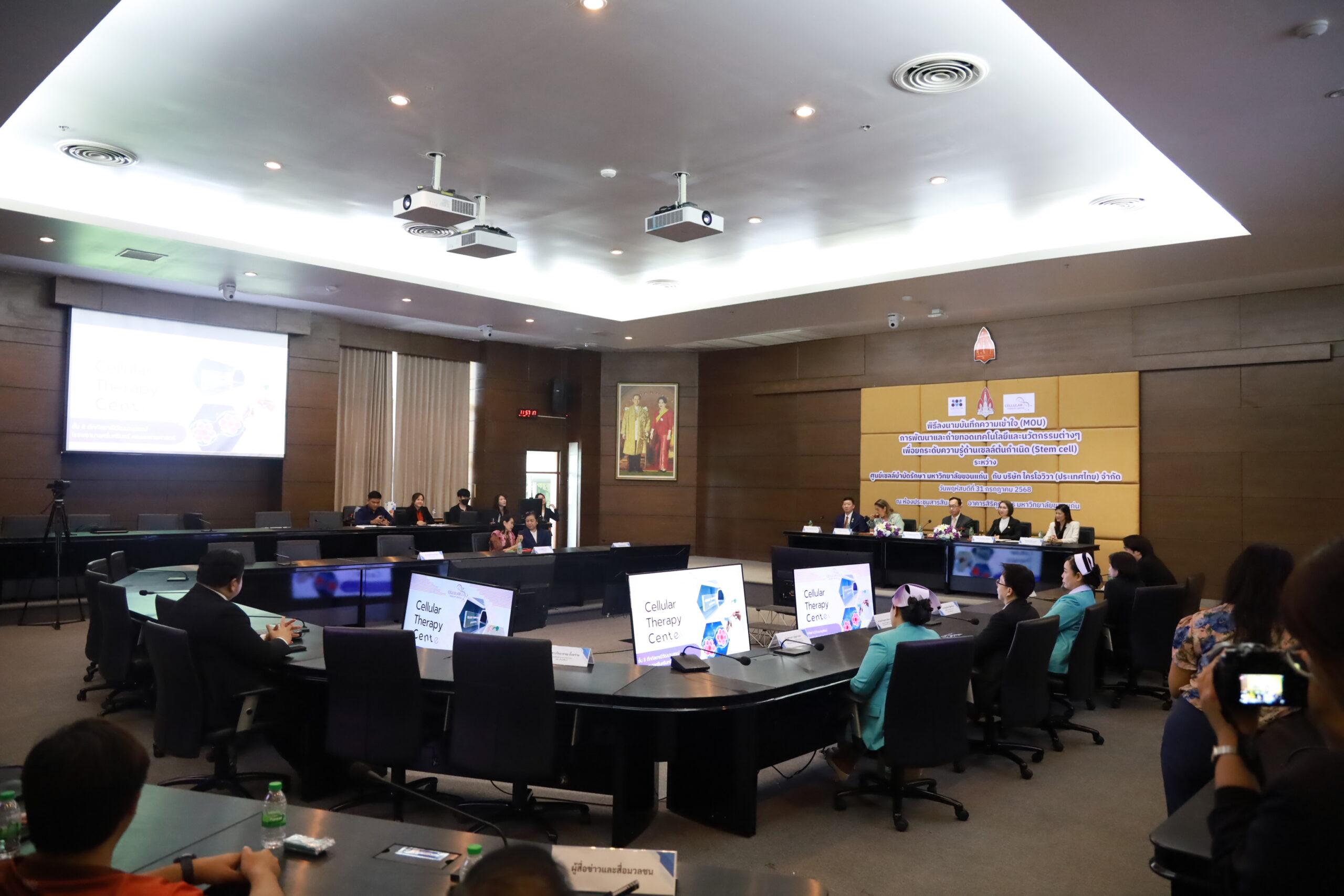 เมื่อวันที่ 31 กรกฎาคม 2568 ศูนย์เซลล์บำบัดรักษา มหาวิทยาลัยขอนแก่น ร่วมกับ บริษัท ไครโอวิวา (ประเทศไทย) จำกัด จัดพิธีลงนามบันทึกข้อตกลงความร่วมมือ (MOU) เพื่อการพัฒนาและถ่ายทอดเทคโนโลยีและนวัตกรรมด้านเซลล์ต้นกำเนิด โดยมี รศ.นพ.ชาญชัย พานทองวิริยะกุล อธิการบดีมหาวิทยาลัยขอนแก่น และ คุณจิรัญญา ประชาเสรี ประธานกรรมการบริหาร ภูมิภาคเอเชียตะวันออกเฉียงใต้ บริษัท ไครโอวิวา (ประเทศไทย) จำกัด พร้อมด้วย ผศ.ดร.แพทย์หญิง วิยะดา ปัญจรัก ผู้อำนวยการศูนย์เซลล์บำบัดรักษา และคณาจารย์จากสาขาวิชาที่เกี่ยวข้องเข้าร่วมพิธี ณ ห้องประชุมสารสิน ชั้น 2 อาคารสิริคุณากร มหาวิทยาลัยขอนแก่น