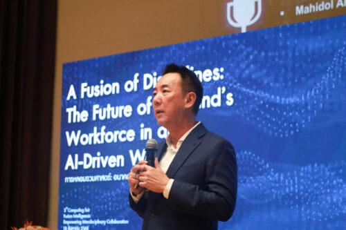 งานยังได้รับเกียรติจาก ดร.ปิยะวัฒน์ จริยเศรษฐพงศ์ หัวหน้าคณะผู้บริหารด้านการค้า บริษัท ไทยคม จำกัด (มหาชน) บรรยายหัวข้อ “A Fusion of Disciplines: The Future of Thailand’s Workforce in an AI-Driven World การหลอมรวมศาสตร์: อนาคตของแรงงานไทยในโลกที่ขับเคลื่อนด้วย AI” ที่แชร์ประสบการณ์จริงจากอุตสาหกรรมและแนวทางการพัฒนาทักษะแรงงานไทยให้พร้อมรับมือกับเทคโนโลยี AI