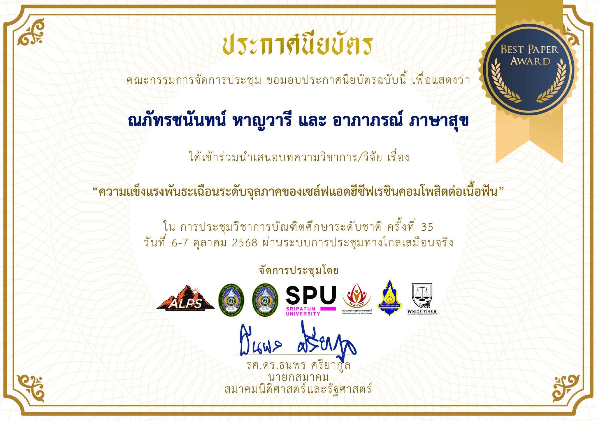 คณะทันตแพทยศาสตร์ มหาวิทยาลัยขอนแก่น ขอแสดงความยินดี ทพญ.ณภัทรชนันทน์ หาญวารี วท.ม. (ทันตแพทยศาสตร์) กลุ่มวิชาทันตกรรมบูรณะ และผู้ช่วยศาสตราจารย์ อาภาภรณ์ ภาษาสุข ได้รับรางวัล “Best Paper Award” จากการนำเสนอผลงานเรื่อง “ความแข็งแรงพันธะเฉือนระดับจุลภาคของเซลฟ์แอดฮีซีฟเรซินคอมโพสิตต่อเนื้อฟัน” ในการประชุมวิชาการบัณฑิตศึกษาระดับชาติ ครั้งที่ 35 จัดโดย สมาคมนิติศาสตร์และรัฐศาสตร์ ร่วมกับมหาวิทยาลัยราชภัฏวไลยอลงกรณ์ในพระบรมราชูปถัมภ์ ระหว่างวันที่ 6 – 7 ตุลาคม 2568 ในรูปแบบ ออนไลน์ คณะทันตแพทยศาสตร์ มหาวิทยาลัยขอนแก่น ขอแสดงความยินดีกับความสำเร็จในครั้งนี้ ซึ่งเป็นอีกหนึ่งความภาคภูมิใจ และสะท้อนถึงศักยภาพทางวิชาการของคณาจารย์และนักศึกษาคณะฯ ในการสร้างผลงานวิจัยที่มีคุณภาพและมีคุณค่าทางวิชาชีพทันตกรรม