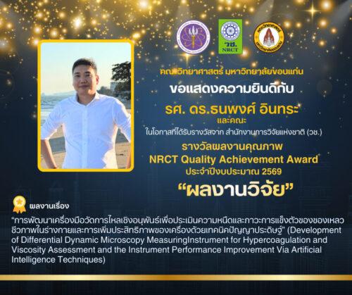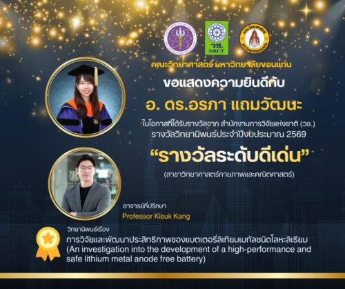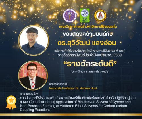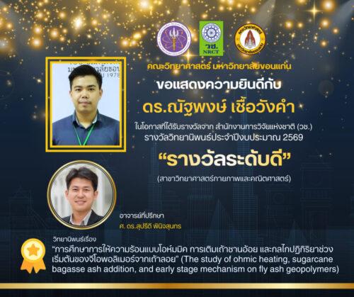 คณะวิทยาศาสตร์ มหาวิทยาลัยขอนแก่น ขอแสดงความยินดีกับบุคลากรและศิษย์เก่าของคณะฯ ที่คว้ารางวัลจากสำนักงานการวิจัยแห่งชาติ (วช.) ประจำปีงบประมาณ 2569 ดังนี้