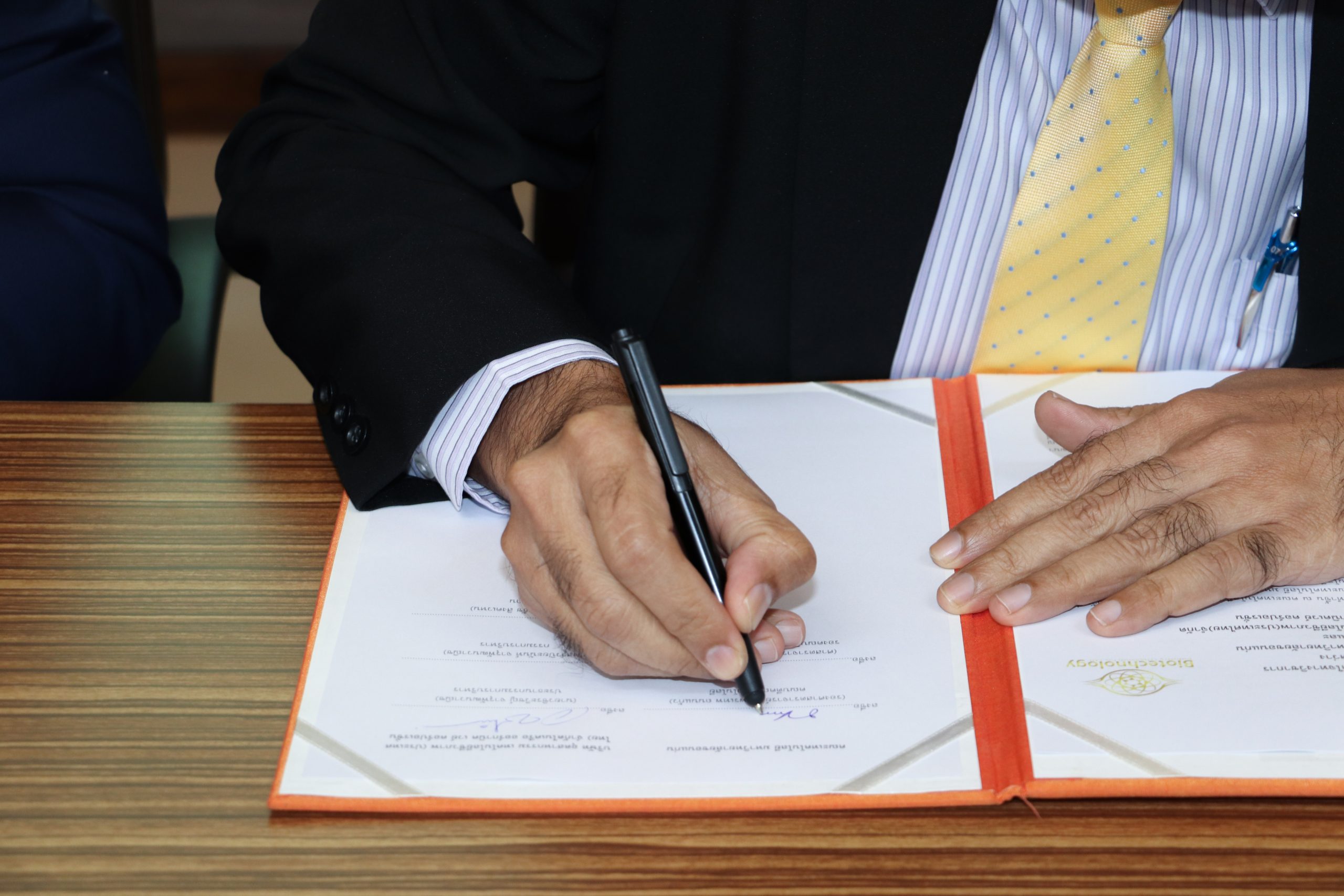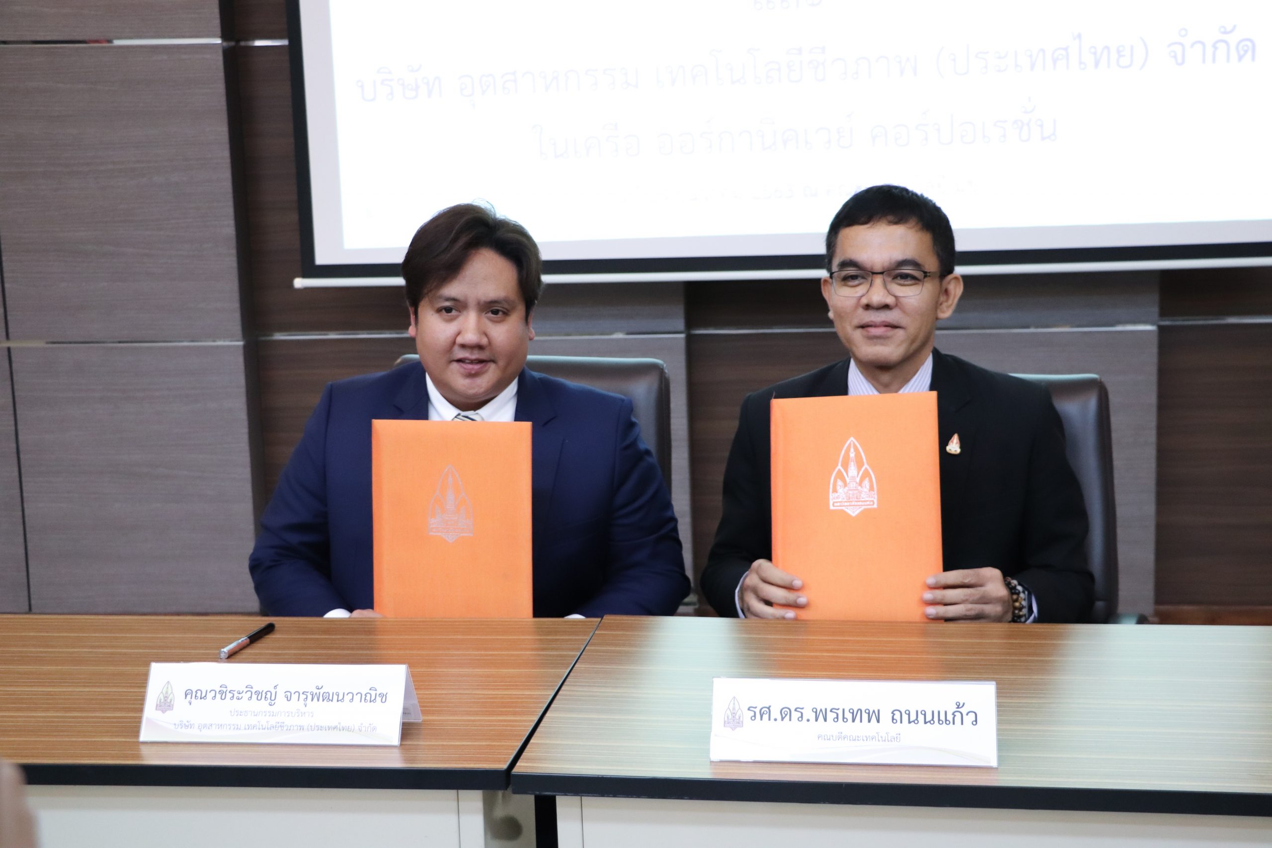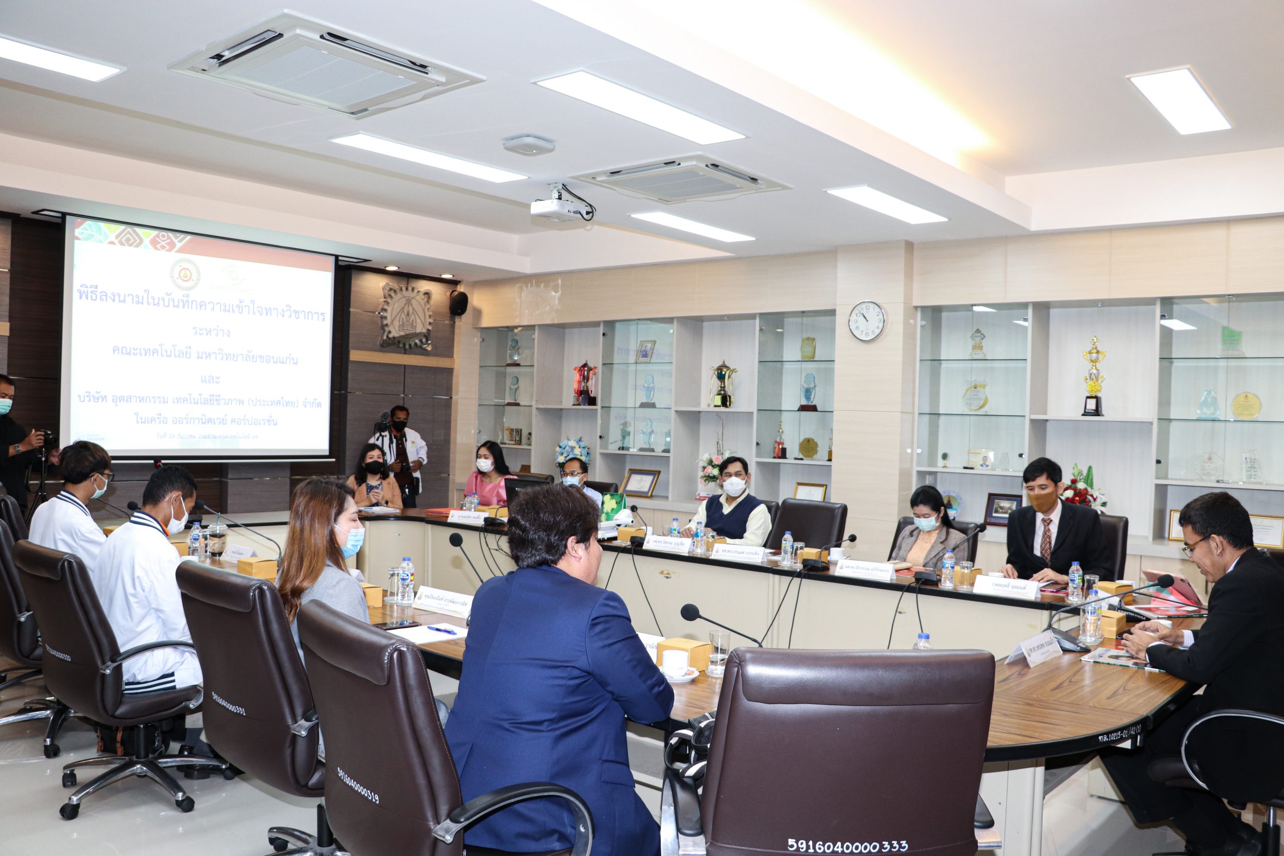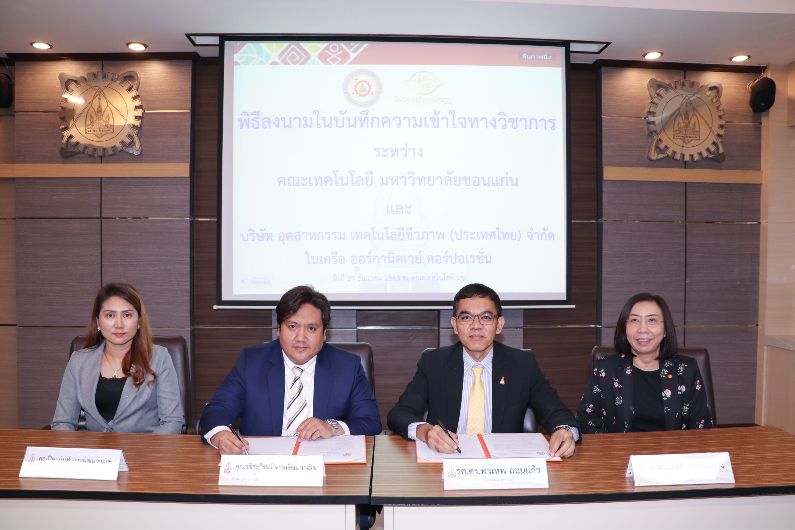 คณะเทคโนโลยี มหาวิทยาลัยขอนแก่น ได้จัดพิธีลงนามในบันทึกความเข้าใจทางวิชาการร่วมกับ บริษัท อุตสาหกรรม เทคโนโลยีชีวภาพ (ประเทศไทย) จำกัด เมื่อวันที่ 24 ธันวาคม 2563 ณ ห้องประชุมคณะเทคโนโลยี อาคาร TE06 ในการนี้ รศ.ดร.พรเทพ ถนนแก้ว คณบดีคณะเทคโนโลยี ได้ลงนามในบันทึกความเข้าใจทางวิชาการร่วมกับ คุณวชิระวิชญ์ จารุพัฒนวาณิช ประธานกรรมการบริหาร บริษัท อุตสาหกรรม เทคโนโลยีชีวภาพ (ประเทศไทย) จำกัด และประธานกลุ่ม Organic Way Corporation พร้อมด้วย ศ.ดร.อลิศรา เรืองแสง รองคณบดีฝ่ายวิจัยและบริการวิชาการ คณะเทคโนโลยี นางสาวปิยะนันท์ จารุพัฒนวาณิช กรรมการบริหาร และนายตฤณธัช สิงคเวหน ผู้บริหารจากบริษัท บริษัท อุตสาหกรรม เทคโนโลยีชีวภาพ (ประเทศไทย) จำกัด ร่วมเป็นพยานในการลงนามครั้งนี้ และมีคณะผู้บริหารคณะเทคโนโลยี และนักวิจัยจากมหาวิทยาลัยขอนแก่นที่ได้เข้าพบปะพูดคุยและหารือแลกเปลี่ยนแนวทางการวิจัยเพื่อพัฒนาผลงานร่วมกับทางบริษัทประกอบด้วย ผศ.พลฤทธิ์ จุลมนต์ รองคณบดีฝ่ายยุทธศาสตร์ด้านบุคคลและสื่อสารองค์กร ผศ.ดร.จิรวรรณ อภิรักษากร หัวหน้าสาขาวิชาเทคโนโลยีชีวภาพ และรศ.ดร.โสภณ บุญลือ หัวหน้าสาขาวิชาจุลชีววิทยา คณะวิทยาศาสตร์ สำหรับเจตนารมณ์ในการสร้างความร่วมมือทางวิชาการนี้ มีวัตถุประสงค์เพื่อการสร้างความร่วมมือทางวิชาการในด้านการวิจัยและนวัตกรรม การพัฒนาผลิตภัณฑ์และปัจจัยการผลิตในภาคอุตสาหกรรมเกษตร พร้อมทั้งส่งเสริมความร่วมมือในการผลิตบัณฑิต คณะเทคโนโลยีให้มีความรู้และประสบการณ์ด้านอุตสาหกรรมเทคโนโลยีชีวภาพ ผ่านกิจกรรมการฝึกงาน ดูงาน หรือปฏิบัติสหกิจศึกษา