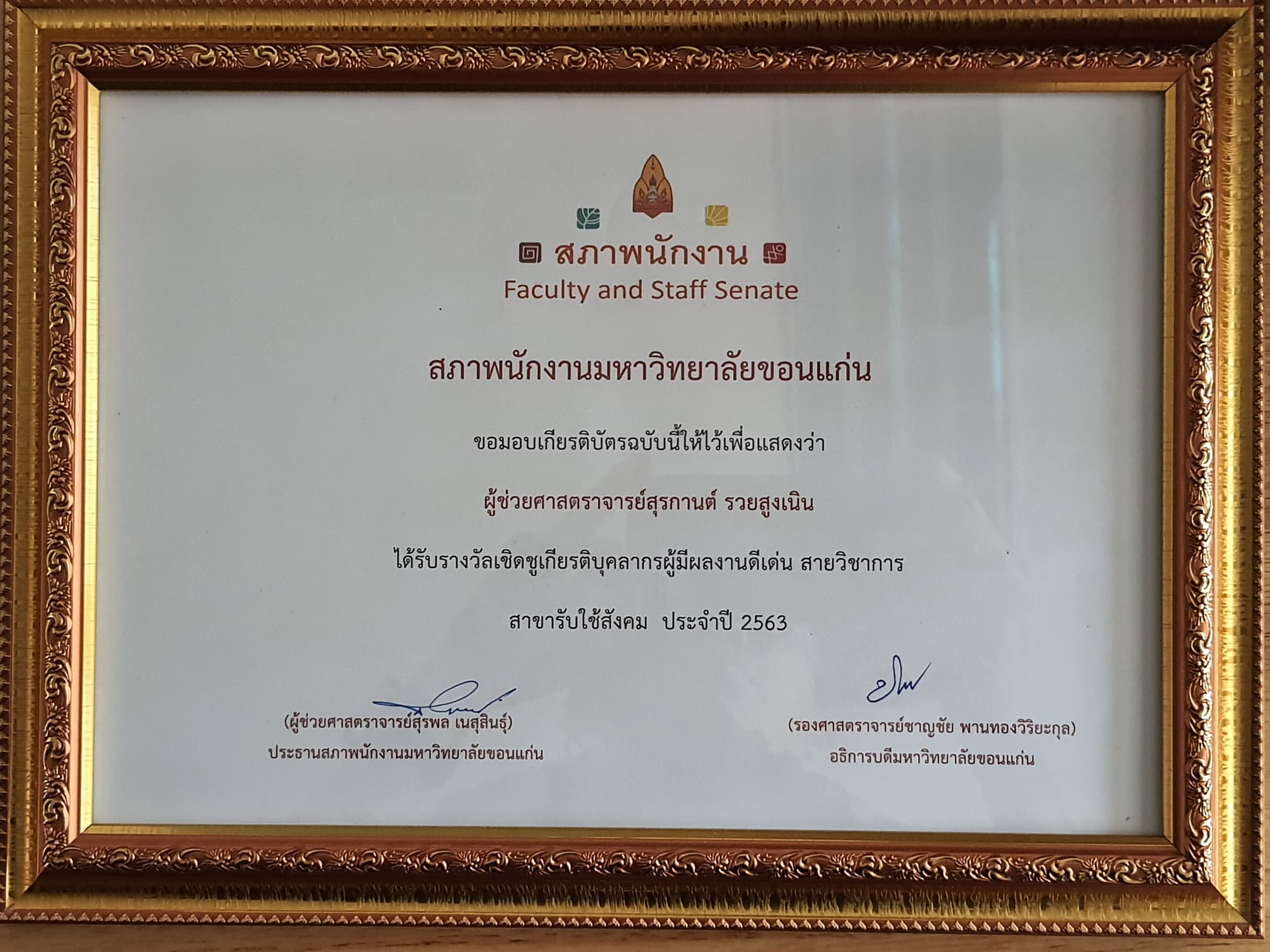 คณะสถาปัตยกรรมศาสตร์ มหาวิทยาลัยขอนแก่น ขอแสดงความยินดีกับ ผศ.ดร.สุรกานต์ รวยสูงเนิน ที่ได้รับรางวัลบุคลากรสายวิชาการดีเด่น สาขา สาขารับใช้สังคม ประจำปี 2563  โดยมีอธิการบดีมหาวิทยาลัยขอนแก่น รศ.นพ.ชาญชัย พานทองวิริยะกุล เป็นผู้มอบรางวัล เมื่อวันอังคารที่ 28 มกราคม 2563 เวลา 10.45-12.00 น. ณ ห้องประชุมสารสิน อาคารแก่นกัลปพฤกษ์ มหาวิทยาลัยขอนแก่น จัดโดยสภาพนักงานมหาวิทยาลัยขอนแก่น