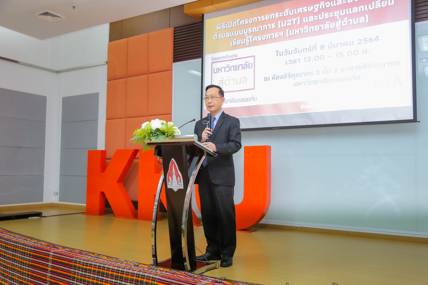 เมื่อวันที่ 8 มีนาคม 2564 เวลา 13.30 น. มหาวิทยาลัยขอนแก่น จัดพิธี เปิดโครงการยกระดับเศรษฐกิจและสังคมรายตำบลแบบบูรณาการมหาวิทยาลัยขอนแก่น (U2T) พร้อมทั้งประชุมแลกเปลี่ยนเรียนรู้โครงการยกระดับเศรษฐกิจและสังคมรายตำบล โดยมีรองศาสตราจารย์ชาญชัย พานทองวิริยะกุล อธิการบดีมหาวิทยาลัยขอนแก่น กล่าวเปิดงาน โดยมี ศ.ดร.ธิดารัตน์ บุญมาศ รองอธิการบดีฝ่ายนวัตกรรมและวิสาหกิจ กล่าวรายงาน โดยได้รับเกียรติจากนายสมศักดิ์ จังตระกุล ผู้ว่าราชการจังหวัดขอนแก่น กล่าวสนับสนุนโครงการฯ นอกจากนี้ยังมีคณะกรรมการสภามหาวิทยาลัยขอนแก่น รองอธิการบดี ผู้ช่วยอธิการบดี คณบดี คณาจารย์ เจ้าหน้าที่โครงการ ร่วมงานกว่า 100 คน ณ ห้องประชุมสิริคุณากร 3 ชั้น 2 อาคารสิริคุณากร