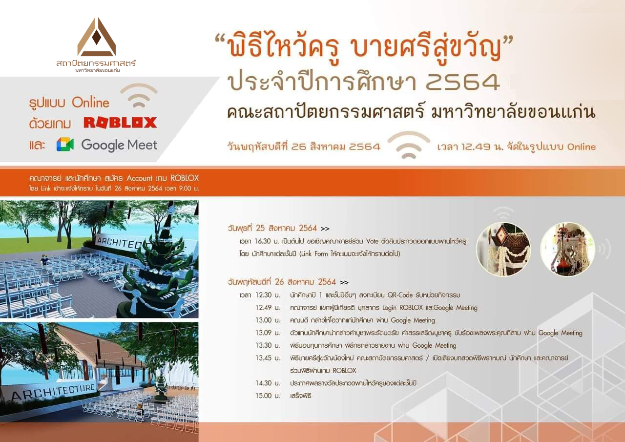 คณะสถาปัตยกรรมศาสตร์ มหาวิทยาลัยขอนแก่น จัดงานพิธีไหว้ครู บายศรีสู่ขวัญ ประจำปีการศึกษา 2564 ในวันพฤหัสบดีที่ 26 สิงหาคม 2564 เวลา 12.49 น. ครั้งแรกของการจัดงานไหว้ครูแบบออนไลน์ โดยมีการใช้เกมส์ ROBLOX จัดทำเป็นฉากพิธีไหว้ครู บายศรีสู่ขวัญ แบบโลกเสมือน ซึ่งใช้ร่วมกับโปรแกรม Google Meeting ในการดำเนินกิจกรรม กล่าวอวยพรโดยคณบดีและคณาจารย์ สวดมนต์ ร้องเพลงพระคุณที่สาม , มอบทุนการศึกษา , และพิธีบายศรีสู่ขวัญน้องใหม่โดยพ่อพราหมณ์ อีกทั้งยังมีประกาศผลการประกวดออกแบบพานอีกด้วย ซึ่งกิจกรรมที่เกิดขึ้นในครั้งนี้เพื่อให้นักศึกษาได้แสดงถึงความเคารพนอบน้อมและระลึกถึงพระบุญคุณของครูอาจารย์ ปั ญญาและวิชาความรู้ และเพื่อสร้างความสัมพันธ์ที่ดีระหว่างครูอาจารย์กับลูกศิษย์ ในรูปแบบ New Normal ในรูปแบบ AFH (Activities from Home) Online
