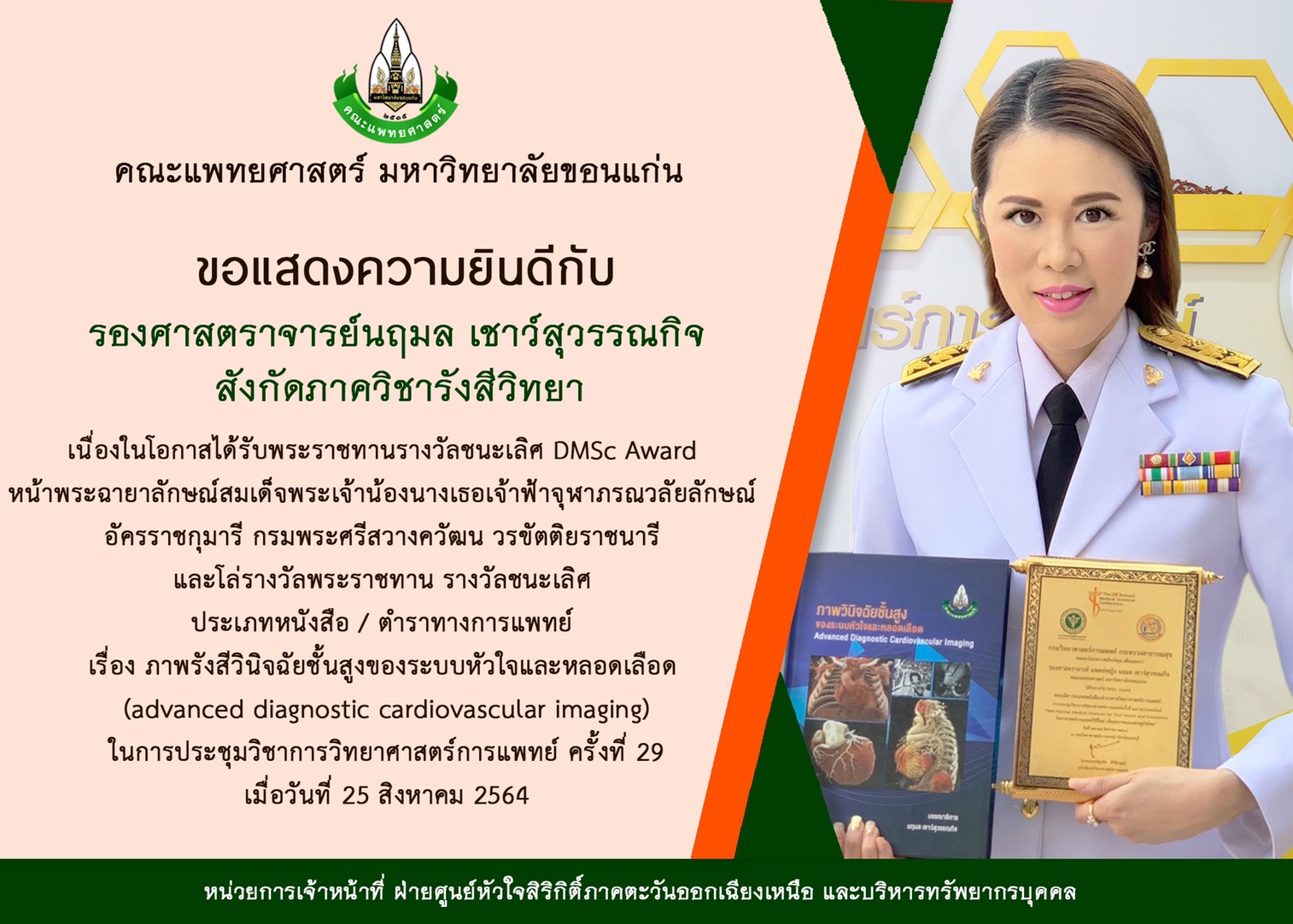 รศ.พญ. นฤมล เชาว์สุวรรณกิจ รับรางวัลชนะเลิศ DMSc Award และโล่รางวัลพระราชทานจากสมเด็จพระเจ้าน้องนางเธอ เจ้าฟ้าจุฬาภรณวลัยลักษณ์ อัครราชกุมารี กรมพระศรีสวางควัฒน วรขัตติยราชนารี ประเภท หนังสือ/ตำราทางการแพทย์ เรื่อง ภาพรังสีวินิจฉัยชั้นสูงของระบบหัวใจและหลอดเลือด (advanced diagnostic cardiovascular imaging) ในการประชุมวิชาการวิทยาศาสตร์การแพทย์ ประจำปี 2564 ครั้งที่ 29 “วิทยาศาสตร์การแพทย์วิถีใหม่ เพื่อสุขภาพและเศรษฐกิจไทย” จัดโดยกรมวิทยาศาสตร์การแพทย์และมูลนิธิกรมวิทยาศาสตร์การแพทย์