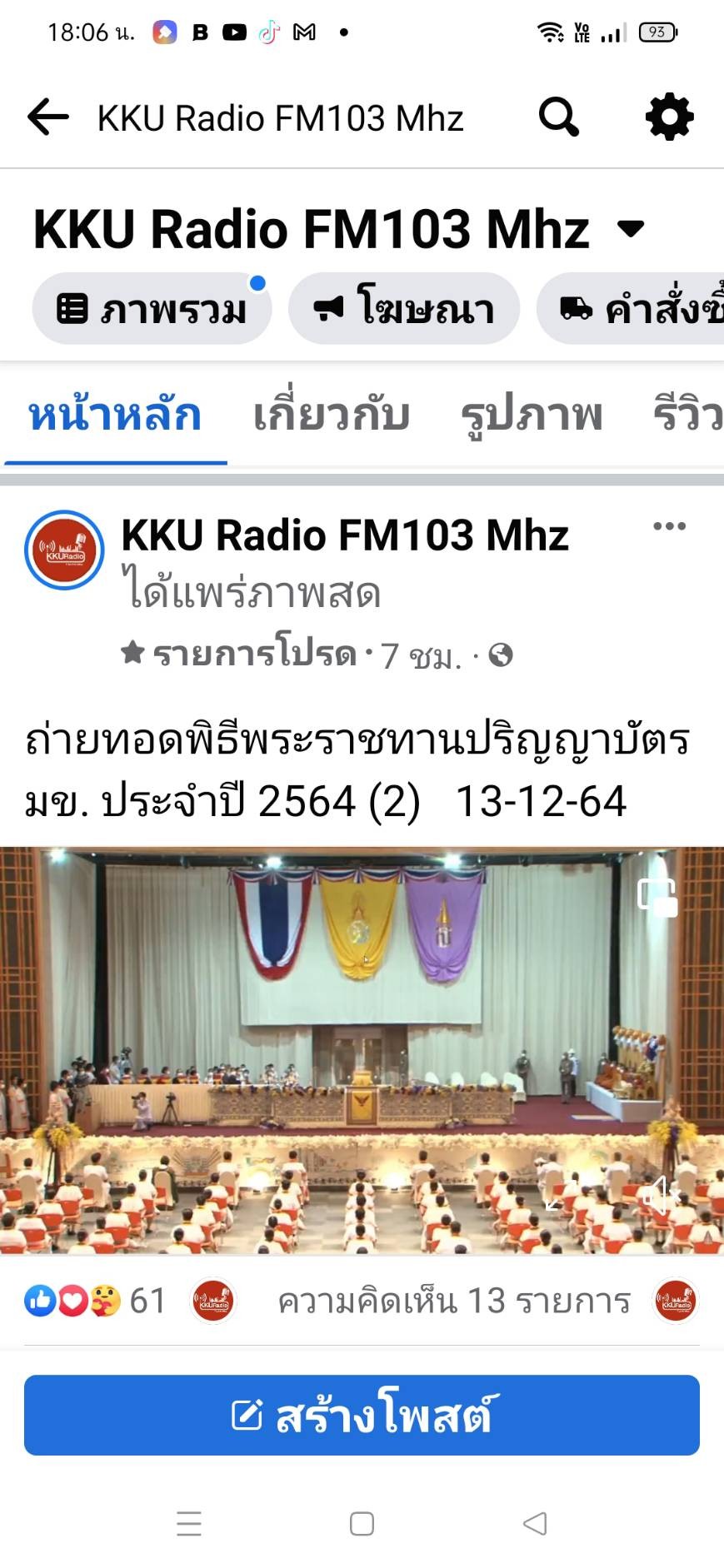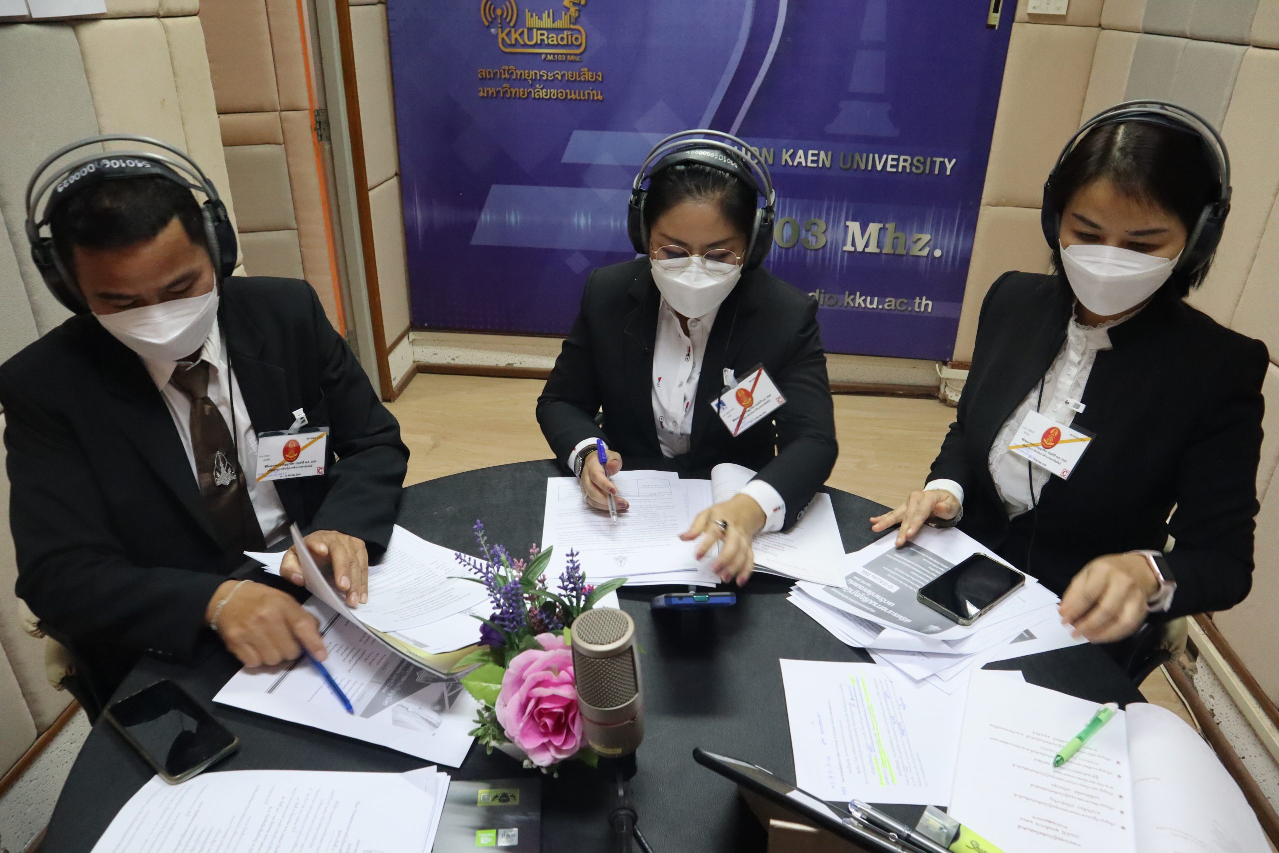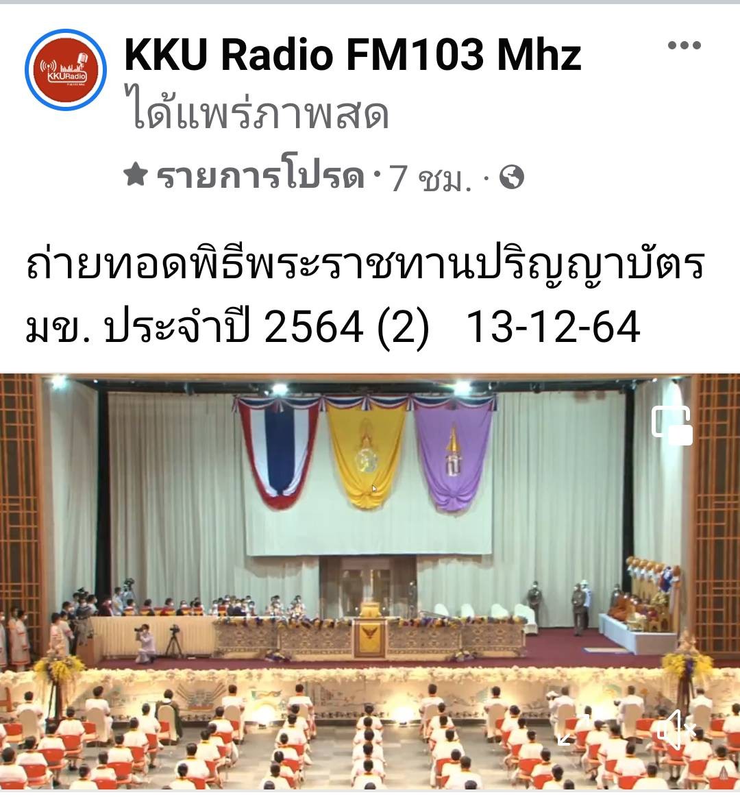 วันอาทิตย์ ที่ 12 ธันวาคม และวันจันทร์ที่ 13 ธันวาคม พ.ศ. 2564 ที่ผ่านมา สถานีวิทยุกระจายเสียงแห่งมหาวิทยาลัยขอนแก่น F.M.103 MHz. ได้ทำการถ่ายทอดสัญญาณเสียงพิธีพระราชทานปริญญาบัตร มหาวิทยาลัยขอนแก่น ประจำปี 2564 ผ่านทางคลื่นความถี่ F.M.103 MHz. รวมถึงช่องทางวิทยุออนไลน์ radio.kku.ac.th Tunein และ Facebook Live ที่ Fanpage KKU Radio F.M. 103 MHz. โดยมี นางเบญจมาภรณ์ มามุข นักประชาสัมพันธ์ ชำนาญการ หัวหน้างานผลิตสื่อ เป็นผู้ควบคุมการดำเนินงาน และทำหน้าที่เป็นผู้บรรยาย ร่วมกับ นางสาว ชุตินันท์ พันธ์จรุง นักประชาสัมพันธ์ ชำนาญการ และ นาย บรรจง เศษวิสัย พนักงานวิทยุ ภายใต้การควบคุมดูแลออกอากาศโดย นาย กิตติภณ ทุริวงษ์ เจ้าหน้าที่เทคนิค และ นาย ปาพจน์ พันตาเอก นักวิชาการโสตทัศนศึกษา โดยเฉพาะปีนี้เข้าสู่ปีที่ 20 สำหรับบทบาทหน้าที่ในการเผยแพร่ข่าวสารและบรรยากาศพิธีพระราชทานปริญญาบัตร ของสถานีวิทยุกระจายเสียงมหาวิทยาลัยขอนแก่น หลังได้ทำการถ่ายทอดสัญญาณเสียงมาอย่างยาวนาน ตั้งแต่ปี พ.ศ. 2544