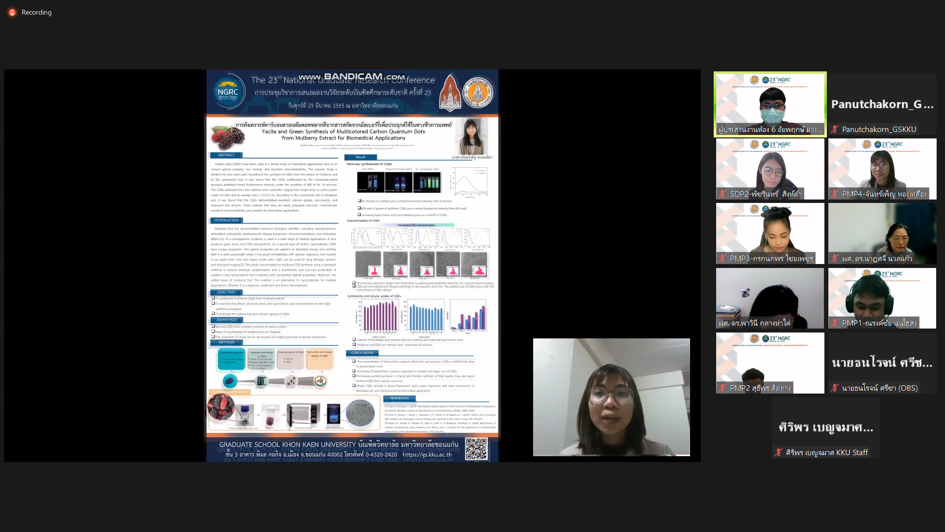 หลังจากนั้นเป็นการนำเสนอผลงานวิจัยแบบออนไลน์ โดยแบ่งเป็น การนำเสนอผลงานวิจัยแบบบรรยาย และแบบโปสเตอร์ กลุ่มวิทยาศาสตร์และเทคโนโลยี กลุ่มวิทยาศาสตร์สุขภาพ กลุ่มวิทยาศาสตร์กายภาพ กลุ่มมนุษยศาสตร์และสังคมศาสตร์ กลุ่มวิทยาศาสตร์ชีวภาพ จำนวน 71 เรื่อง และในภาคบ่ายนางดิลกรัตน์ โคตรสุมาตย์ ผู้อำนวยการกองบริหารงานบัณฑิตวิทยาลัย แนะนำหลักสูตร และบริการด้านบัณฑิตศึกษา หลังจากนั้นรประกาศผลรางวัลการนำเสนอผลงานวิจัยระดับบัณฑิตศึกษาระดับชาติ ครั้งที่ 23 ระดับดีเด่น และดี ดูผลรางวัลได้ที่ https://conference.kku.ac.th/grc/