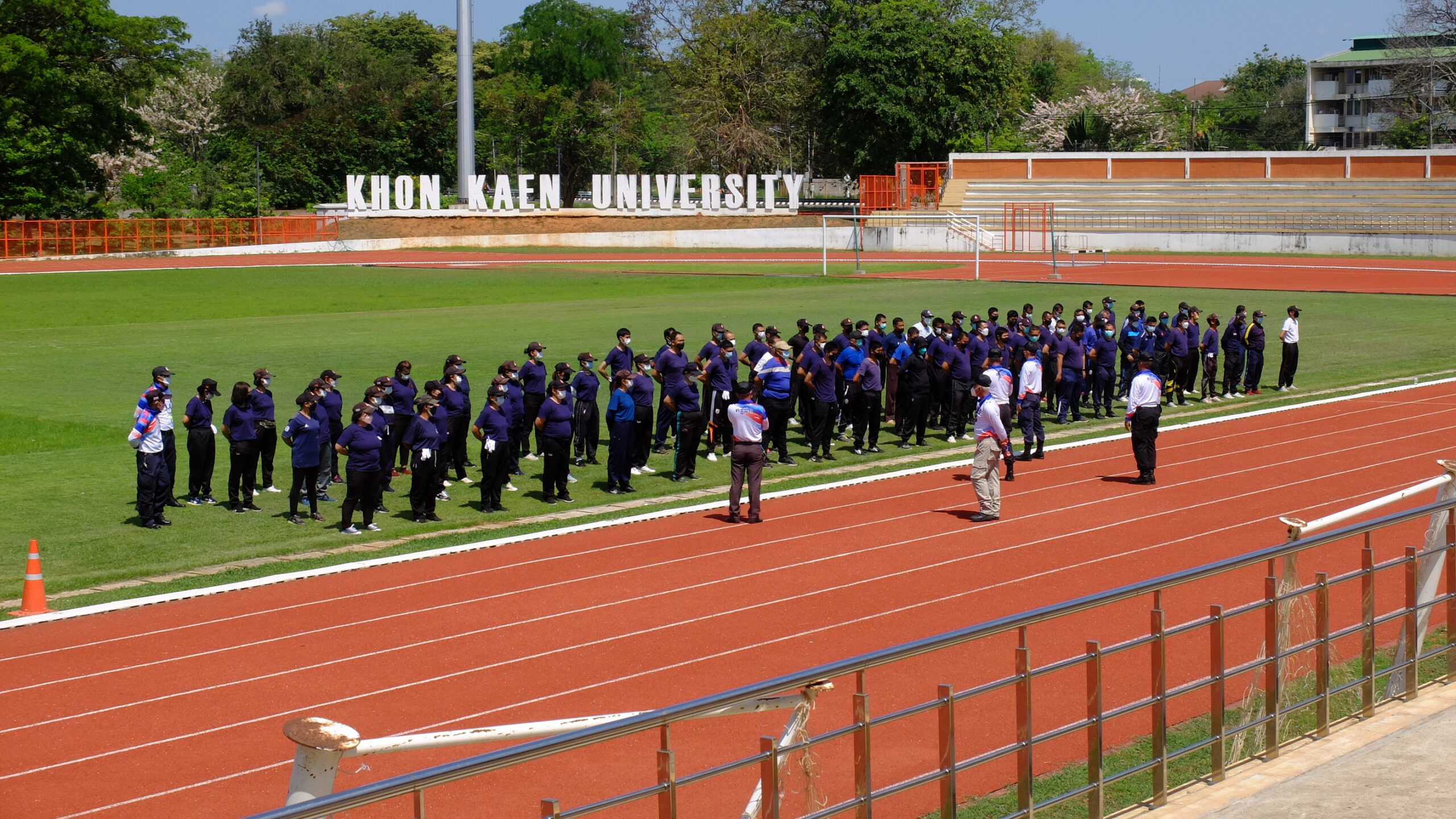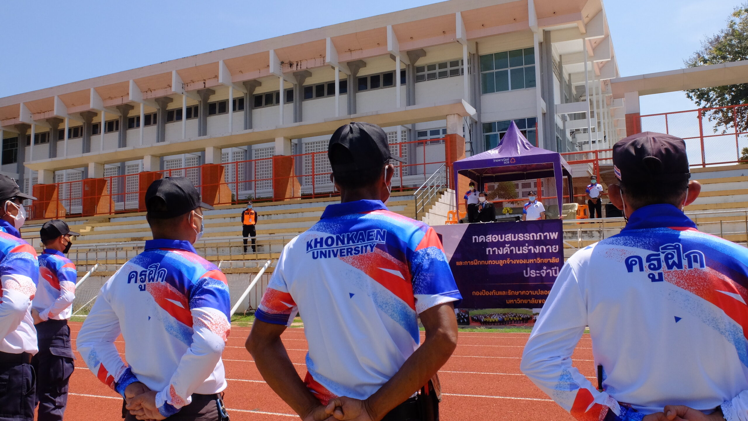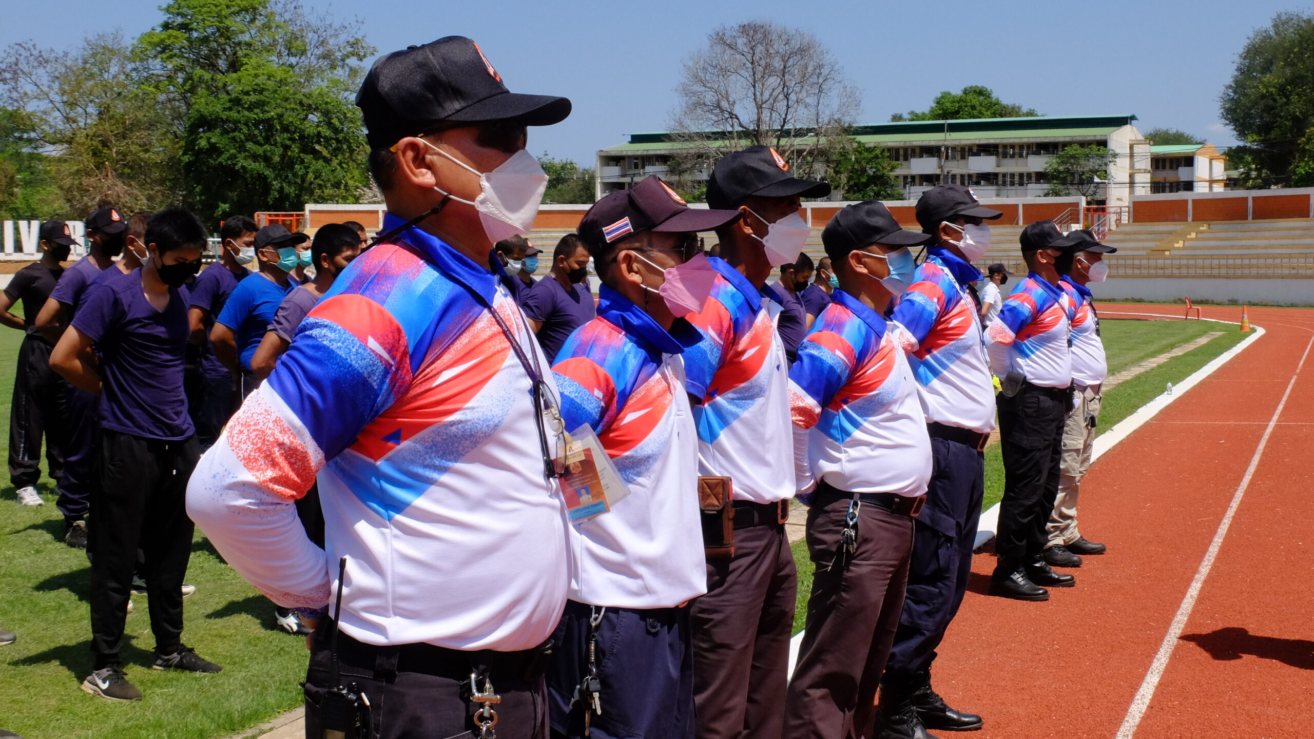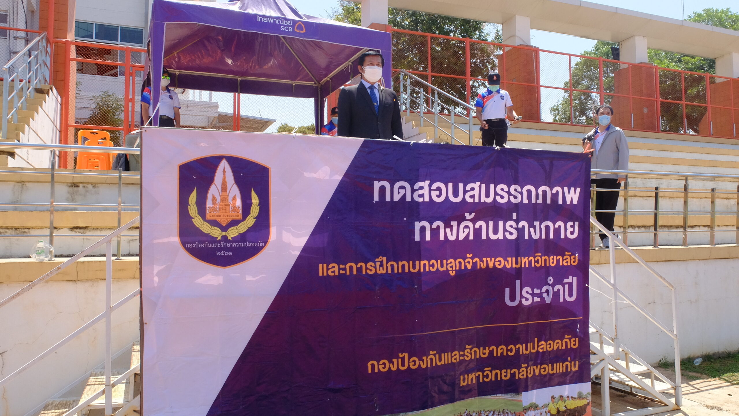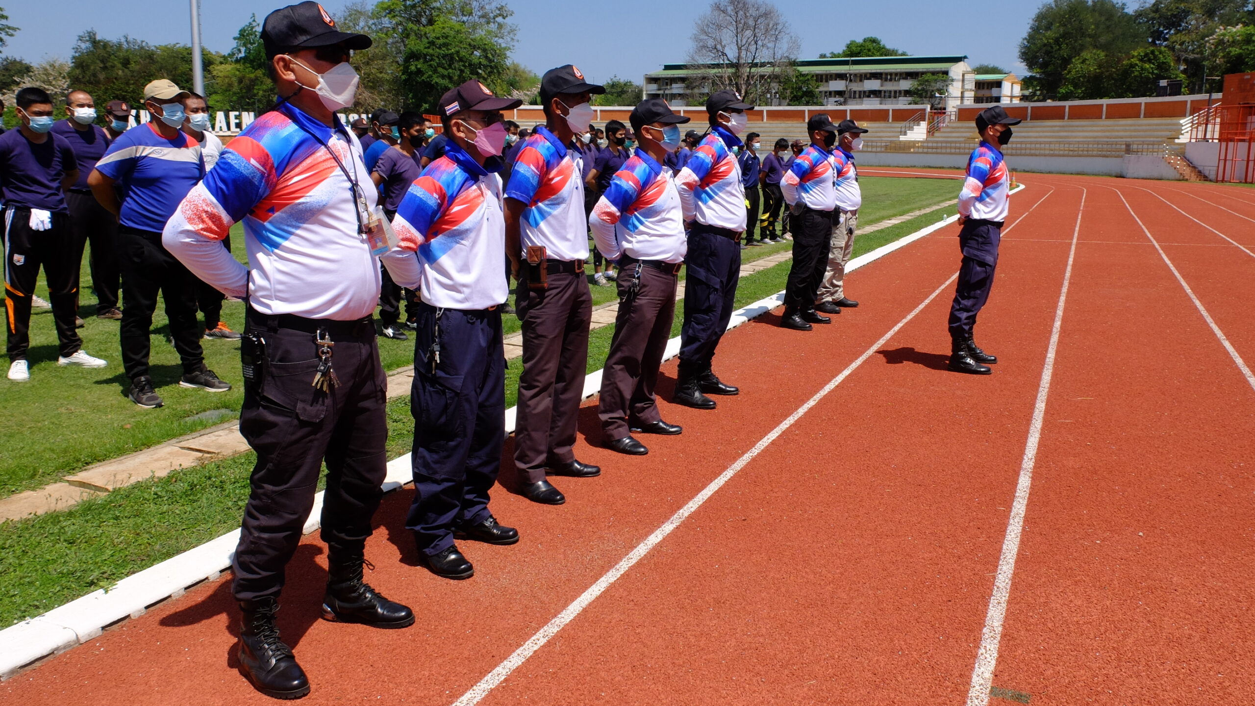 วันที่ 31 มีนาคม 2565 เวลา 08.00-12.00 น. ณ สนามกีฬา 50 ปี มหาวิทยาลัยขอนแก่น กองป้องกันและรักษาความปลอดภัย มหาวิทยาลัยขอนแก่น ได้จัดโครงการฝึกทบทวนทักษะการปฏิบัติงาน และทดสอบสมรรถภาพทางด้านร่างกาย (รอบที่ 1) ประจำปีงบประมาณ 2565 ให้แก่เจ้าหน้าที่ผู้ปฏิบัติงาน ตำแหน่งเจ้าหน้าที่รักษาความปลอดภัยชายและหญิงรวม 135 คน โดยมี ผศ. ดร.สมพงษ์ สิทธิพรหม ผู้ช่วยอธิการบดีฝ่ายรักษาความปลอดภัย ให้เกียรติเป็นประธานกล่าวให้โอวาทและกล่าวเปิดโครงการ พร้อมด้วย คุณ นายเกษม ภูธรรมะ รักษาการแทนผู้อำนวยการกองป้องกันและรักษาความปลอดภัย หัวหน้างานภายในสังกัด ครูฝึก และเจ้าหน้าที่ร่วมในกิจกรรมเป็นจำนวนมาก